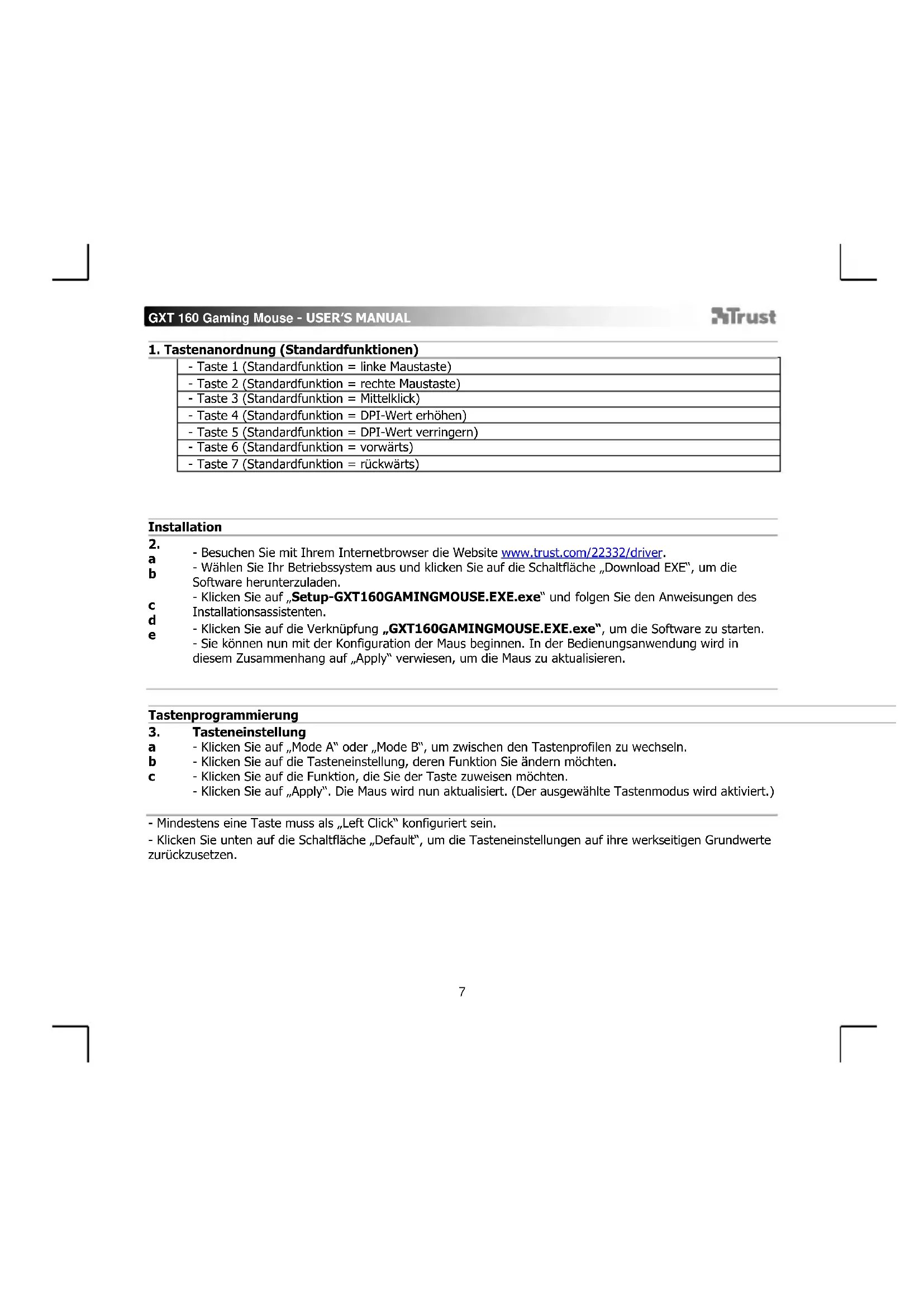 - Besuchen Sie mit Ihrem Internetbrowser die Website www.trust.com/22332/driver. - Wählen Sie Ihr Betriebssystem aus und klicken Sie auf die Schaltfläche „Download EXE“, um die Software herunterzuladen. - Klicken Sie auf „Setup-GXT160GAMINGMOUSE.EXE.exe“ und folgen Sie den Anweisungen des Installationsassistenten. - Klicken Sie auf die Verknüpfung „GXT160GAMINGMOUSE.EXE.exe“, um die Software zu starten. - Sie können nun mit der Konfiguration der Maus beginnen. In der Bedienungsanwendung wird in diesem Zusammenhang auf „Apply“ verwiesen, um die Maus zu aktualisieren.