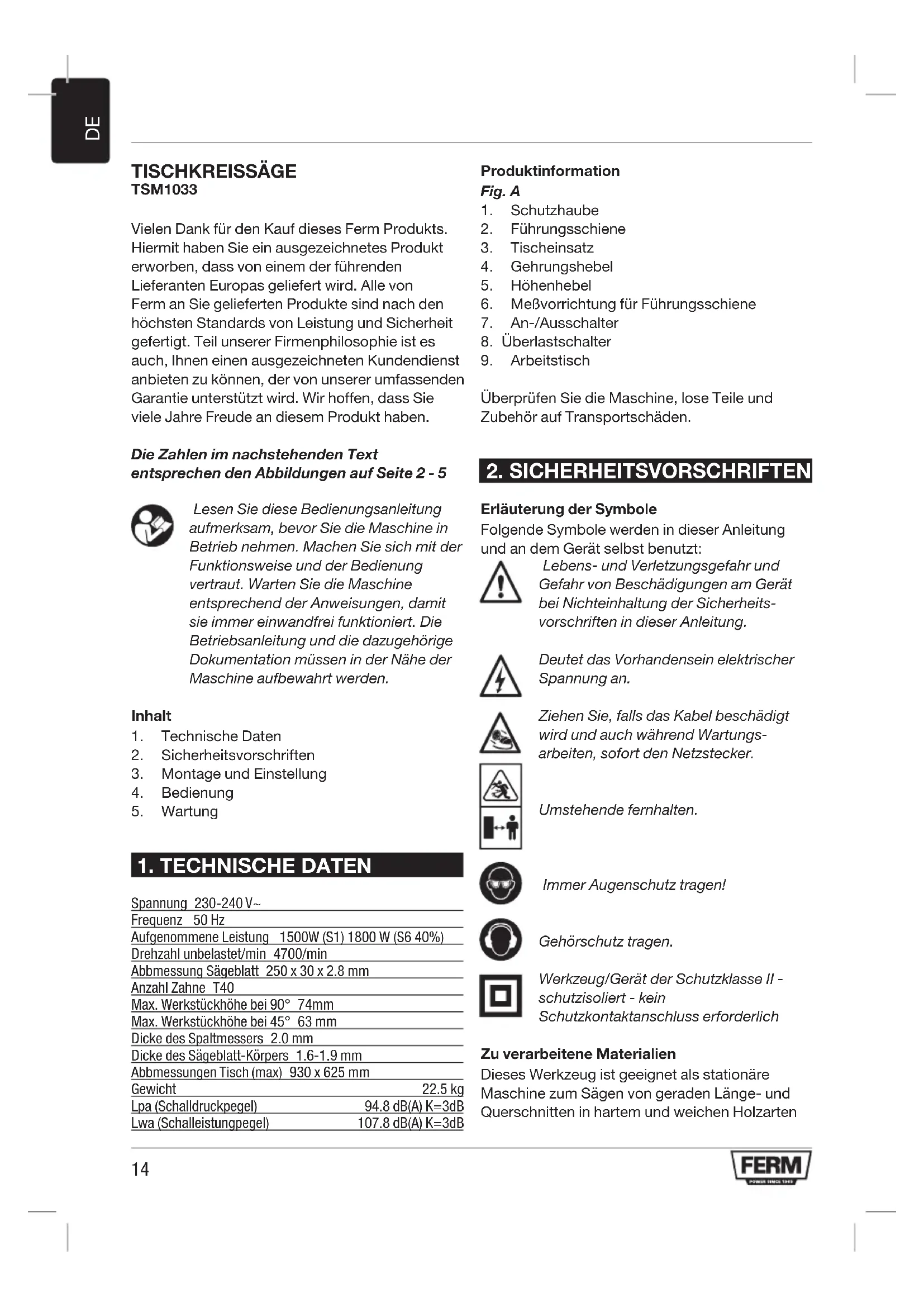 TISCHKREISSÄGE TSM1033 Vielen Dank für den Kauf dieses Ferm Produkts. Hiermit haben Sie ein ausgezeichnetes Produkt erworben, dass von einem der führenden Lieferanten Europas geliefert wird. Alle von Ferm an Sie gelieferten Produkte sind nach den höchsten Standards von Leistung und Sicherheit gefertigt. Teil unserer Firmenphilosophie ist es auch, Ihnen einen ausgezeichneten Kundendienst anbieten zu können, der von unserer umfassenden Garantie unterstützt wird. Wir hoffen, dass Sie viele Jahre Freude an diesem Produkt haben. Die Zahlen im nachstehenden Text entsprechen den Abbildungen auf Seite 2 - 5 Lesen Sie diese Bedienungsanleitung aufmerksam, bevor Sie die Maschine in Betrieb nehmen. Machen Sie sich mit der Funktionsweise und der Bedienung vertraut. Warten Sie die Maschine entsprechend der Anweisungen, damit sie immer einwandfrei funktioniert. Die Betriebsanleitung und die dazugehörige Dokumentation müssen in der Nähe der Maschine aufbewahrt werden. Inhalt