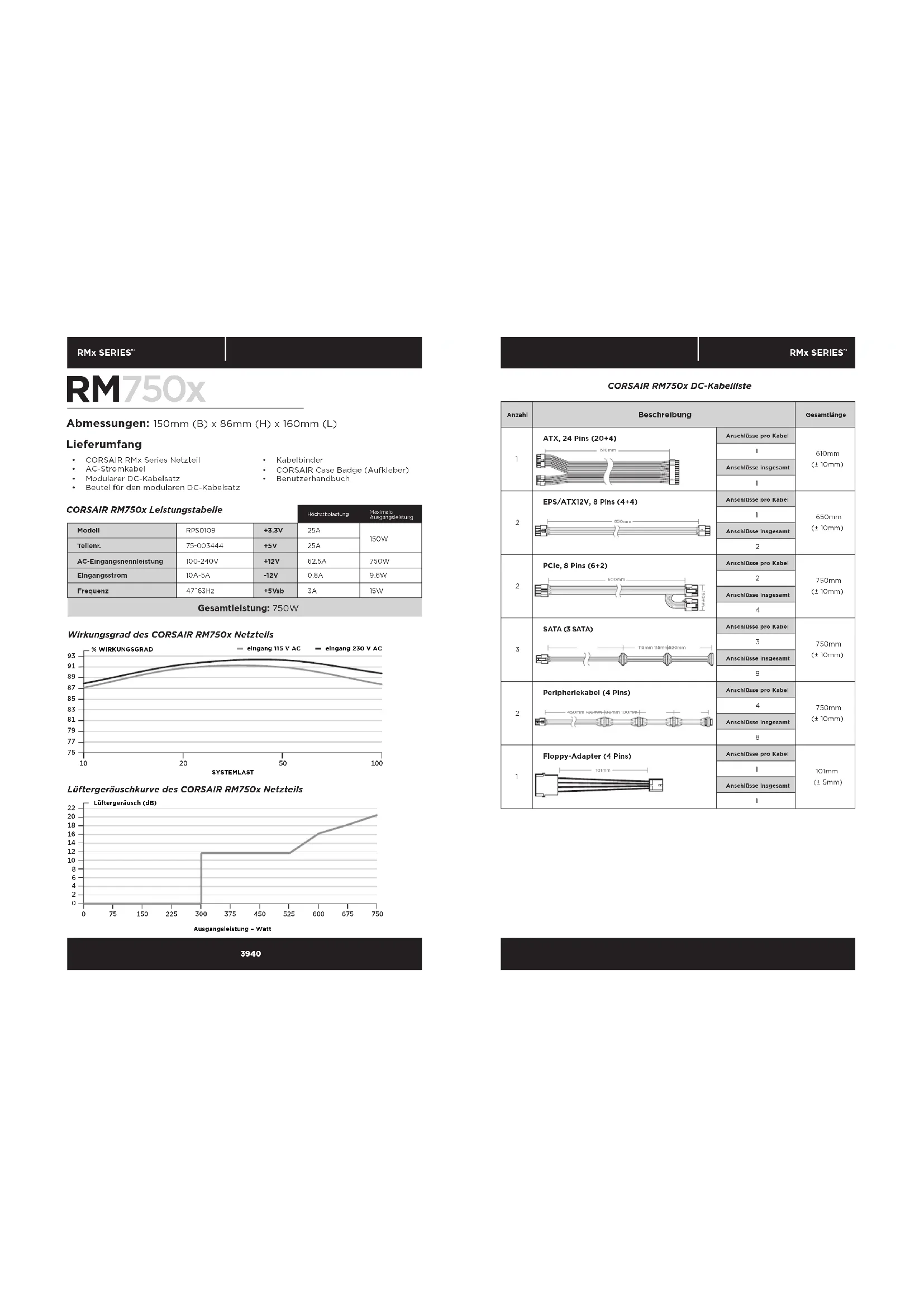 - CORSAIR RMx Series Netzteil• AC-Stromkabel• Modularer DC-Kabelsatz• Beutel für den modularen DC-Kabelsatz• Kabelbinder• CORSAIR Case Badge (Aufkleber)• Benutzerhandbuch% WIRKUNGSGRADSYSTEMLASTLüftergeräusch (dB)Ausgangsleistung – Watt CORSAIR RM750x Leistungstabelle eingang 115 V AC eingang 230 V AC41 42 RMx SERIES