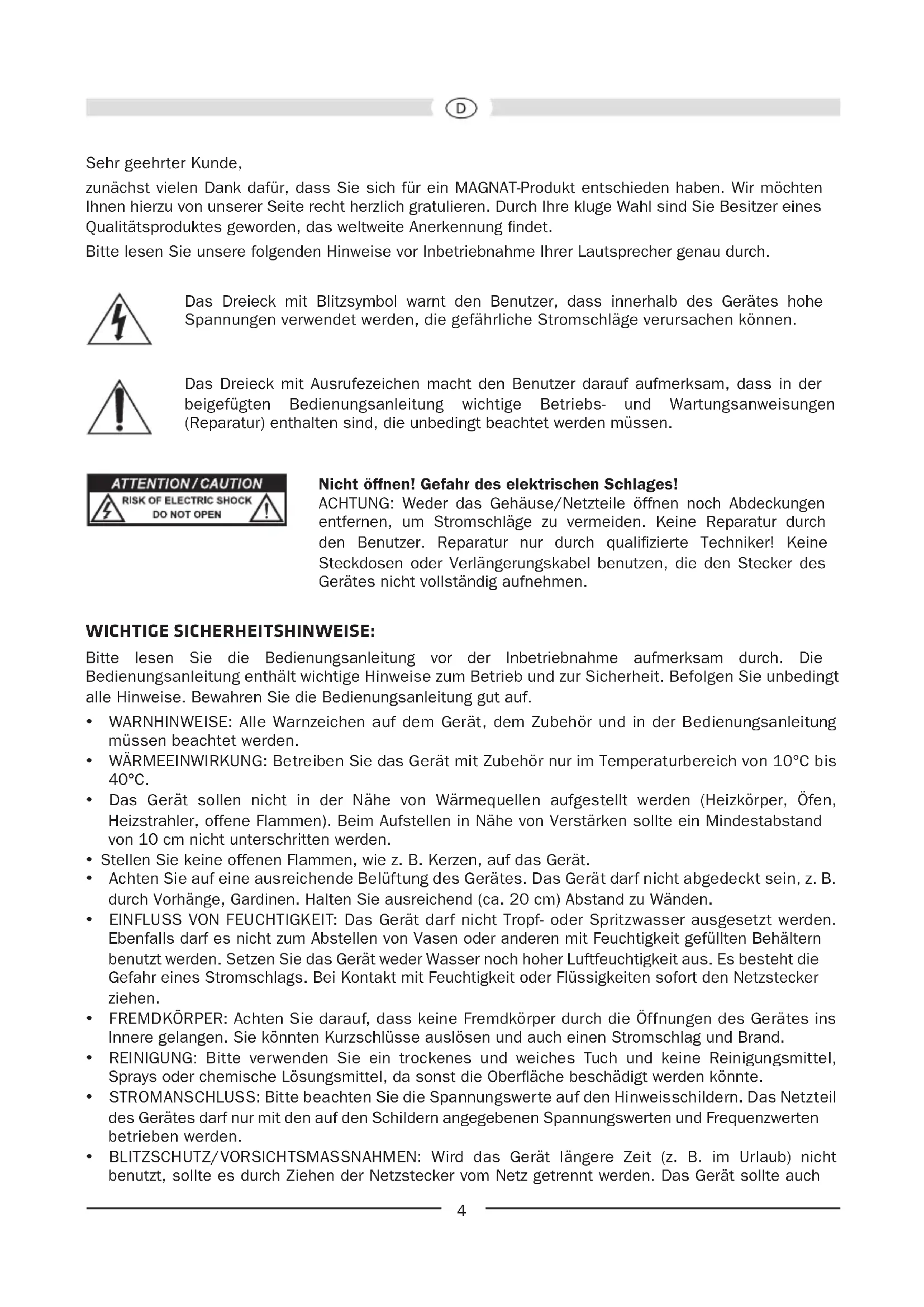 Abbildungen/Illustrations4 Sehr geehrter Kunde, zunächst vielen Dank dafür, dass Sie sich für ein MAGNAT-Produkt entschieden haben. Wir möchten Ihnen hierzu von unserer Seite recht herzlich gratulieren. Durch Ihre kluge Wahl sind Sie Besitzer eines Qualitätsproduktes geworden, das weltweite Anerkennung ndet. Bitte lesen Sie unsere folgenden Hinweise vor Inbetriebnahme Ihrer Lautsprecher genau durch. Das Dreieck mit Blitzsymbol warnt den Benutzer, dass innerhalb des Gerätes hohe Spannungen verwendet werden, die gefährliche Stromschläge verursachen können. Das Dreieck mit Ausrufezeichen macht den Benutzer darauf aufmerksam, dass in der beigefügten Bedienungsanleitung wichtige Betriebs- und Wartungsanweisungen (Reparatur) enthalten sind, die unbedingt beachtet werden müssen. Nicht öffnen! Gefahr des elektrischen Schlages! ACHTUNG: Weder das Gehäuse/Netzteile öffnen noch Abdeckungen entfernen, um Stromschläge zu vermeiden. Keine Reparatur durch den Benutzer. Reparatur nur durch qualizierte Techniker! Keine Steckdosen oder Verlängerungskabel benutzen, die den Stecker des Gerätes nicht vollständig aufnehmen. WICHTIGE SICHERHEITSHINWEISE: Bitte lesen Sie die Bedienungsanleitung vor der Inbetriebnahme aufmerksam durch. Die Bedienungsanleitung enthält wichtige Hinweise zum Betrieb und zur Sicherheit. Befolgen Sie unbedingt alle Hinweise. Bewahren Sie die Bedienungsanleitung gut auf.
