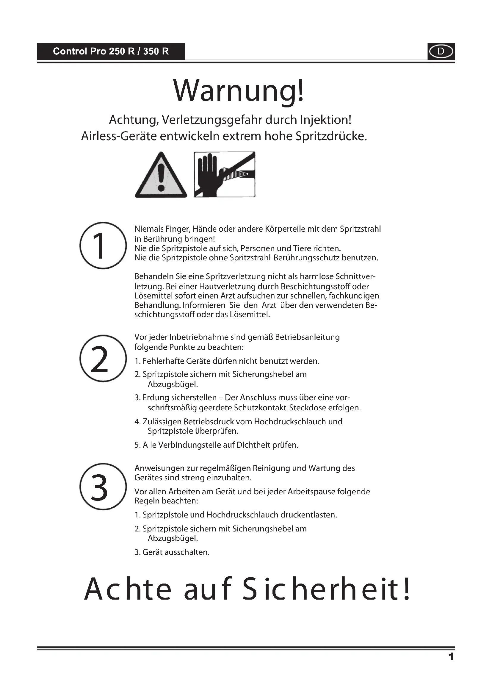 Niemals Finger, Hände oder andere Körperteile mit dem Spritzstrahl in Berührung bringen! Nie die Spritzpistole auf sich, Personen und Tiere richten. Nie die Spritzpistole ohne Spritzstrahl-Berührungsschutz benutzen.