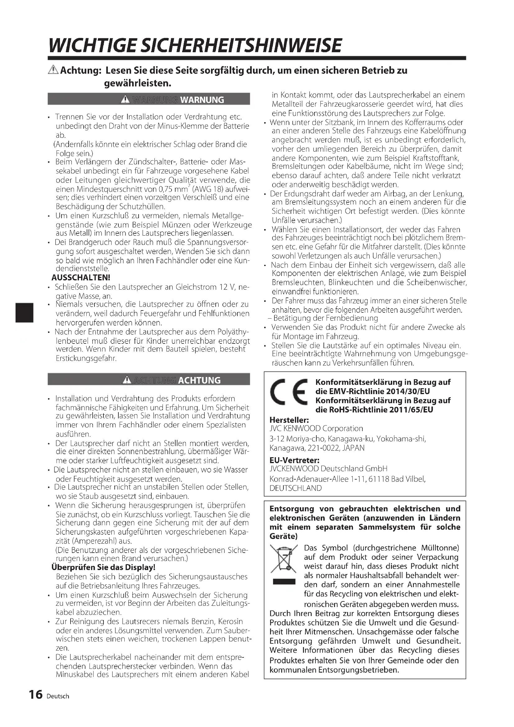 - Stellen Sie die Lautstärke auf ein optimales Niveau ein. Eine beeinträchtigte Wahrnehmung von Umgebungsge- räuschen kann zu Verkehrsunfällen führen. Konformitätserklärung in Bezug auf die EMV-Richtlinie 2014/30/EU Konformitätserklärung in Bezug auf die RoHS-Richtlinie 2011/65/EU Hersteller: JVC KENWOOD Corporation 3-12 Moriya-cho, Kanagawa-ku, Yokohama-shi, Kanagawa, 221-0022, JAPAN EU-Vertreter: JVCKENWOOD Deutschland GmbH Konrad-Adenauer-Allee 1-11, 61118 Bad Vilbel, DEUTSCHLAND Entsorgung von gebrauchten elektrischen und elektronischen Geräten (anzuwenden in Ländern mit einem separaten Sammelsystem für solche Geräte) Das Symbol (durchgestrichene Mülltonne) auf dem Produkt oder seiner Verpackung weist darauf hin, dass dieses Produkt nicht als normaler Haushaltsabfall behandelt wer- den darf, sondern an einer Annahmestelle für das Recycling von elektrischen und elekt- ronischen Geräten abgegeben werden muss. Durch Ihren Beitrag zur korrekten Entsorgung dieses Produktes schützen Sie die Umwelt und die Gesund- heit Ihrer Mitmenschen. Unsachgemässe oder falsche Entsorgung gefährden Umwelt und Gesundheit. Weitere Informationen über das Recycling dieses Produktes erhalten Sie von Ihrer Gemeinde oder den kommunalen Entsorgungsbetrieben. 3GEJ.indd163GEJ.indd16 2017/12/2818:512017/12/2818:51Deutsch