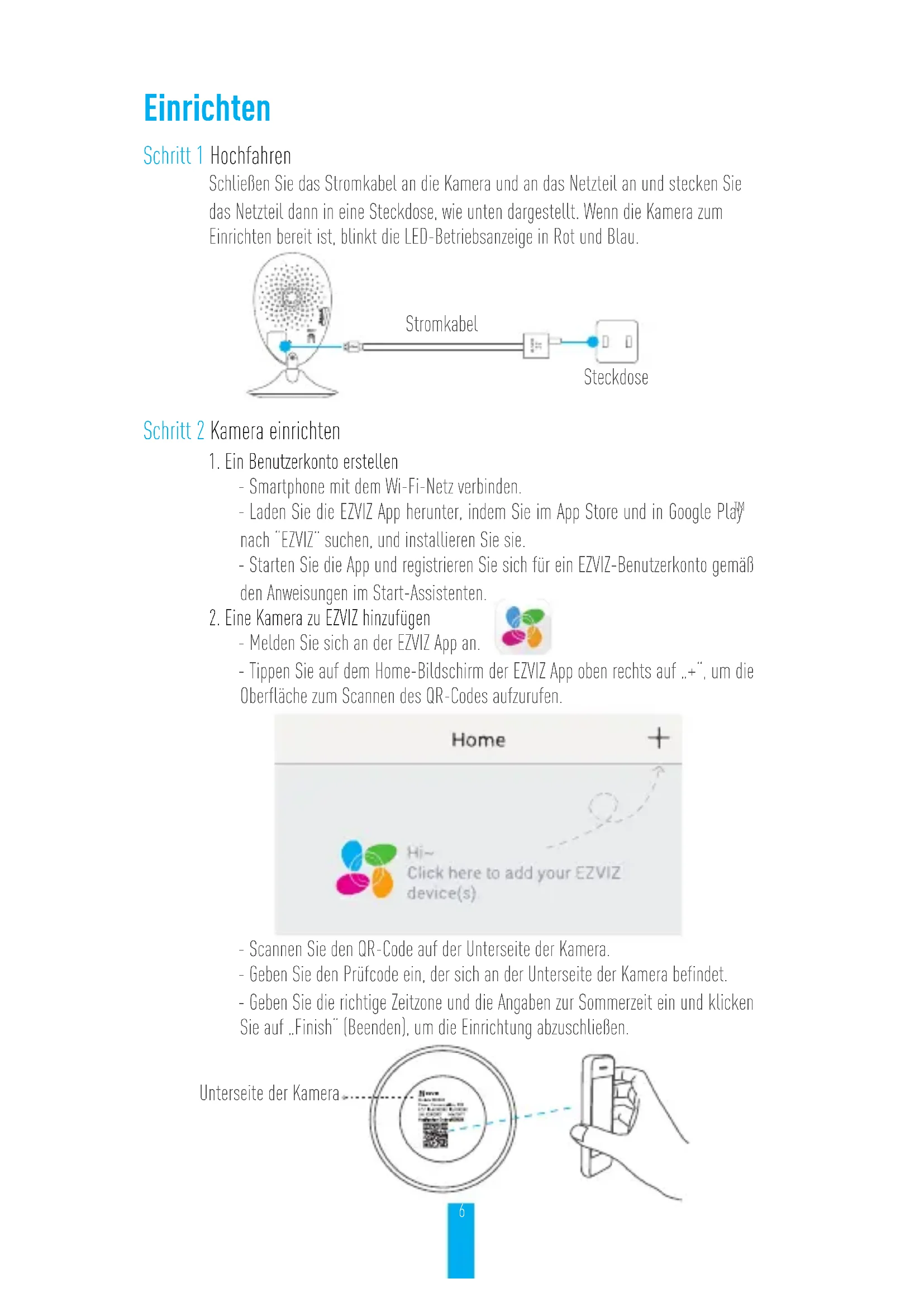 It’s advised to use the EZVIZ standard power adapter to provide a stable voltage supply. For more information, please visit www.ezvizlife.com.6 Einrichten Schritt 1 Hochfahren Schließen Sie das Stromkabel an die Kamera und an das Netzteil an und stecken Sie das Netzteil dann in eine Steckdose, wie unten dargestellt. Wenn die Kamera zum Einrichten bereit ist, blinkt die LED-Betriebsanzeige in Rot und Blau. Stromkabel Steckdose Schritt 2 Kamera einrichten