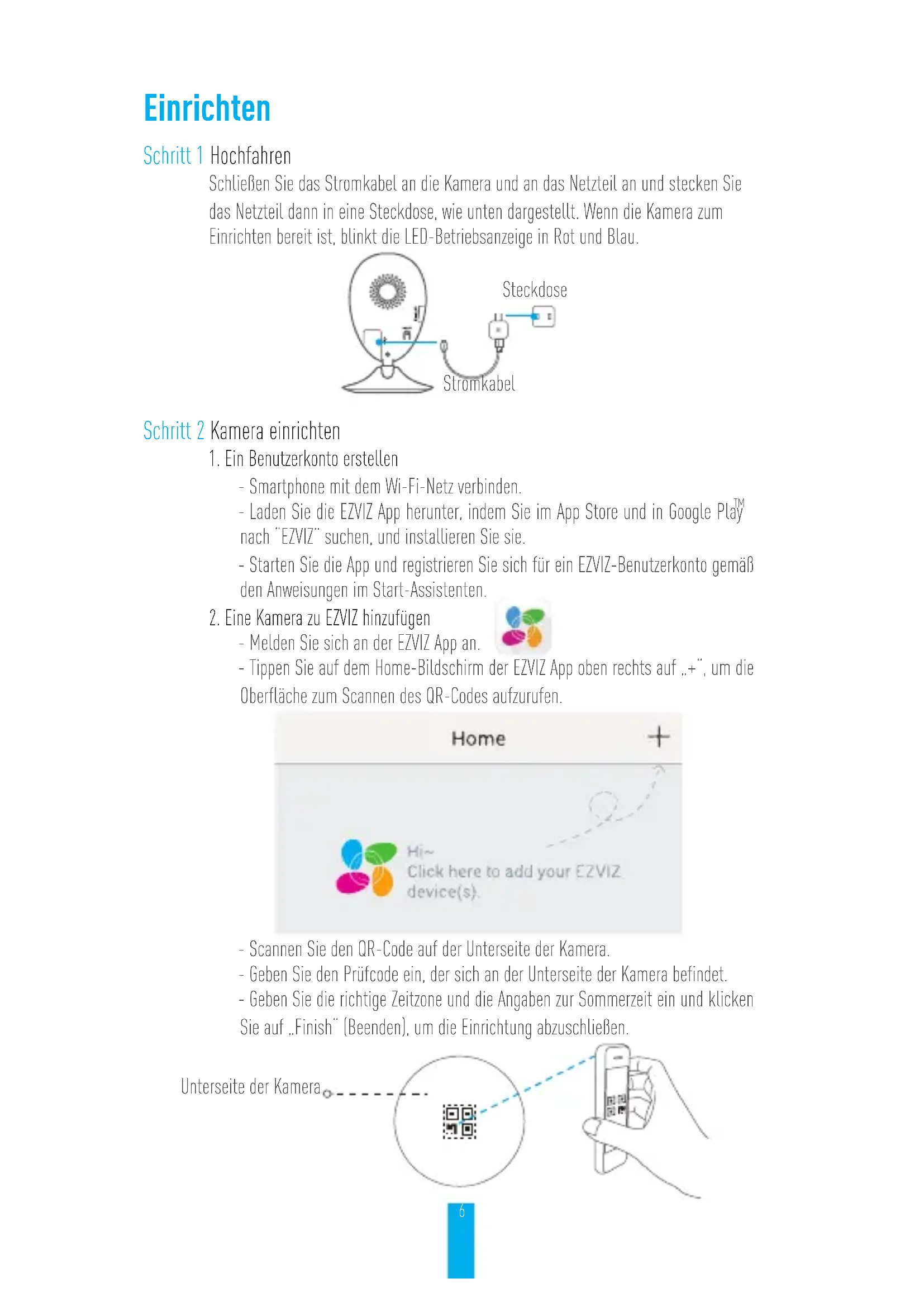 It’s advised to use the EZVIZ standard power adapter to provide a stable voltage supply. For more information, please visit www.ezvizlife.com.6 Einrichten Schritt 1 Hochfahren Schließen Sie das Stromkabel an die Kamera und an das Netzteil an und stecken Sie das Netzteil dann in eine Steckdose, wie unten dargestellt. Wenn die Kamera zum Einrichten bereit ist, blinkt die LED-Betriebsanzeige in Rot und Blau. Stromkabel Steckdose Schritt 2 Kamera einrichten