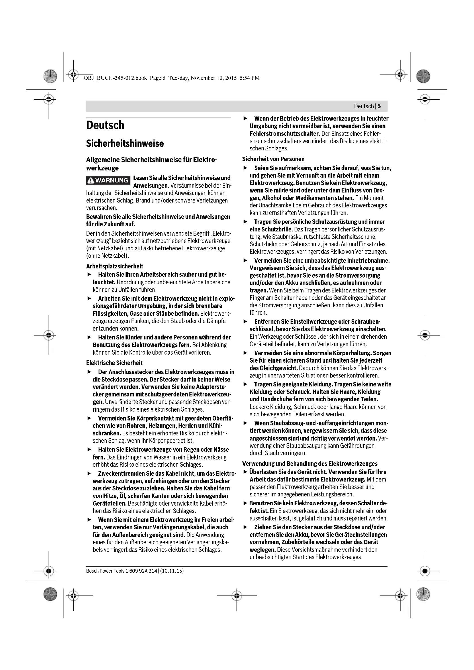 OBJ_BUCH-345-012.book Page 4 Tuesday, November 10, 2015 5:54 PMDeutsch | 5 Bosch Power Tools 1 609 92A 214 | (10.11.15) Deutsch Sicherheitshinweise Allgemeine Sicherheitshinweise für Elektro- werkzeuge Lesen Sie alle Sicherheitshinweise und Anweisungen. Versäumnisse bei der Ein- haltung der Sicherheitshinweise und Anweisungen können elektrischen Schlag, Brand und/oder schwere Verletzungen verursachen. Bewahren Sie alle Sicherheitshinweise und Anweisungen für die Zukunft auf. Der in den Sicherheitshinweisen verwendete Begriff „Elektro- werkzeug“ bezieht sich auf netzbetriebene Elektrowerkzeuge (mit Netzkabel) und auf akkubetriebene Elektrowerkzeuge (ohne Netzkabel). Arbeitsplatzsicherheit Halten Sie Ihren Arbeitsbereich sauber und gut be- leuchtet. Unordnung oder unbeleuchtete Arbeitsbereiche können zu Unfällen führen. Arbeiten Sie mit dem Elektrowerkzeug nicht in explo- sionsgefährdeter Umgebung, in der sich brennbare Flüssigkeiten, Gase oder Stäube befinden. Elektrowerk- zeuge erzeugen Funken, die den Staub oder die Dämpfe entzünden können. Halten Sie Kinder und andere Personen während der Benutzung des Elektrowerkzeugs fern. Bei Ablenkung können Sie die Kontrolle über das Gerät verlieren. Elektrische Sicherheit Der Anschlussstecker des Elektrowerkzeuges muss in die Steckdose passen. Der Stecker darf in keiner Weise verändert werden. Verwenden Sie keine Adapterste- cker gemeinsam mit schutzgeerdeten Elektrowerkzeu- gen. Unveränderte Stecker und passende Steckdosen ver- ringern das Risiko eines elektrischen Schlages. Vermeiden Sie Körperkontakt mit geerdeten Oberflä- chen wie von Rohren, Heizungen, Herden und Kühl- schränken. Es besteht ein erhöhtes Risiko durch elektri- schen Schlag, wenn Ihr Körper geerdet ist. Halten Sie Elektrowerkzeuge von Regen oder Nässe fern. Das Eindringen von Wasser in ein Elektrowerkzeug erhöht das Risiko eines elektrischen Schlages. Zweckentfremden Sie das Kabel nicht, um das Elektro- werkzeug zu tragen, aufzuhängen oder um den Stecker aus der Steckdose zu ziehen. Halten Sie das Kabel fern von Hitze, Öl, scharfen Kanten oder sich bewegenden Geräteteilen. Beschädigte oder verwickelte Kabel erhö- hen das Risiko eines elektrischen Schlages. Wenn Sie mit einem Elektrowerkzeug im Freien arbei- ten, verwenden Sie nur Verlängerungskabel, die auch für den Außenbereich geeignet sind. Die Anwendung eines für den Außenbereich geeigneten Verlängerungska- bels verringert das Risiko eines elektrischen Schlages. Wenn der Betrieb des Elektrowerkzeuges in feuchter Umgebung nicht vermeidbar ist, verwenden Sie einen Fehlerstromschutzschalter. Der Einsatz eines Fehler- stromschutzschalters vermindert das Risiko eines elektri- schen Schlages. Sicherheit von Personen Seien Sie aufmerksam, achten Sie darauf, was Sie tun, und gehen Sie mit Vernunft an die Arbeit mit einem Elektrowerkzeug. Benutzen Sie kein Elektrowerkzeug, wenn Sie müde sind oder unter dem Einfluss von Dro- gen, Alkohol oder Medikamenten stehen. Ein Moment der Unachtsamkeit beim Gebrauch des Elektrowerkzeuges kann zu ernsthaften Verletzungen führen. Tragen Sie persönliche Schutzausrüstung und immer eine Schutzbrille. Das Tragen persönlicher Schutzausrüs- tung, wie Staubmaske, rutschfeste Sicherheitsschuhe, Schutzhelm oder Gehörschutz, je nach Art und Einsatz des Elektrowerkzeuges, verringert das Risiko von Verletzungen. Vermeiden Sie eine unbeabsichtigte Inbetriebnahme. Vergewissern Sie sich, dass das Elektrowerkzeug aus- geschaltet ist, bevor Sie es an die Stromversorgung und/oder den Akku anschließen, es aufnehmen oder tragen. Wenn Sie bei m Tragen des Elektrowerkzeuges den Finger am Schalter haben oder das Gerät eingeschaltet an die Stromversorgung anschließen, kann dies zu Unfällen führen. Entfernen Sie Einstellwerkzeuge oder Schrauben- schlüssel, bevor Sie das Elektrowerkzeug einschalten. Ein Werkzeug oder Schlüssel, der sich in einem drehenden Geräteteil befindet, kann zu Verletzungen führen. Vermeiden Sie eine abnormale Körperhaltung. Sorgen Sie für einen sicheren Stand und halten Sie jederzeit das Gleichgewicht. Dadurch können Sie das Elektrowerk- zeug in unerwarteten Situationen besser kontrollieren. Tragen Sie geeignete Kleidung. Tragen Sie keine weite Kleidung oder Schmuck. Halten Sie Haare, Kleidung und Handschuhe fern von sich bewegenden Teilen. Lockere Kleidung, Schmuck oder lange Haare können von sich bewegenden Teilen erfasst werden. Wenn Staubabsaug- und -auffangeinrichtungen mon- tiert werden können, vergewissern Sie sich, dass diese angeschlossen sind und richtig verwendet werden. Ver- wendung einer Staubabsaugung kann Gefährdungen durch Staub verringern. Verwendung und Behandlung des Elektrowerkzeuges Überlasten Sie das Gerät nicht. Verwenden Sie für Ihre Arbeit das dafür bestimmte Elektrowerkzeug. Mit dem passenden Elektrowerkzeug arbeiten Sie besser und sicherer im angegebenen Leistungsbereich. Benutzen Sie kein Elektrowerkzeug, dessen Schalter de- fekt ist. Ein Elektrowerkzeug, das sich nicht mehr ein- oder ausschalten lässt, ist gefährlich und muss repariert werden. Ziehen Sie den Stecker aus der Steckdose und/oder entfernen Sie den Akku, bevor Sie Geräteeinstellungen vornehmen, Zubehörteile wechseln oder das Gerät weglegen. Diese Vorsichtsmaßnahme verhindert den unbeabsichtigten Start des Elektrowerkzeuges. WARNUNG OBJ_BUCH-345-012.book Page 5 Tuesday, November 10, 2015 5:54 PM6 | Deutsch 1 609 92A 214 | (10.11.15) Bosch Power Tools Bewahren Sie unbenutzte Elektrowerkzeuge außer- halb der Reichweite von Kindern auf. Lassen Sie Perso- nen das Gerät nicht benutzen, die mit diesem nicht ver- traut sind oder diese Anweisungen nicht gelesen haben. Elektrowerkzeuge sind gefährlich, wenn sie von unerfahrenen Personen benutzt werden. Pflegen Sie Elektrowerkzeuge mit Sorgfalt. Kontrollie- ren Sie, ob bewegliche Teile einwandfrei funktionieren und nicht klemmen, ob Teile gebrochen oder so be- schädigt sind, dass die Funktion