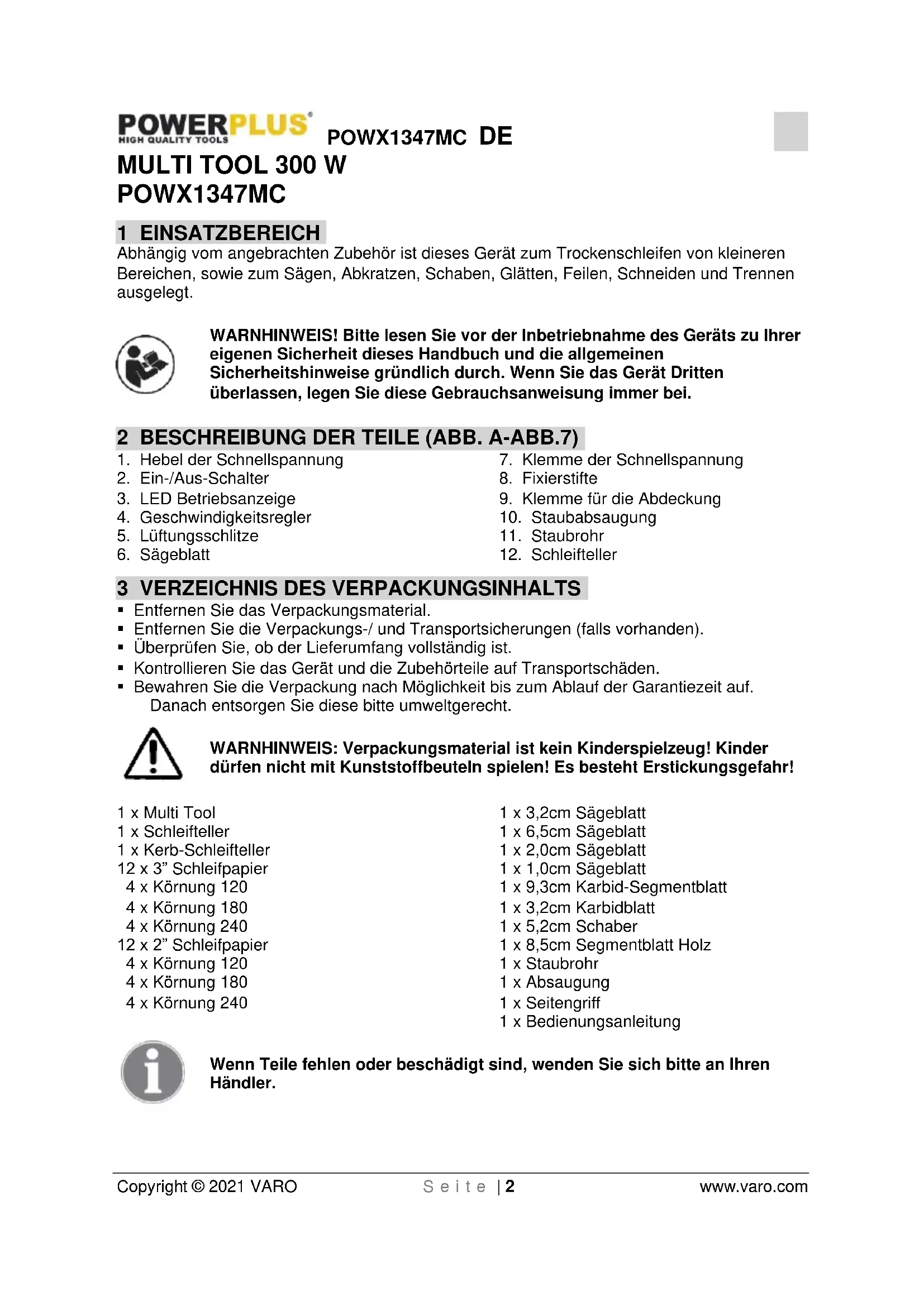 Entfernen Sie das Verpackungsmaterial. Entfernen Sie die Verpackungs-/ und Transportsicherungen (falls vorhanden). Überprüfen Sie, ob der Lieferumfang vollständig ist. Kontrollieren Sie das Gerät und die Zubehörteile auf Transportschäden. Bewahren Sie die Verpackung nach Möglichkeit bis zum Ablauf der Garantiezeit auf. Danach entsorgen Sie diese bitte umweltgerecht. WARNHINWEIS: Verpackungsmaterial ist kein Kinderspielzeug! Kinder dürfen nicht mit Kunststoffbeuteln spielen! Es besteht Erstickungsgefahr! 1 x Multi Tool 1 x Schleifteller 1 x Kerb-Schleifteller 12 x 3” Schleifpapier 4 x Körnung 120 4 x Körnung 180 4 x Körnung 240 12 x 2” Schleifpapier 4 x Körnung 120 4 x Körnung 180 4 x Körnung 240 1 x 3,2cm Sägeblatt 1 x 6,5cm Sägeblatt 1 x 2,0cm Sägeblatt 1 x 1,0cm Sägeblatt 1 x 9,3cm Karbid-Segmentblatt 1 x 3,2cm Karbidblatt 1 x 5,2cm Schaber 1 x 8,5cm Segmentblatt Holz 1 x Staubrohr 1 x Absaugung 1 x Seitengriff 1 x Bedienungsanleitung Wenn Teile fehlen oder beschädigt sind, wenden Sie sich bitte an Ihren Händler.POWX1347MC DE Copyright © 2021 VARO S e i t e | 3 www.varo.com