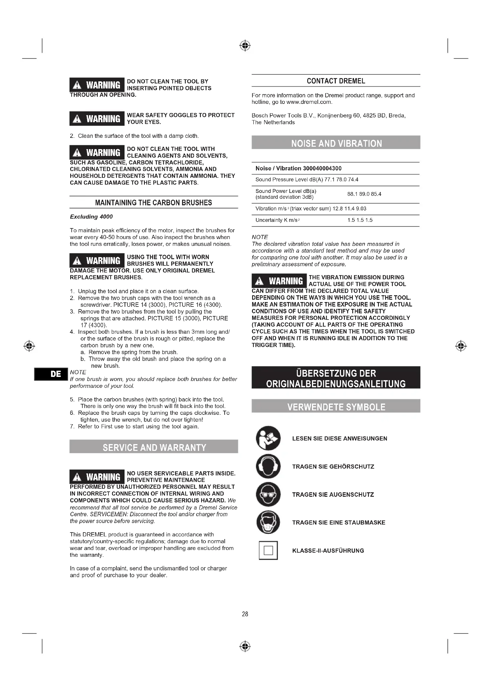 AUTORISIERTE PERSONEN ERFOLGEN. Wir empfehlen, Wartung und Reparatur von Dremel-Serviceniederlassungen durchführen zu lassen. WARTUNGSTECHNIKER: Trennen Sie das Werkzeug bzw. Ladegerät stets von der Stromversorgung, bevor Sie mit Wartungsarbeiten beginnen. Die Garantie für dieses DREMEL Produkt entspricht den länderspezischen Vorschriften. Schäden durch normale Abnutzung und Verschleiß sowie Überlastung oder unsachgemäße Behandlung sind von der Garantie ausgeschlossen. Im Falle einer Reklamation schicken Sie das Werkzeug oder Ladegerät zusammen mit einem entsprechenden Kaufnachweis an Ihren Händler. DREMEL-KONTAKTINFORMATIONEN Weitere Informationen über Dremel-Produkte, Kundendienst und Hotline nden Sie unter www.dremel.com. Bosch Power Tools B.V., Konijnenberg 60, 4825 BD, Breda, Niederlande