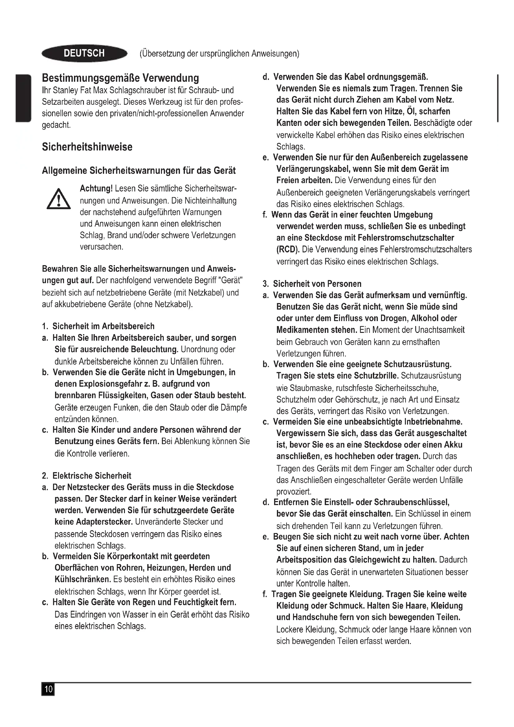 a. Der Netzstecker des Geräts muss in die Steckdose passen. Der Stecker darf in keiner Weise verändert werden. Verwenden Sie für schutzgeerdete Geräte keine Adapterstecker. Unveränderte Stecker und passende Steckdosen verringern das Risiko eines elektrischen Schlags. b. Vermeiden Sie Körperkontakt mit geerdeten Oberächen von Rohren, Heizungen, Herden und Kühlschränken. Es besteht ein erhöhtes Risiko eines elektrischen Schlags, wenn Ihr Körper geerdet ist. c. Halten Sie Geräte von Regen und Feuchtigkeit fern. Das Eindringen von Wasser in ein Gerät erhöht das Risiko eines elektrischen Schlags. d. Verwenden Sie das Kabel ordnungsgemäß. Verwenden Sie es niemals zum Tragen. Trennen Sie das Gerät nicht durch Ziehen am Kabel vom Netz. Halten Sie das Kabel fern von Hitze, Öl, scharfen Kanten oder sich bewegenden Teilen. Beschädigte oder verwickelte Kabel erhöhen das Risiko eines elektrischen Schlags. e. Verwenden Sie nur für den Außenbereich zugelassene Verlängerungskabel, wenn Sie mit dem Gerät im Freien arbeiten. Die Verwendung eines für den Außenbereich geeigneten Verlängerungskabels verringert das Risiko eines elektrischen Schlags. f. Wenn das Gerät in einer feuchten Umgebung verwendet werden muss, schließen Sie es unbedingt an eine Steckdose mit Fehlerstromschutzschalter (RCD). Die Verwendung eines Fehlerstromschutzschalters verringert das Risiko eines elektrischen Schlags.