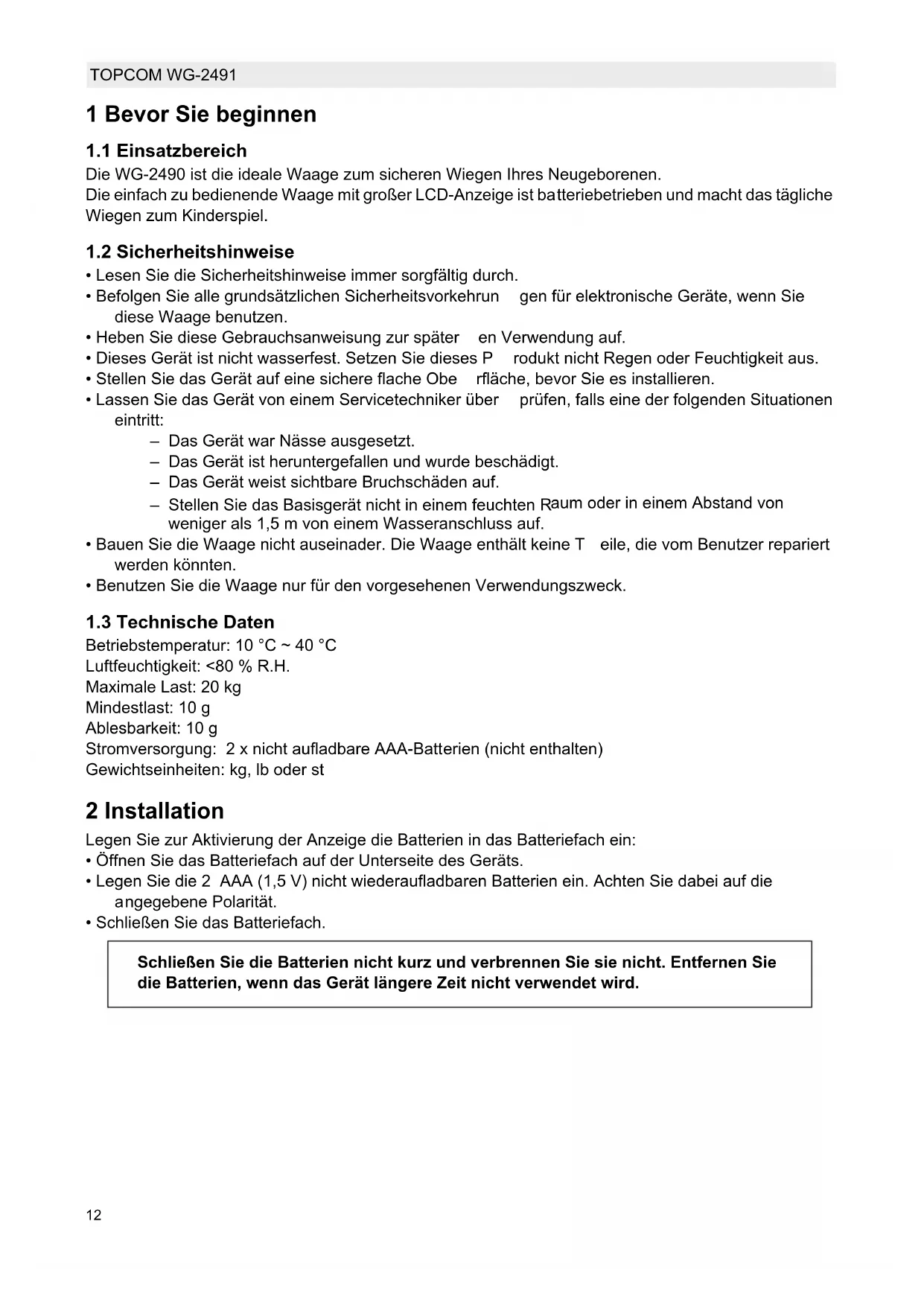 O-Ld Zu wenig Energie - Tauschen Sie die Batterien aus Überlast. Das Gewicht des Babys ist über 20 kg. 6 Reinigung Reinigen Sie die Waage mit einem leicht feuchten Lappen oder mit einem antistatischen Tuch. Verwenden Sie niemals Reinigungs- oder Scheuermittel. 7 Entsorgung des Geräts (Umweltschutz) Am Ende der Nutzungsdauer des Produkts darf das Gerät nicht im normalen Hausmüll entsorgt werden. Bringen Sie es zu einer Sam melstelle zur Aufbereitung elektrischer und elektronischer Geräte. Das Symbol am Produkt, in der Bedienungsanleitung und/oder Verpackung zeigt dies an.14 TOPCOM WG-2491 Einige der Materialien des Produkts können wieder verwendet werden, wenn Sie das Gerät in einer Aufbereitungsstelle abgeben. Mit der Wiederverwertung einiger Teile oder Rohmaterialien aus gebrauchten Produkten leisten Sie einen wichtigen Beitrag zum Umweltschutz. Wenden Sie sich bitte an Ihre örtlichen Behörden, wenn Sie weitere Informationen über Sammelstellen in Ihrer Umgebung benötigen. Batterien müssen vor der Entsorgung des Geräts entnommen werden. Entsorgen Sie die Batterien auf umweltfreundliche Weise entsprechend den örtlichen Vorschriften. 8 Topcom Garantie