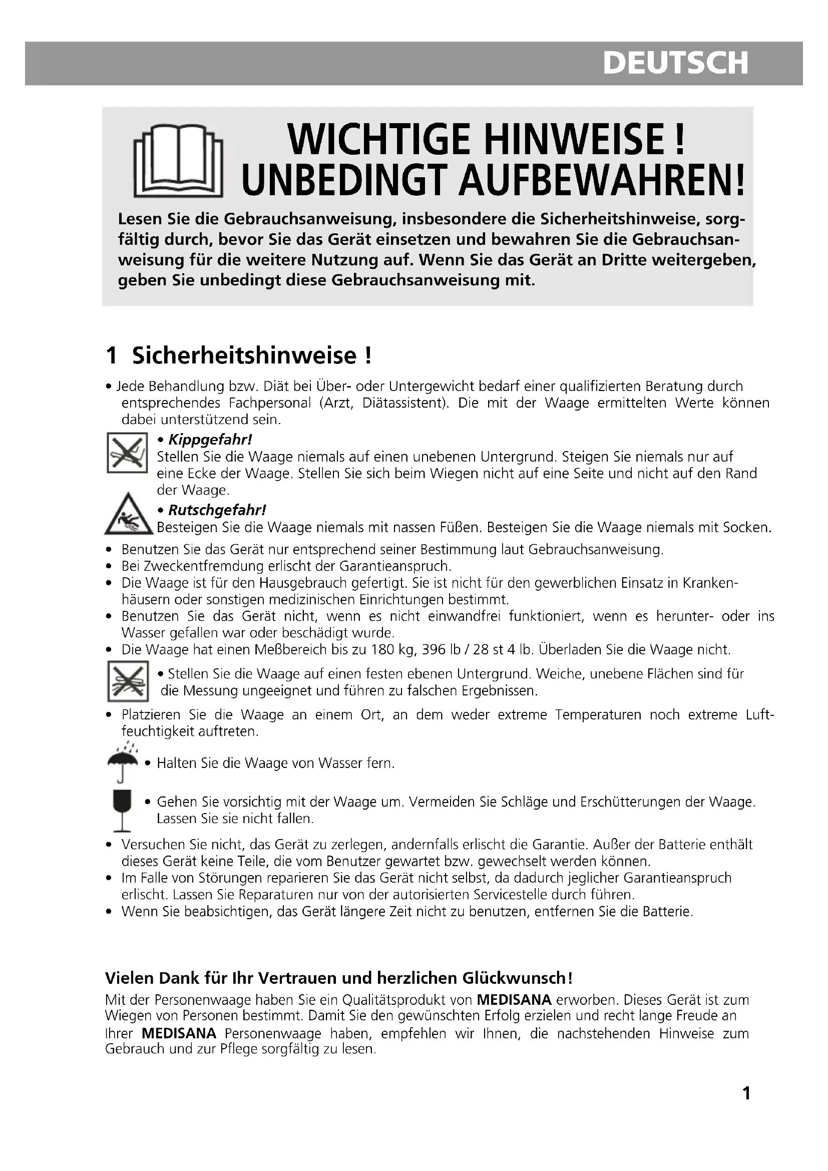 - Jede Behandlung bzw. Diät bei Über- oder Untergewicht bedarf einer qualifizierten Beratung durchentsprechendes Fachpersonal (Arzt, Diätassistent). Die mit der Waage ermittelten Werte könnendabei unterstützend sein.• Kippgefahr!Stellen Sie die Waage niemals auf einen unebenen Untergrund. Steigen Sie niemals nur aufeine Ecke der Waage. Stellen Sie sich beim Wiegen nicht auf eine Seite und nicht auf den Randder Waage.• Rutschgefahr!Besteigen Sie die Waage niemals mit nassen Füßen. Besteigen Sie die Waage niemals mit Socken. Benutzen Sie das Gerät nur entsprechend seiner Bestimmung laut Gebrauchsanweisung. Bei Zweckentfremdung erlischt der Garantieanspruch. Die Waage ist für den Hausgebrauch gefertigt. Sie ist nicht für den gewerblichen Einsatz in Kranken-häusern oder sonstigen medizinischen Einrichtungen bestimmt. Benutzen Sie das Gerät nicht, wenn es nicht einwandfrei funktioniert, wenn es herunter- oder insWasser gefallen war oder beschädigt wurde. Die Waage hat einen Meßbereich bis zu 180 kg, 396 lb / 28 st 4 lb. Überladen Sie die Waage nicht. Stellen Sie die Waage auf einen festen ebenen Untergrund. Weiche, unebene Flächen sind fürdie Messung ungeeignet und führen zu falschen Ergebnissen. Platzieren Sie die Waage an einem Ort, an dem weder extreme Temperaturen noch extreme Luft-feuchtigkeit auftreten. Halten Sie die Waage von Wasser fern. Gehen Sie vorsichtig mit der Waage um. Vermeiden Sie Schläge und Erschütterungen der Waage.Lassen Sie sie nicht fallen. Versuchen Sie nicht, das Gerät zu zerlegen, andernfalls erlischt die Garantie. Außer der Batterie enthältdieses Gerät keine Teile, die vom Benutzer gewartet bzw. gewechselt werden können. Im Falle von Störungen reparieren Sie das Gerät nicht selbst, da dadurch jeglicher Garantieansprucherlischt. Lassen Sie Reparaturen nur von der autorisierten Servicestelle durch führen. Wenn Sie beabsichtigen, das Gerät längere Zeit nicht zu benutzen, entfernen Sie die Batterie. Vielen Dank für Ihr Vertrauen und herzlichen Glückwunsch! Mit der Personenwaage haben Sie ein Qualitätsprodukt von MEDISANA erworben. Dieses Gerät ist zum Wiegen von Personen bestimmt. Damit Sie den gewünschten Erfolg erzielen und recht lange Freude an Ihrer MEDISANA Personenwaage haben, empfehlen wir Ihnen, die nachstehenden Hinweise zum Gebrauch und zur Pflege sorgfältig zu lesen.22 DEUTSCH 2 Lieferumfang und Verpackung Bitte prüfen Sie zunächst, ob das Gerät vollständig ist und keinerlei Beschädigung aufweist. Im Zweifelsfalle nehmen Sie das Gerät nicht in Betrieb und wenden Sie sich an Ihren Händler oder an Ihre Servicestelle. Zum Lieferumfang gehören: