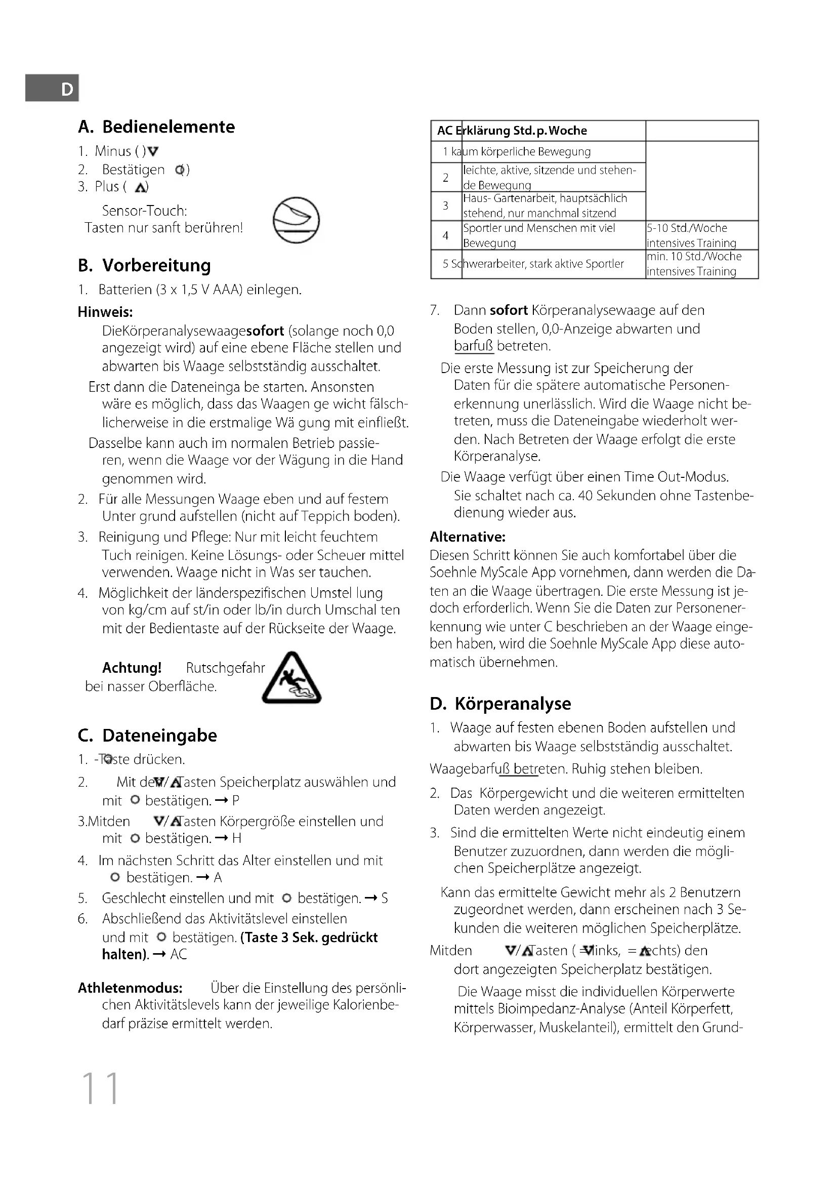 von kg/cm auf st/in oder lb/in durch Umschal ten mit der Bedientaste auf der Rückseite der Waage. Achtung! Rutschgefahr bei nasser Oberfläche. C. Dateneingabe