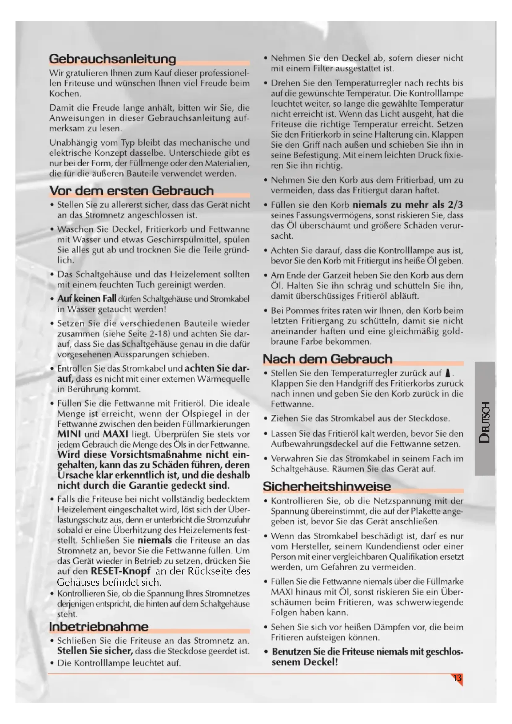 - WirempfehlenIhnen,beimFritierennurdenTemperaturreglerunddie Handgriffezu be-rühren.•Ziehen Sie den Stecker aus der Steckdose und lassen Sie die Friteuse kalt werden, be-vor Sie das Gerät bewegen, sonst riskieren Sie Verbrühungen bei sich selbst oder Um-stehenden.•DieFriteuseniemalsaufdenFußbodenstellenodergaramBodeninBetriebnehmen.DasRisiko,sieumzustoßenundVerbrühungenzuverursachen,istzuhoch.•Behalten Sie die Friteuse beim Betrieb auf-merksamimAugeundhaltenSieKindervonihr fern.•AchtenSiedarauf,dassdieFettwanneimmerrichtigtrocken und sauberist,wennSieÖleinfüllen. Nur wenigeTropfen Wasser kön-nen beim Fritieren schon zu gefährlichenSpritzernführen.•ZiehenSieimmerdenSteckerausderSteck-dose,wenndieFriteusenichtmehrgebrauchtwird.AchtenSieaußerdemdarauf,dassalleBauteilekaltsind,bevorSiedasGerätzerle-genoderseinenDeckelschließen.•ImFalleeinesDefektsdürfenSiedieFriteusekeinesfallsbenutzen,sondernlassenSiedasGerät durch einen zugelassenen Kunden-dienst überprüfen.•Wenndas Stromkabel beschädigtist,lassenSieesvoneinerdazubefähigtenundautori-siertenPersonersetzen.•BewahrenSiedieseGebrauchsanleitungauf,SiekannIhnenspätervielleichtnochnützlichsein.