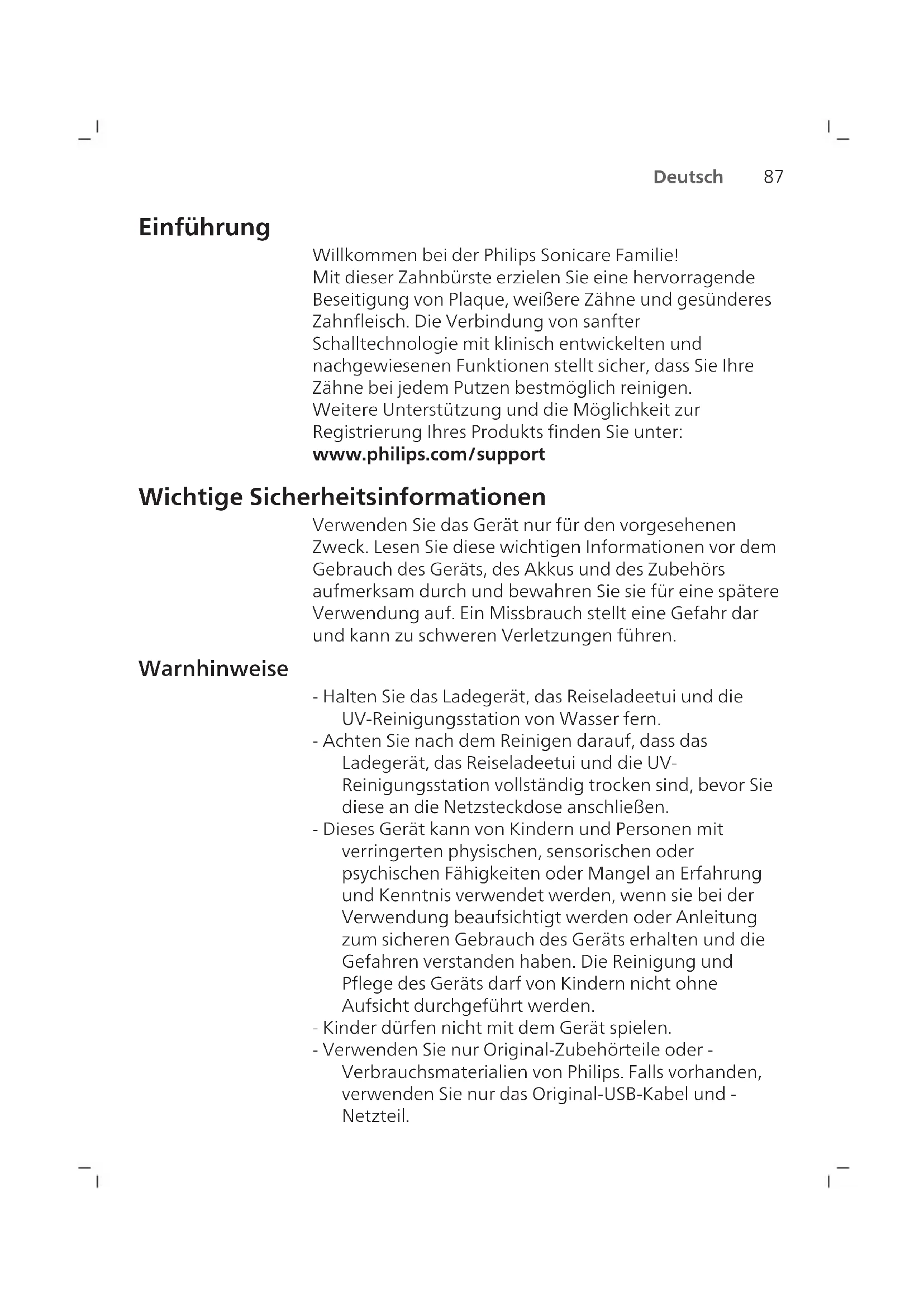 Deutsch Einführung Willkommen bei der Philips Sonicare Familie! Mit dieser Zahnbürste erzielen Sie eine hervorragende Beseitigung von Plaque, weißere Zähne und gesünderes Zahnfleisch. Die Verbindung von sanfter Schalltechnologie mit klinisch entwickelten und nachgewiesenen Funktionen stellt sicher, dass Sie Ihre Zähne bei jedem Putzen bestmöglich reinigen. Weitere Unterstützung und die Möglichkeit zur Registrierung Ihres Produkts finden Sie unter: www.philips.com/support Wichtige Sicherheitsinformationen Verwenden Sie das Gerät nur für den vorgesehenen Zweck. Lesen Sie diese wichtigen Informationen vor dem Gebrauch des Geräts, des Akkus und des Zubehörs aufmerksam durch und bewahren Sie sie für eine spätere Verwendung auf. Ein Missbrauch stellt eine Gefahr dar und kann zu schweren Verletzungen führen. Warnhinweise - Halten Sie das Ladegerät, das Reiseladeetui und die UV-Reinigungsstation von Wasser fern. - Achten Sie nach dem Reinigen darauf, dass das Ladegerät, das Reiseladeetui und die UV- Reinigungsstation vollständig trocken sind, bevor Sie diese an die Netzsteckdose anschließen. - Dieses Gerät kann von Kindern und Personen mit verringerten physischen, sensorischen oder psychischen Fähigkeiten oder Mangel an Erfahrung und Kenntnis verwendet werden, wenn sie bei der Verwendung beaufsichtigt werden oder Anleitung zum sicheren Gebrauch des Geräts erhalten und die Gefahren verstanden haben. Die Reinigung und Pflege des Geräts darf von Kindern nicht ohne Aufsicht durchgeführt werden. - Kinder dürfen nicht mit dem Gerät spielen. - Verwenden Sie nur Original-Zubehörteile oder - Verbrauchsmaterialien von Philips. Falls vorhanden, verwenden Sie nur das Original-USB-Kabel und - Netzteil.88 Deutsch - Dieses Gerät enthält keine Teile, die vom Benutzer repariert werden können. Wenn das Gerät beschädigt ist, verwenden Sie es nicht mehr, und wenden Sie sich bitte an das Service‑Center in Ihrem Land (siehe „Garantie und Support”). - Verwenden Sie das USB-Kabel und das USB-Netzteil nicht, wenn sie beschädigt sind. - Verwenden Sie das Ladegerät, das Reiseladeetui und/oder die UV-Reinigungsstation nie im Freien oder in der Nähe von heißen Oberflächen. - Die Produktteile dürfen nicht in der Spülmaschine gereinigt werden. - Dieses Gerät ist ausschließlich zum Reinigen von Zähnen, Zahnfleisch und Zunge gedacht. - Bewahren Sie die UV-Reinigungsstation immer außerhalb der Reichweite von Kindern auf. - Verwenden Sie die UV-Reinigungsstation nicht mehr, wenn die UV-Lampe bei geöffneter Klappe weiterhin leuchtet. UV-Licht kann für das menschliche Auge und die Haut schädlich sein. - Bedienen Sie die Reinigungsstation nur mit Schutzscheibe. - Berühren Sie die UV-Lampe der UV-Reinigungsstation nicht, wenn sie heiß ist. - Unterlassen Sie es, einen Bürstenkopf mit abgeknickten oder zerdrückten Borsten zu verwenden. Ersetzen Sie den Bürstenkopf alle 3Monate oder früher, falls Anzeichen von Abnutzung auftreten. - Vermeiden Sie direkten Kontakt mit Produkten, die ätherische Öle oder Kokosnussöl enthalten. Der Kontakt kann zum Lösen von Borsten führen. - Die maximale Höhe der Nutzung beträgt 4500Meter. MEDIZINISCHE HINWEISE - Verwenden Sie das Gerät nicht mehr, und konsultieren Sie Ihren Zahnarzt/Arzt, wenn übermäßiges Zahnfleischbluten auftritt oder Zahnfleischbluten länger als eine Woche anhält oder wenn Sie beim Gebrauch Unbehagen oder Schmerzen verspüren.89 Deutsch - Wenn in den vergangenen 2Monaten ein chirurgischer Eingriff an Ihren Zähnen oder am Zahnfleisch vorgenommen wurde, sollten Sie vor Benutzung des Geräts Ihren Zahnarzt konsultieren. - Wenden Sie sich als Träger eines Herzschrittmachers oder eines anderen Implantats vor der Verwendung dieses Geräts an Ihren Arzt oder den Hersteller des implantierten Gerätes. - Sollten Sie Bedenken wegen Ihrer Gesundheit haben, konsultieren Sie vor Benutzung dieses Geräts Ihren Arzt. - Dieses Gerät ist ein Gerät zur individuellen Mundpflege und nicht für die Verwendung durch mehrere Patienten in einer Zahnarztpraxis oder Zahnklinik geeignet. Batterie-Sicherheitsanweisungen - Dieses Gerät verwendet Batterien, die nur von fachkundigen Personen entfernt werden dürfen. - Verwenden Sie das Gerät nur für den vorgesehenen Zweck. Lesen Sie diese Informationen vor dem Gebrauch des Geräts, des Akkus und des Zubehörs aufmerksam durch und bewahren Sie sie für eine spätere Verwendung auf. Ein Missbrauch stellt eine Gefahr dar und kann zu schweren Verletzungen führen. Das mitgelieferte Zubehör kann für verschiedene Produkte variieren. - Verwenden Sie nur Original-Zubehörteile und - Verbrauchsmaterialien von Philips. Verwenden Sie nur das abnehmbare Netzteil TCBxxxx (Eingangsleistung: 100–240 V~; 50/60 Hz; 1,5 W), HX6100 (Eingangsleistung: 100–240 V~; 50/60 Hz; 1,4 W), HX6110 (Eingangsleistung: 100–240 V~; 50/60 Hz; 1,5 W), HX6160 (Eingangsleistung: 100–240 V~; 50/60 Hz; 6 W), WAAxxxx (Eingangsleistung: 100–240 V~; 50/60 Hz; 3,5 W). - Halten Sie das Produkt und die Akkus von Feuer fern und setzen Sie sie keinem direkten Sonnenlicht oder hohen Temperaturen aus.90 Deutsch - Wenn das Produkt ungewöhnlich heiß wird, einen ungewöhnlichen Geruch entwickelt, die Farbe ändert oder wenn das Laden viel länger dauert als üblich, beenden Sie die Verwendung und das Laden des Produkts und wenden Sie sich an Philips. - Legen Sie die Produkte und die Batterien nicht in Mikrowellen oder auf Induktionsherde. - Um die Aufheizung oder die Freisetzung giftiger oder gefährlicher Substanzen aus den Akkus zu verhindern, sollten Sie das Produkt oder die Akkus nicht öffnen, modifizieren, durchbohren, beschädigen oder zerlegen. Überladen Sie die Akkus nicht, verursachen Sie keinen Kurzschluss und laden Sie sie nicht umgekehrt auf. - Dieses Gerät verwendet Akkus, die nicht austauschbar sind. Wenn der Akku das Ende seiner Lebenszeit erreicht hat, muss das Gerät ordnungsgemäß entsorgt werden (siehe A