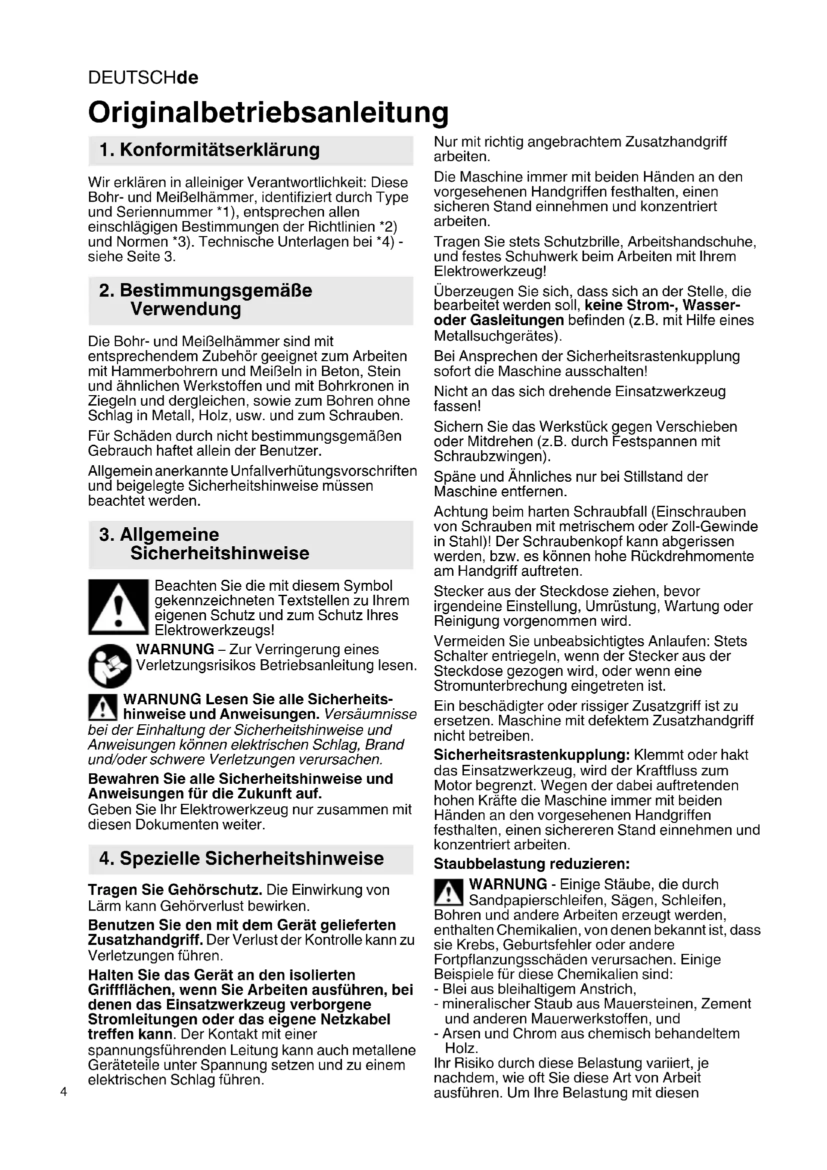 Wir erklären in alleiniger Verantwortlichkeit: Diese Bohr- und Meißelhämmer, identifiziert durch Type und Seriennummer *1), entsprechen allen einschlägigen Bestimmungen der Richtlinien *2) und Normen *3). Technische Unterlagen bei *4) - siehe Seite 3. Die Bohr- und Meißelhämmer sind mit entsprechendem Zubehör geeignet zum Arbeiten mit Hammerbohrern und Meißeln in Beton, Stein und ähnlichen Werkstoffen und mit Bohrkronen in Ziegeln und dergleichen, sowie zum Bohren ohne Schlag in Metall, Holz, usw. und zum Schrauben. Für Schäden durch nicht bestimmungsgemäßen Gebrauch haftet allein der Benutzer. Allgemein anerkannte Unfallverhütungsvorschriften und beigelegte Sicherheitshinweise müssen beachtet werden. Beachten Sie die mit diesem Symbol gekennzeichneten Textstellen zu Ihrem eigenen Schutz und zum Schutz Ihres Elektrowerkzeugs! WARNUNG – Zur Verringerung eines Verletzungsrisikos Betriebsanleitung lesen. WARNUNG Lesen Sie alle Sicherheits- hinweise und Anweisungen. Versäumnisse bei der Einhaltung der Sicherheitshinweise und Anweisungen können elektrischen Schlag, Brand und/oder schwere Verletzungen verursachen. Bewahren Sie alle Sicherheitshinweise und Anweisungen für die Zukunft auf. Geben Sie Ihr Elektrowerkzeug nur zusammen mit diesen Dokumenten weiter. Tragen Sie Gehörschutz. Die Einwirkung von Lärm kann Gehörverlust bewirken. Benutzen Sie den mit dem Gerät gelieferten Zusatzhandgriff. Der Verlust der Kontrolle kann zu Verletzungen führen. Halten Sie das Gerät an den isolierten Griffflächen, wenn Sie Arbeiten ausführen, bei denen das Einsatzwerkzeug verborgene Stromleitungen oder das eigene Netzkabel treffen kann. Der Kontakt mit einer spannungsführenden Leitung kann auch metallene Geräteteile unter Spannung setzen und zu einem elektrischen Schlag führen. Nur mit richtig angebrachtem Zusatzhandgriff arbeiten. Die Maschine immer mit beiden Händen an den vorgesehenen Handgriffen festhalten, einen sicheren Stand einnehmen und konzentriert arbeiten. Tragen Sie stets Schutzbrille, Arbeitshandschuhe, und festes Schuhwerk beim Arbeiten mit Ihrem Elektrowerkzeug! Überzeugen Sie sich, dass sich an der Stelle, die bearbeitet werden soll, keine Strom-, Wasser- oder Gasleitungen befinden (z.B. mit Hilfe eines Metallsuchgerätes). Bei Ansprechen der Sicherheitsrastenkupplung sofort die Maschine ausschalten! Nicht an das sich drehende Einsatzwerkzeug fassen! Sichern Sie das Werkstück gegen Verschieben oder Mitdrehen (z.B. durch Festspannen mit Schraubzwingen). Späne und Ähnliches nur bei Stillstand der Maschine entfernen. Achtung beim harten Schraubfall (Einschrauben von Schrauben mit metrischem oder Zoll-Gewinde in Stahl)! Der Schraubenkopf kann abgerissen werden, bzw. es können hohe Rückdrehmomente am Handgriff auftreten. Stecker aus der Steckdose ziehen, bevor irgendeine Einstellung, Umrüstung, Wartung oder Reinigung vorgenommen wird. Vermeiden Sie unbeabsichtigtes Anlaufen: Stets Schalter entriegeln, wenn der Stecker aus der Steckdose gezogen wird, oder wenn eine Stromunterbrechung eingetreten ist. Ein beschädigter oder rissiger Zusatzgriff ist zu ersetzen. Maschine mit defektem Zusatzhandgriff nicht betreiben. Sicherheitsrastenkupplung: Klemmt oder hakt das Einsatzwerkzeug, wird der Kraftfluss zum Motor begrenzt. Wegen der dabei auftretenden hohen Kräfte die Maschine immer mit beiden Händen an den vorgesehenen Handgriffen festhalten, einen sichereren Stand einnehmen und konzentriert arbeiten. Staubbelastung reduzieren: WARNUNG - Einige Stäube, die durch Sandpapierschleifen, Sägen, Schleifen, Bohren und andere Arbeiten erzeugt werden, enthalten Chemikalien, von denen bekannt ist, dass sie Krebs, Geburtsfehler oder andere Fortpflanzungsschäden verursachen. Einige Beispiele für diese Chemikalien sind: - Blei aus bleihaltigem Anstrich, - mineralischer Staub aus Mauersteinen, Zement und anderen Mauerwerkstoffen, und - Arsen und Chrom aus chemisch behandeltem Holz. Ihr Risiko durch diese Belastung variiert, je nachdem, wie oft Sie diese Art von Arbeit ausführen. Um Ihre Belastung mit diesen Originalbetriebsanleitung