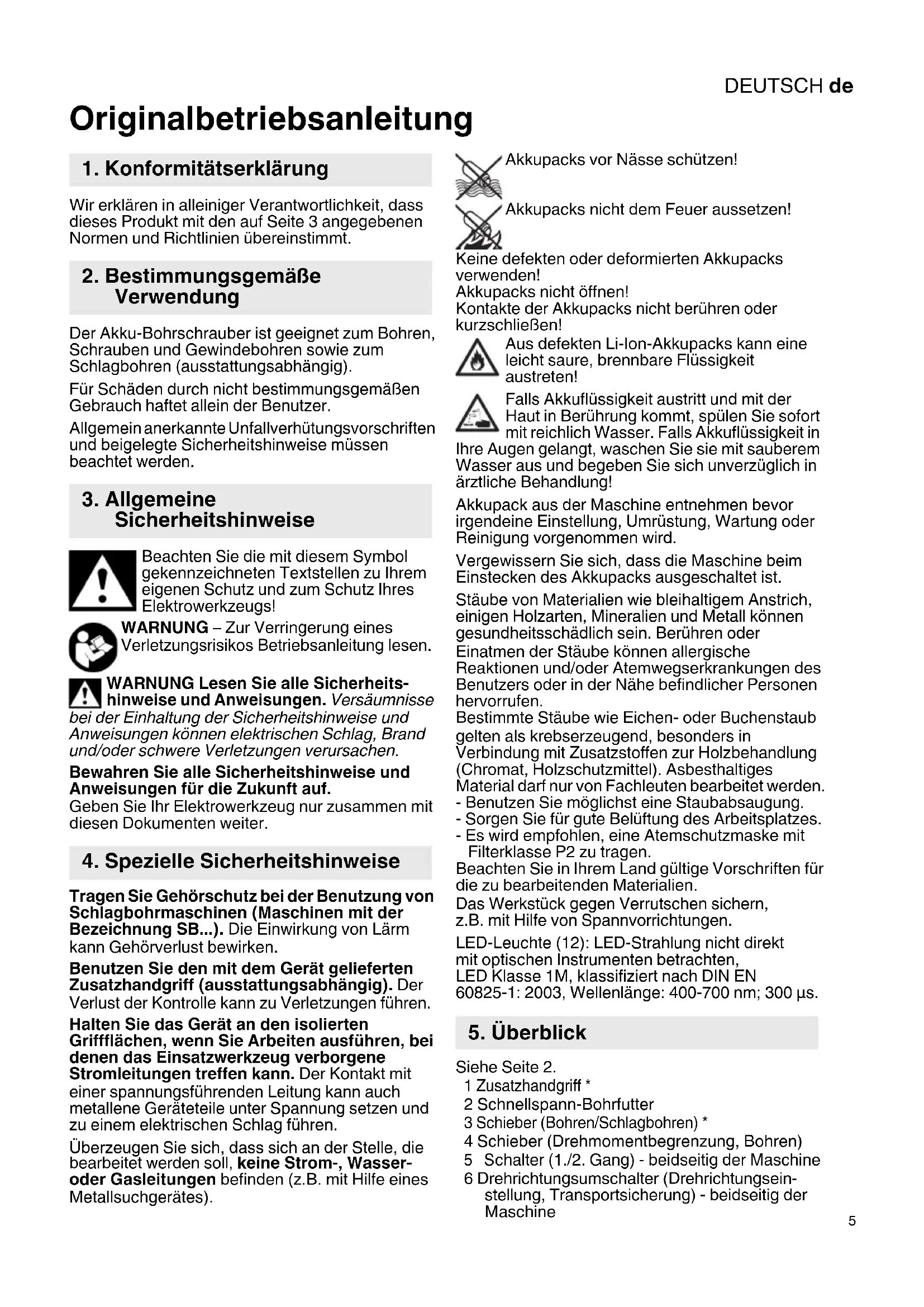 Originalbetriebsanleitung Wir erklären in alleiniger Verantwortlichkeit, dass dieses Produkt mit den auf Seite 3 angegebenen Normen und Richtlinien übereinstimmt. Der Akku-Bohrschrauber ist geeignet zum Bohren, Schrauben und Gewindebohren sowie zum Schlagbohren (ausstattungsabhängig). Für Schäden durch nicht bestimmungsgemäßen Gebrauch haftet allein der Benutzer. Allgemein anerkannte Unfallverhütungsvorschriften und beigelegte Sicherheitshinweise müssen beachtet werden. Beachten Sie die mit diesem Symbol gekennzeichneten Textstellen zu Ihrem eigenen Schutz und zum Schutz Ihres Elektrowerkzeugs! WARNUNG – Zur Verringerung eines Verletzungsrisikos Betriebsanleitung lesen. WARNUNG Lesen Sie alle Sicherheits- hinweise und Anweisungen. Versäumnisse bei der Einhaltung der Sicherheitshinweise und Anweisungen können elektrischen Schlag, Brand und/oder schwere Verletzungen verursachen. Bewahren Sie alle Sicherheitshinweise und Anweisungen für die Zukunft auf. Geben Sie Ihr Elektrowerkzeug nur zusammen mit diesen Dokumenten weiter. Tragen Sie Gehörschutz bei der Benutzung von Schlagbohrmaschinen (Maschinen mit der Bezeichnung SB...). Die Einwirkung von Lärm kann Gehörverlust bewirken. Benutzen Sie den mit dem Gerät gelieferten Zusatzhandgriff (ausstattungsabhängig). Der Verlust der Kontrolle kann zu Verletzungen führen. Halten Sie das Gerät an den isolierten Griffflächen, wenn Sie Arbeiten ausführen, bei denen das Einsatzwerkzeug verborgene Stromleitungen treffen kann. Der Kontakt mit einer spannungsführenden Leitung kann auch metallene Geräteteile unter Spannung setzen und zu einem elektrischen Schlag führen. Überzeugen Sie sich, dass sich an der Stelle, die bearbeitet werden soll, keine Strom-, Wasser- oder Gasleitungen befinden (z.B. mit Hilfe eines Metallsuchgerätes). Akkupacks vor Nässe schützen! Akkupacks nicht dem Feuer aussetzen! Keine defekten oder deformierten Akkupacks verwenden! Akkupacks nicht öffnen! Kontakte der Akkupacks nicht berühren oder kurzschließen! Aus defekten Li-Ion-Akkupacks kann eine leicht saure, brennbare Flüssigkeit austreten! Falls Akkuflüssigkeit austritt und mit der Haut in Berührung kommt, spülen Sie sofort mit reichlich Wasser. Falls Akkuflüssigkeit in Ihre Augen gelangt, waschen Sie sie mit sauberem Wasser aus und begeben Sie sich unverzüglich in ärztliche Behandlung! Akkupack aus der Maschine entnehmen bevor irgendeine Einstellung, Umrüstung, Wartung oder Reinigung vorgenommen wird. Vergewissern Sie sich, dass die Maschine beim Einstecken des Akkupacks ausgeschaltet ist. Stäube von Materialien wie bleihaltigem Anstrich, einigen Holzarten, Mineralien und Metall können gesundheitsschädlich sein. Berühren oder Einatmen der Stäube können allergische Reaktionen und/oder Atemwegserkrankungen des Benutzers oder in der Nähe befindlicher Personen hervorrufen. Bestimmte Stäube wie Eichen- oder Buchenstaub gelten als krebserzeugend, besonders in Verbindung mit Zusatzstoffen zur Holzbehandlung (Chromat, Holzschutzmittel). Asbesthaltiges Material darf nur von Fachleuten bearbeitet werden. - Benutzen Sie möglichst eine Staubabsaugung. - Sorgen Sie für gute Belüftung des Arbeitsplatzes. - Es wird empfohlen, eine Atemschutzmaske mit Filterklasse P2 zu tragen. Beachten Sie in Ihrem Land gültige Vorschriften für die zu bearbeitenden Materialien. Das Werkstück gegen Verrutschen sichern, z.B. mit Hilfe von Spannvorrichtungen. LED-Leuchte (12): LED-Strahlung nicht direkt mit optischen Instrumenten betrachten, LED Klasse 1M, klassifiziert nach DIN EN 60825-1: 2003, Wellenlänge: 400-700 nm; 300 µs. Siehe Seite 2. 1 Zusatzhandgriff * 2 Schnellspann-Bohrfutter 3 Schieber (Bohren/Schlagbohren) * 4 Schieber (Drehmomentbegrenzung, Bohren)
