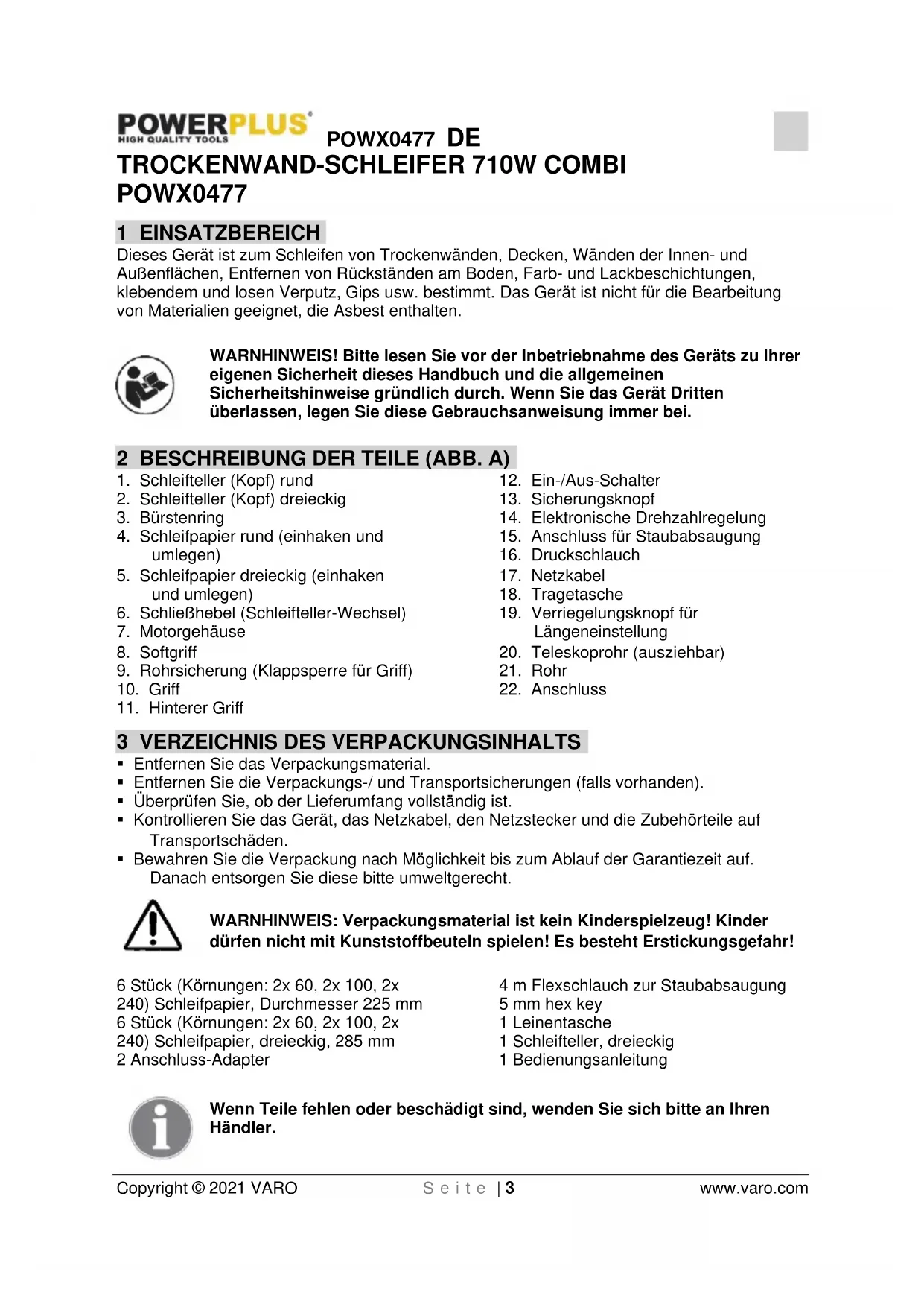 2 Anschluss-Adapter 4 m Flexschlauch zur Staubabsaugung 5 mm hex key 1 Leinentasche 1 Schleifteller, dreieckig 1 Bedienungsanleitung Wenn Teile fehlen oder beschädigt sind, wenden Sie sich bitte an Ihren Händler.POWX0477 DE Copyright © 2021 VARO S e i t e | 4 www.varo.com