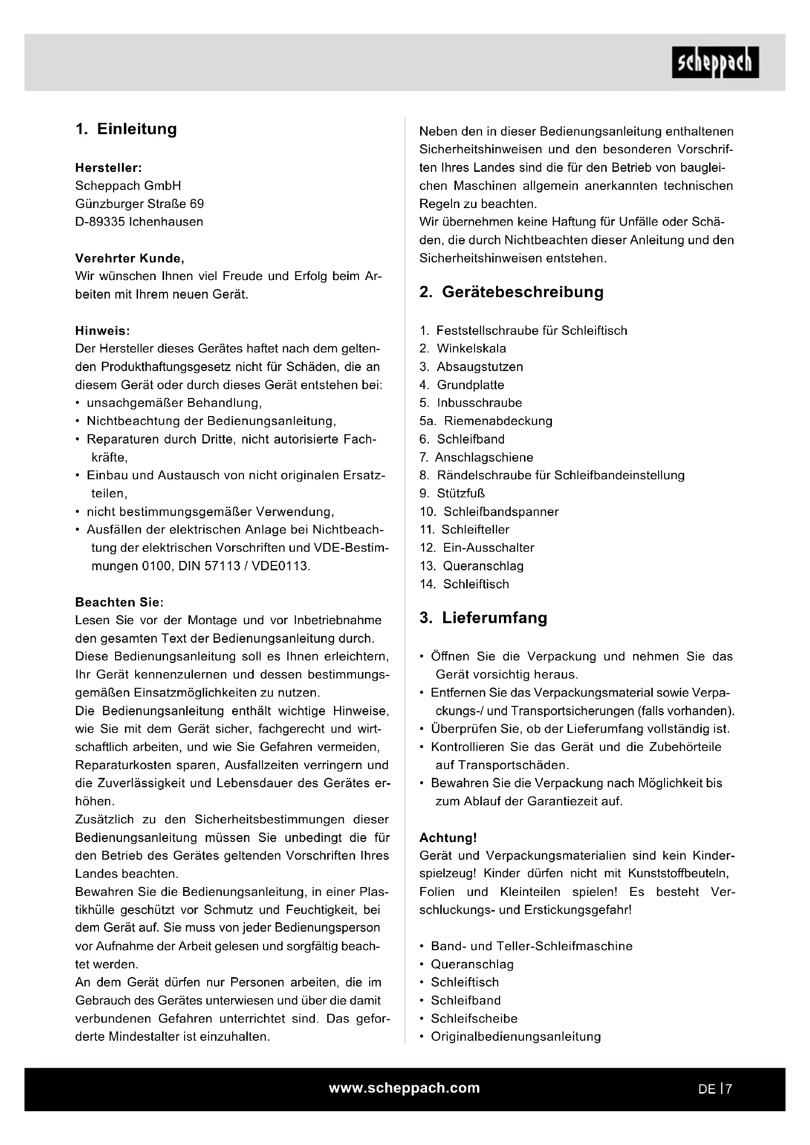 Hersteller: Scheppach GmbH Günzburger Straße 69 D-89335 Ichenhausen Verehrter Kunde, Wir wünschen Ihnen viel Freude und Erfolg beim Ar- beiten mit Ihrem neuen Gerät. Hinweis: Der Hersteller dieses Gerätes haftet nach dem gelten- den Produkthaftungsgesetz nicht für Schäden, die an diesem Gerät oder durch dieses Gerät entstehen bei: