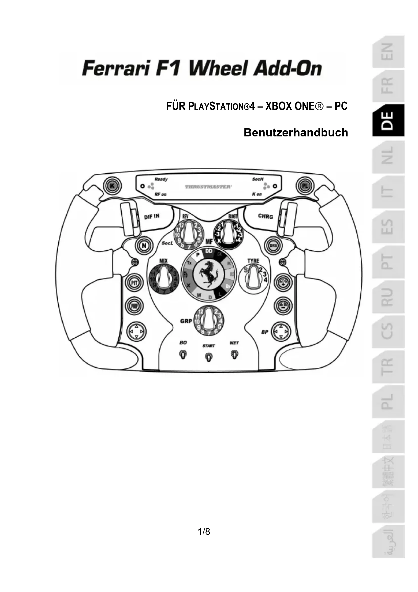 Laden Sie die Anleitung für Ihr Controller kostenlos im PDF-Format! Finden Sie Ihr Handbuch Ferrari F1 Wheel AddOn - THRUSTMASTER und nehmen Sie Ihr elektronisches Gerät wieder in die Hand. Auf dieser Seite sind alle Dokumente veröffentlicht, die für die Verwendung Ihres Geräts notwendig sind. Ferrari F1 Wheel AddOn von der Marke THRUSTMASTER.