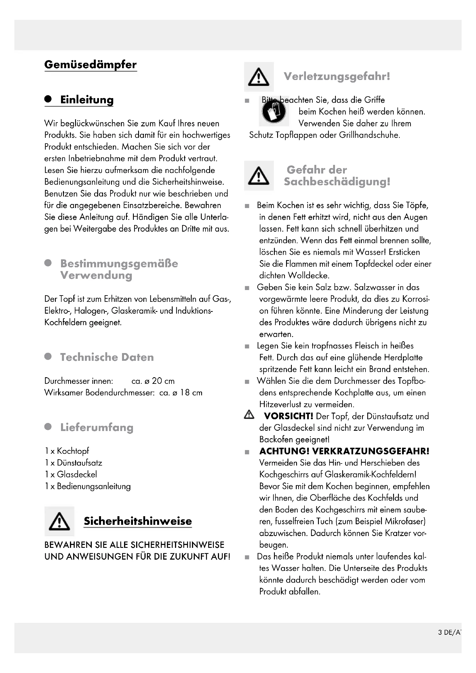Lieferumfang 1 x Kochtopf 1 x Dünstaufsatz 1 x Glasdeckel 1 x Bedienungsanleitung Sicherheitshinweise