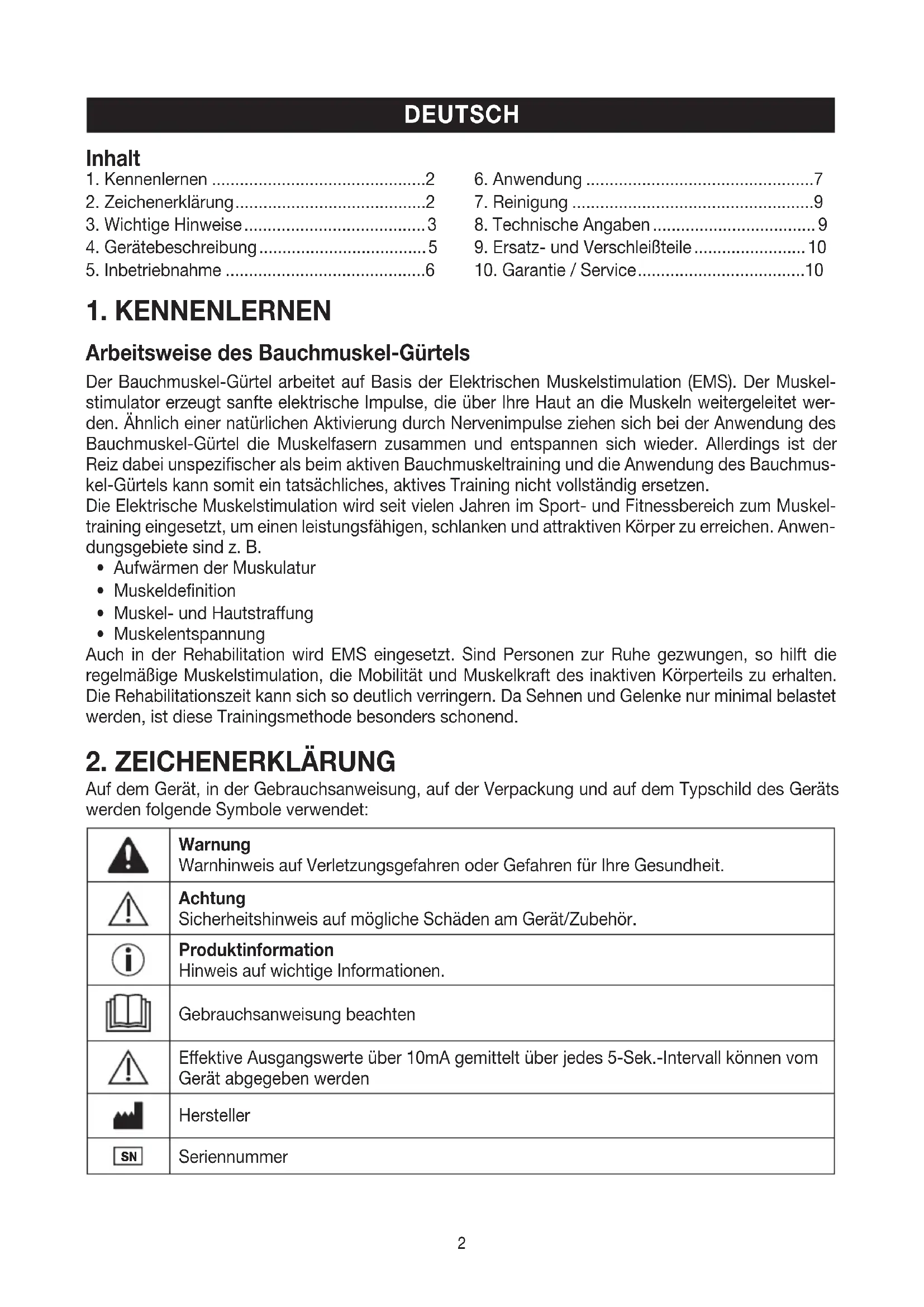 Auf dem Gerät, in der Gebrauchsanweisung, auf der Verpackung und auf dem Typschild des Geräts werden folgende Symbole verwendet: Warnung Warnhinweis auf Verletzungsgefahren oder Gefahren für Ihre Gesundheit. Achtung Sicherheitshinweis auf mögliche Schäden am Gerät/Zubehör. Produktinformation Hinweis auf wichtige Informationen. Gebrauchsanweisung beachten Eektive Ausgangswerte über 10mA gemittelt über jedes 5-Sek.-Intervall können vom Gerät abgegeben werden Hersteller