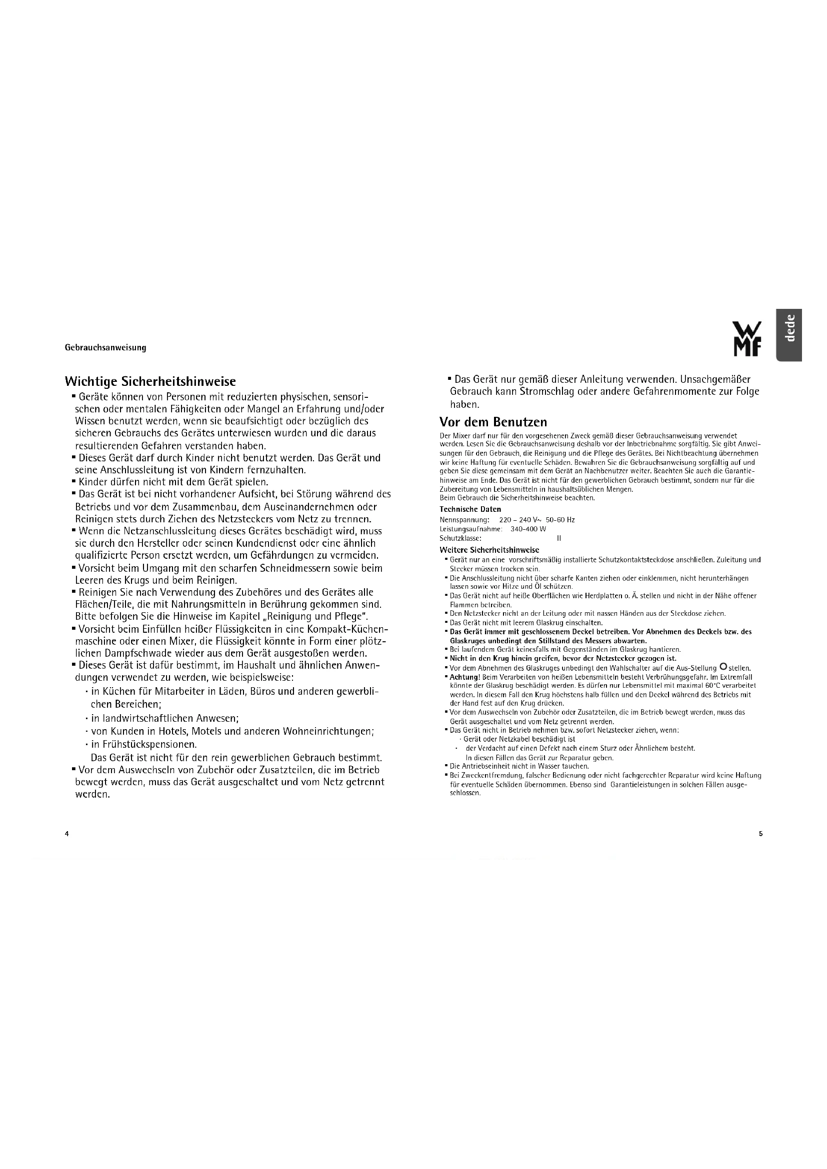 - Das Gerät nur gemäß dieser Anleitung verwenden. Unsachgemäßer Gebrauch kann Stromschlag oder andere Gefahrenmomente zur Folge haben. Vor dem Benutzen Der Mixer darf nur für den vorgesehenen Zweck gemäß dieser Gebrauchsanweisung verwendet werden. Lesen Sie die Gebrauchsanweisung deshalb vor der Inbetriebnahme sorgfältig. Sie gibt Anwei- sungen für den Gebrauch, die Reinigung und die Pflege des Gerätes. Bei Nichtbeachtung übernehmen wir keine Haftung für eventuelle Schäden. Bewahren Sie die Gebrauchsanweisung sorgfältig auf und geben Sie diese gemeinsam mit dem Gerät an Nachbenutzer weiter. Beachten Sie auch die Garantie- hinweise am Ende. Das Gerät ist nicht für den gewerblichen Gebrauch bestimmt, sondern nur für die Zubereitung von Lebensmitteln in haushaltsüblichen Mengen. Beim Gebrauch die Sicherheitshinweise beachten. Technische Daten Nennspannung: 220 – 240 V~ 50-60 Hz Leistungsaufnahme: 340-400 W Schutzklasse: II Weitere Sicherheitshinweise