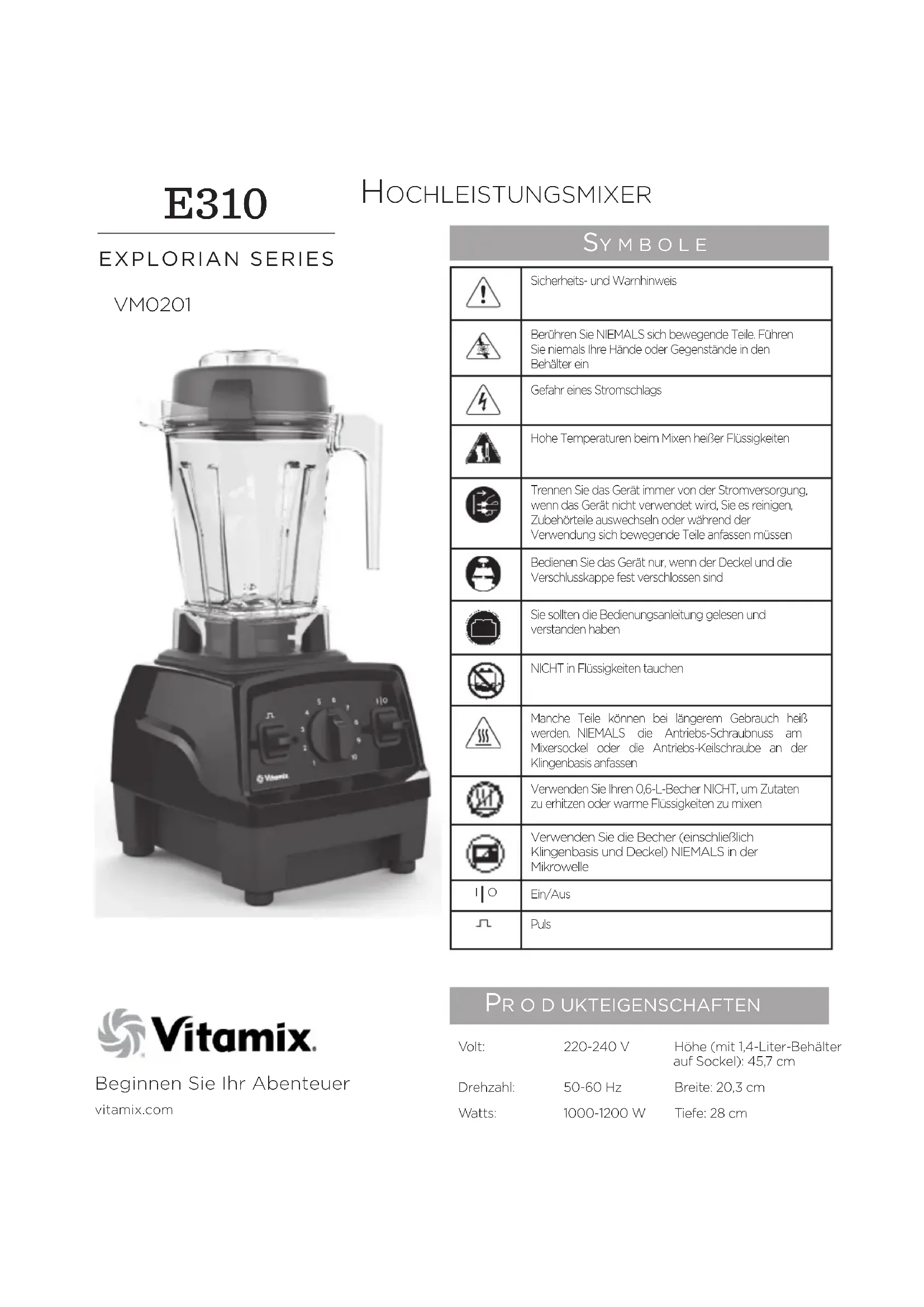 4Homes FZCO PO Box 61379, Dubai UAE. Tel: +971 4 3807611 Fax: +971 4 387612 4homes@4homes.ae www.tavolashop.com UNITED ARAB EMIRATES 4Homes FZCO PO Box 61379, Dubai UAE. Tel: +971 4 3807611 Fax: +971 4 387612 4homes@4homes.ae www.tavolashop.com AUSTRALIA & NEW ZEALAND Vitamix ANZ Pty Limited 167 King St Newcastle NSW2300 Australia Tel: 1-800-766437 (AUS) Tel: 050-853-0697 (NZ) www.vitamix.com.au www.vitamix.co.nzBeginnen Sie Ihr Abenteuervitamix.comVM0201 Sy m b o l e Sicherheits- und WarnhinweisBerühren Sie NIEMALS sich bewegende Teile. Führen Sie niemals Ihre Hände oder Gegenstände in den Behälter einGefahr eines StromschlagsHohe Temperaturen beim Mixen heißer FlüssigkeitenTrennen Sie das Gerät immer von der Stromversorgung, wenn das Gerät nicht verwendet wird, Sie es reinigen, Zubehörteile auswechseln oder während der Verwendung sich bewegende Teile anfassen müssenBedienen Sie das Gerät nur, wenn der Deckel und die Verschlusskappe fest verschlossen sindSie sollten die Bedienungsanleitung gelesen und verstanden habenNICHT in Flüssigkeiten tauchenManche Teile können bei längerem Gebrauch heiß werden. NIEMALS die Antriebs-Schraubnuss am Mixersockel oder die Antriebs-Keilschraube an der Klingenbasis anfassenVerwenden Sie Ihren 0,6-L-Becher NICHT, um Zutaten zu erhitzen oder warme Flüssigkeiten zu mixen Verwenden Sie die Becher (einschließlich Klingenbasis und Deckel) NIEMALS in der MikrowelleI OEin/Aus Puls HOCHLEIstuNGsMIxER pr o d uKteigenSchaften E310 EXPLORIAN SERIES Volt: 220-240V Höhe (mit 1,4-Liter-Behälter auf Sockel): 45,7cm Drehzahl: 50-60 Hz Breite: 20,3cm Watts: 1000-1200 W Tiefe: 28cm12