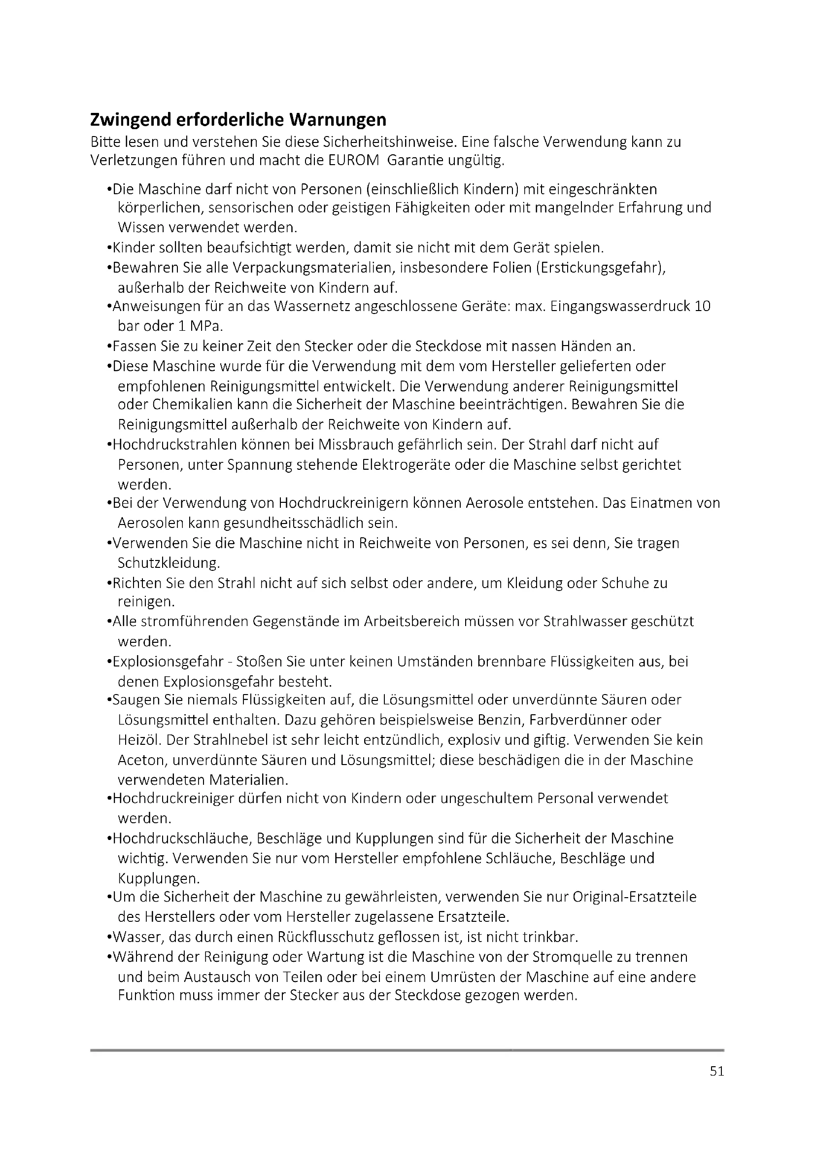 Bitte lessen und verstehen Sie diese Sicherheitshinweise. Eine falsche Verwendung kann zu Verletzungen führen und macht die EUROM Garantie ungültig.