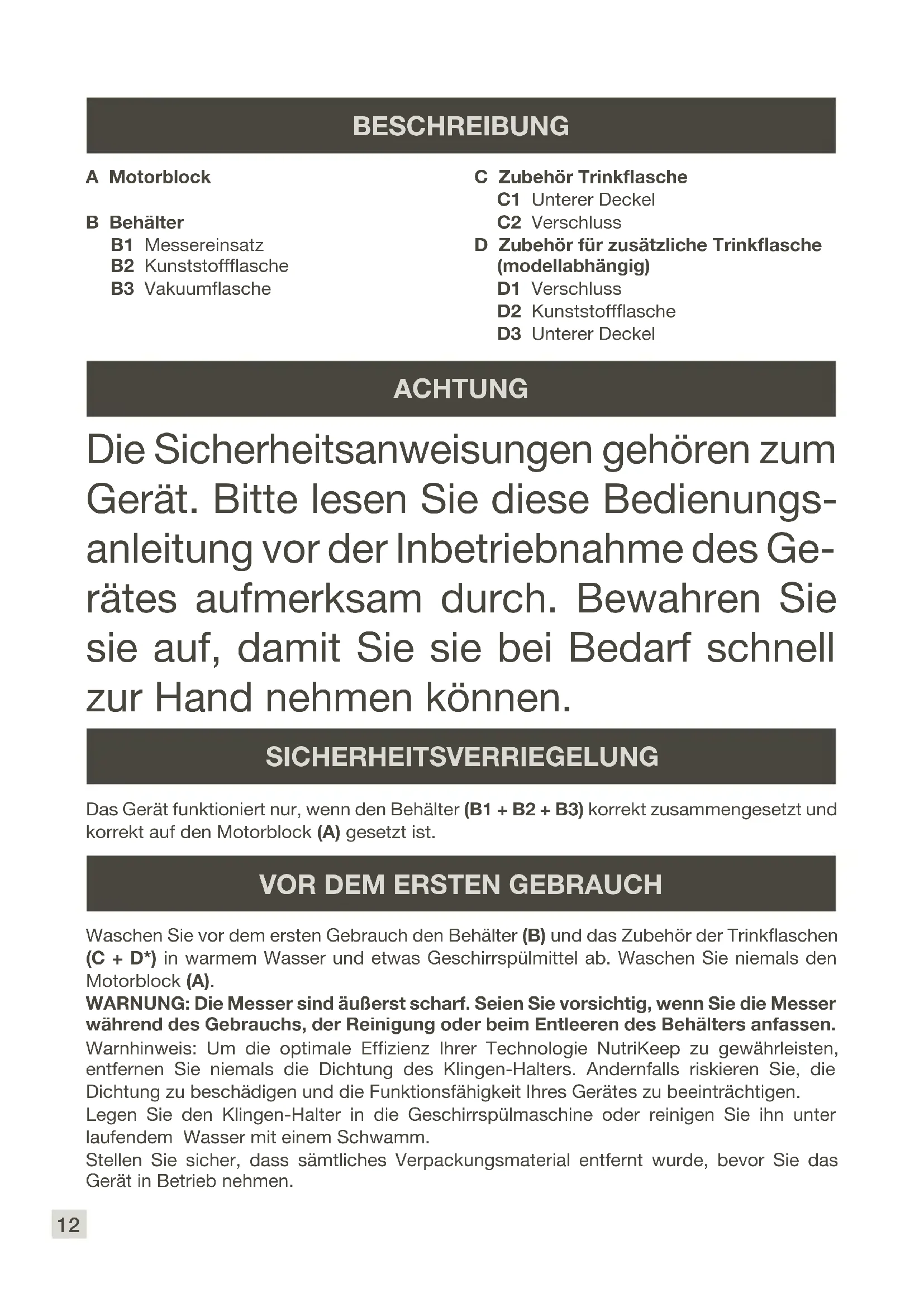 | Pflege | Schüssel und Zubehör spülmaschinenfest |