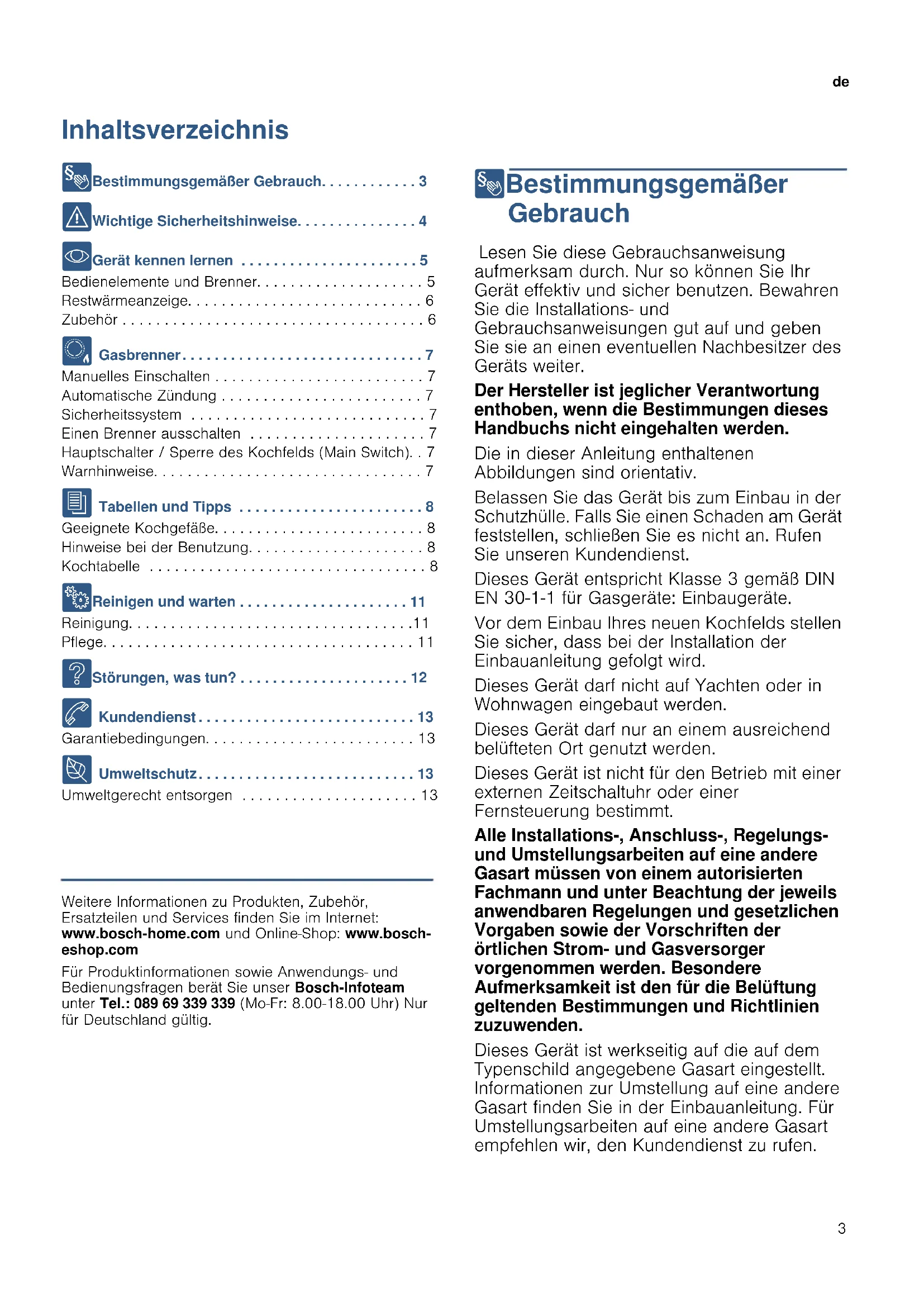 - Gerät kennen lernen . . . . . . . . . . . . . . . . . . . . . . 5 Bedienelemente und Brenner. . . . . . . . . . . . . . . . . . . . 5 Restwärmeanzeige. . . . . . . . . . . . . . . . . . . . . . . . . . . . 6 Zubehör . . . . . . . . . . . . . . . . . . . . . . . . . . . . . . . . . . . . 6 Ä Gasbrenner. . . . . . . . . . . . . . . . . . . . . . . . . . . . . . 7 Manuelles Einschalten . . . . . . . . . . . . . . . . . . . . . . . . . 7 Automatische Zündung . . . . . . . . . . . . . . . . . . . . . . . . 7 Sicherheitssystem . . . . . . . . . . . . . . . . . . . . . . . . . . . . 7 Einen Brenner ausschalten . . . . . . . . . . . . . . . . . . . . . 7 Hauptschalter / Sperre des Kochfelds (Main Switch). . 7 Warnhinweise. . . . . . . . . . . . . . . . . . . . . . . . . . . . . . . . 7 J Tabellen und Tipps . . . . . . . . . . . . . . . . . . . . . . . 8 Geeignete Kochgefäße. . . . . . . . . . . . . . . . . . . . . . . . . 8 Hinweise bei der Benutzung. . . . . . . . . . . . . . . . . . . . . 8 Kochtabelle . . . . . . . . . . . . . . . . . . . . . . . . . . . . . . . . . 8 2 Reinigen und warten . . . . . . . . . . . . . . . . . . . . . 11 Reinigung. . . . . . . . . . . . . . . . . . . . . . . . . . . . . . . . . .11 Pflege. . . . . . . . . . . . . . . . . . . . . . . . . . . . . . . . . . . . . 11 3 Störungen, was tun? . . . . . . . . . . . . . . . . . . . . . 12 4 Kundendienst . . . . . . . . . . . . . . . . . . . . . . . . . . . 13 Garantiebedingungen. . . . . . . . . . . . . . . . . . . . . . . . . 13 7 Umweltschutz. . . . . . . . . . . . . . . . . . . . . . . . . . . 13 Umweltgerecht entsorgen . . . . . . . . . . . . . . . . . . . . . 13 Produktinfo Weitere Informationen zu Produkten, Zubehör, Ersatzteilen und Services finden Sie im Internet: www.bosch-home.com und Online-Shop: www.bosch- eshop.com Für Produktinformationen sowie Anwendungs- und Bedienungsfragen berät Sie unser Bosch-Infoteam unter Tel.: 089 69 339 339 (Mo-Fr: 8.00-18.00 Uhr) Nur für Deutschland gültig. 8Bestimmungsgemäßer Gebrauch Be s t i mmungsgemäßer Gebr auch Lesen Sie diese Gebrauchsanweisung aufmerksam durch. Nur so können Sie Ihr Gerät effektiv und sicher benutzen. Bewahren Sie die Installations- und Gebrauchsanweisungen gut auf und geben Sie sie an einen eventuellen Nachbesitzer des Geräts weiter. Der Hersteller ist jeglicher Verantwortung enthoben, wenn die Bestimmungen dieses Handbuchs nicht eingehalten werden. Die in dieser Anleitung enthaltenen Abbildungen sind orientativ. Belassen Sie das Gerät bis zum Einbau in der Schutzhülle. Falls Sie einen Schaden am Gerät feststellen, schließen Sie es nicht an. Rufen Sie unseren Kundendienst. Dieses Gerät entspricht Klasse 3 gemäß DIN EN 30-1-1 für Gasgeräte: Einbaugeräte. Vor dem Einbau Ihres neuen Kochfelds stellen Sie sicher, dass bei der Installation der Einbauanleitung gefolgt wird. Dieses Gerät darf nicht auf Yachten oder in Wohnwagen eingebaut werden. Dieses Gerät darf nur an einem ausreichend belüfteten Ort genutzt werden. Dieses Gerät ist nicht für den Betrieb mit einer externen Zeitschaltuhr oder einer Fernsteuerung bestimmt. Alle Installations-, Anschluss-, Regelungs- und Umstellungsarbeiten auf eine andere Gasart müssen von einem autorisierten Fachmann und unter Beachtung der jeweils anwendbaren Regelungen und gesetzlichen Vorgaben sowie der Vorschriften der örtlichen Strom- und Gasversorger vorgenommen werden. Besondere Aufmerksamkeit ist den für die Belüftung geltenden Bestimmungen und Richtlinien zuzuwenden. Dieses Gerät ist werkseitig auf die auf dem Typenschild angegebene Gasart eingestellt. Informationen zur Umstellung auf eine andere Gasart finden Sie in der Einbauanleitung. Für Umstellungsarbeiten auf eine andere Gasart empfehlen wir, den Kundendienst zu rufen.de Wichtige Sicherheitshinweise