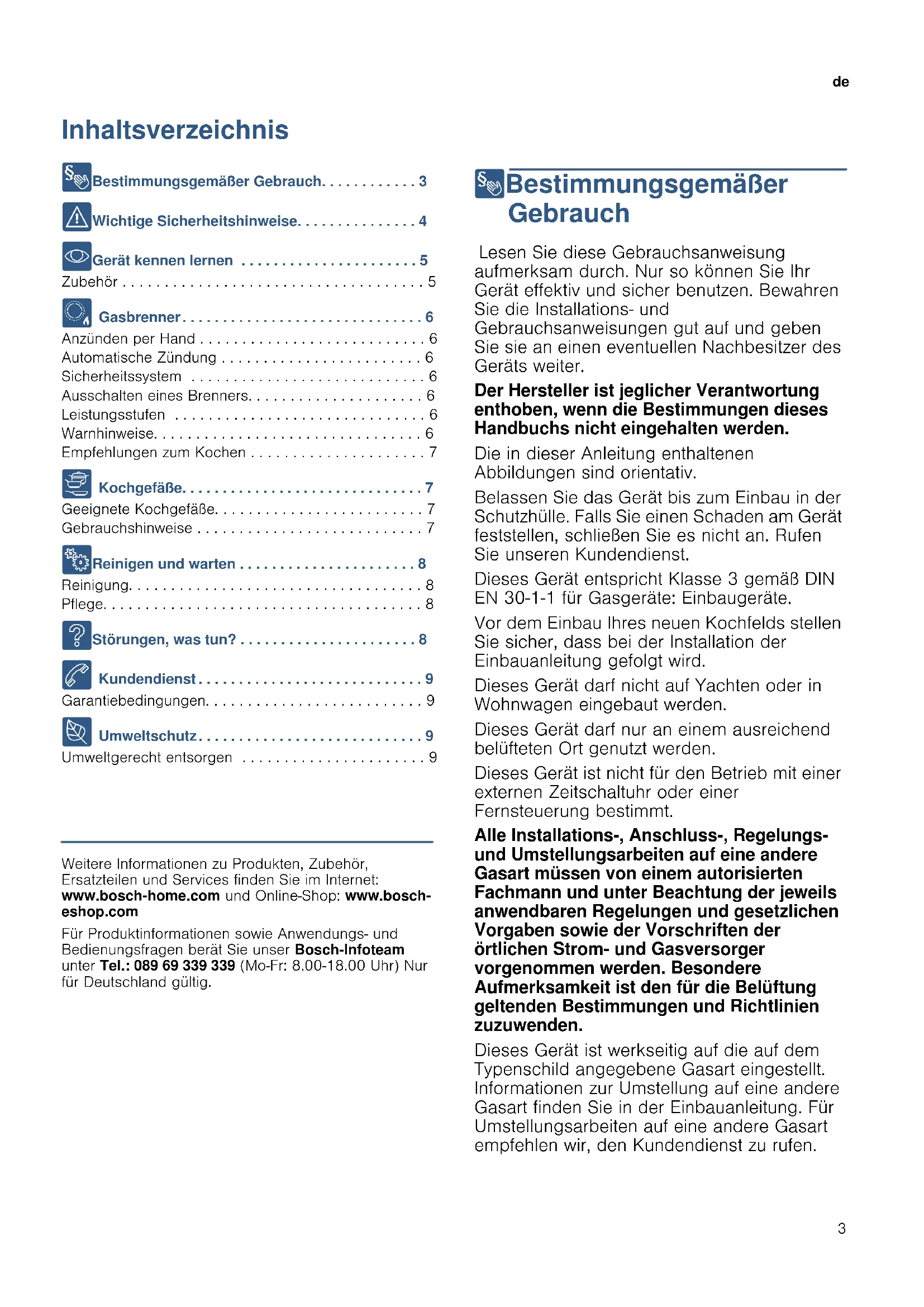 - Gerät kennen lernen . . . . . . . . . . . . . . . . . . . . . . 5 Zubehör . . . . . . . . . . . . . . . . . . . . . . . . . . . . . . . . . . . . 5 Ä Gasbrenner. . . . . . . . . . . . . . . . . . . . . . . . . . . . . . 6 Anzünden per Hand . . . . . . . . . . . . . . . . . . . . . . . . . . . 6 Automatische Zündung . . . . . . . . . . . . . . . . . . . . . . . . 6 Sicherheitssystem . . . . . . . . . . . . . . . . . . . . . . . . . . . . 6 Ausschalten eines Brenners. . . . . . . . . . . . . . . . . . . . . 6 Leistungsstufen . . . . . . . . . . . . . . . . . . . . . . . . . . . . . . 6 Warnhinweise. . . . . . . . . . . . . . . . . . . . . . . . . . . . . . . . 6 Empfehlungen zum Kochen . . . . . . . . . . . . . . . . . . . . . 7 Å Kochgefäße. . . . . . . . . . . . . . . . . . . . . . . . . . . . . . 7 Geeignete Kochgefäße. . . . . . . . . . . . . . . . . . . . . . . . . 7 Gebrauchshinweise . . . . . . . . . . . . . . . . . . . . . . . . . . . 7 2 Reinigen und warten . . . . . . . . . . . . . . . . . . . . . . 8 Reinigung. . . . . . . . . . . . . . . . . . . . . . . . . . . . . . . . . . . 8 Pflege. . . . . . . . . . . . . . . . . . . . . . . . . . . . . . . . . . . . . . 8 3 Störungen, was tun? . . . . . . . . . . . . . . . . . . . . . . 8 4 Kundendienst . . . . . . . . . . . . . . . . . . . . . . . . . . . . 9 Garantiebedingungen. . . . . . . . . . . . . . . . . . . . . . . . . . 9 7 Umweltschutz. . . . . . . . . . . . . . . . . . . . . . . . . . . . 9 Umweltgerecht entsorgen . . . . . . . . . . . . . . . . . . . . . . 9 Produktinfo Weitere Informationen zu Produkten, Zubehör, Ersatzteilen und Services finden Sie im Internet: www.bosch-home.com und Online-Shop: www.bosch- eshop.com Für Produktinformationen sowie Anwendungs- und Bedienungsfragen berät Sie unser Bosch-Infoteam unter Tel.: 089 69 339 339 (Mo-Fr: 8.00-18.00 Uhr) Nur für Deutschland gültig. 8Bestimmungsgemäßer Gebrauch Be s t i mmungsgemäßer Gebr auch Lesen Sie diese Gebrauchsanweisung aufmerksam durch. Nur so können Sie Ihr Gerät effektiv und sicher benutzen. Bewahren Sie die Installations- und Gebrauchsanweisungen gut auf und geben Sie sie an einen eventuellen Nachbesitzer des Geräts weiter. Der Hersteller ist jeglicher Verantwortung enthoben, wenn die Bestimmungen dieses Handbuchs nicht eingehalten werden. Die in dieser Anleitung enthaltenen Abbildungen sind orientativ. Belassen Sie das Gerät bis zum Einbau in der Schutzhülle. Falls Sie einen Schaden am Gerät feststellen, schließen Sie es nicht an. Rufen Sie unseren Kundendienst. Dieses Gerät entspricht Klasse 3 gemäß DIN EN 30-1-1 für Gasgeräte: Einbaugeräte. Vor dem Einbau Ihres neuen Kochfelds stellen Sie sicher, dass bei der Installation der Einbauanleitung gefolgt wird. Dieses Gerät darf nicht auf Yachten oder in Wohnwagen eingebaut werden. Dieses Gerät darf nur an einem ausreichend belüfteten Ort genutzt werden. Dieses Gerät ist nicht für den Betrieb mit einer externen Zeitschaltuhr oder einer Fernsteuerung bestimmt. Alle Installations-, Anschluss-, Regelungs- und Umstellungsarbeiten auf eine andere Gasart müssen von einem autorisierten Fachmann und unter Beachtung der jeweils anwendbaren Regelungen und gesetzlichen Vorgaben sowie der Vorschriften der örtlichen Strom- und Gasversorger vorgenommen werden. Besondere Aufmerksamkeit ist den für die Belüftung geltenden Bestimmungen und Richtlinien zuzuwenden. Dieses Gerät ist werkseitig auf die auf dem Typenschild angegebene Gasart eingestellt. Informationen zur Umstellung auf eine andere Gasart finden Sie in der Einbauanleitung. Für Umstellungsarbeiten auf eine andere Gasart empfehlen wir, den Kundendienst zu rufen.de Wichtige Sicherheitshinweise