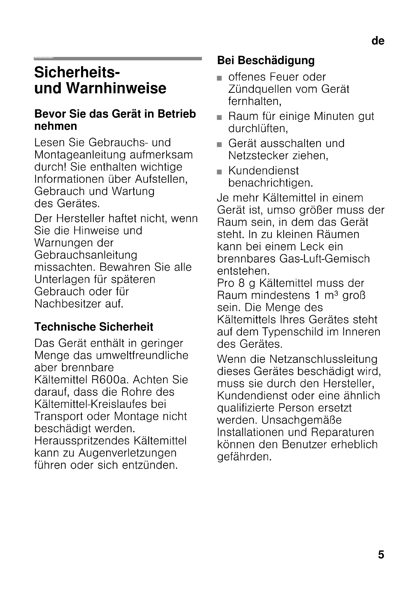 deInhaltsverzeichnis deGebrauchsanleitung Sicherheits- und Warnhinweise Bevor Sie das Gerät in Betrieb nehmen Lesen Sie Gebrauchs- und Montageanleitung aufmerksam durch! Sie enthalten wichtige Informationen über Aufstellen, Gebrauch und Wartung des Gerätes. Der Hersteller haftet nicht, wenn Sie die Hinweise und Warnungen der Gebrauchsanleitung missachten. Bewahren Sie alle Unterlagen für späteren Gebrauch oder für Nachbesitzer auf. Technische Sicherheit Das Gerät enthält in geringer Menge das umweltfreundliche aber brennbare Kältemittel R600a. Achten Sie darauf, dass die Rohre des Kältemittel-Kreislaufes bei Transport oder Montage nicht beschädigt werden. Herausspritzendes Kältemittel kann zu Augenverletzungen führen oder sich entzünden. Bei Beschädigung ■ offenes Feuer oder Zündquellen vom Gerät fernhalten, ■ Raum für einige Minuten gut durchlüften, ■ Gerät ausschalten und Netzstecker ziehen, ■ Kundendienst benachrichtigen. Je mehr Kältemittel in einem Gerät ist, umso größer muss der Raum sein, in dem das Gerät steht. In zu kleinen Räumen kann bei einem Leck ein brennbares Gas-Luft-Gemisch entstehen. Pro 8 g Kältemittel muss der Raum mindestens 1 m³ groß sein. Die Menge des Kältemittels Ihres Gerätes steht auf dem Typenschild im Inneren des Gerätes. Wenn die Netzanschlussleitung dieses Gerätes beschädigt wird, muss sie durch den Hersteller, Kundendienst oder eine ähnlich qualifizierte Person ersetzt werden. Unsachgemäße Installationen und Reparaturen können den Benutzer erheblich gefährden.de