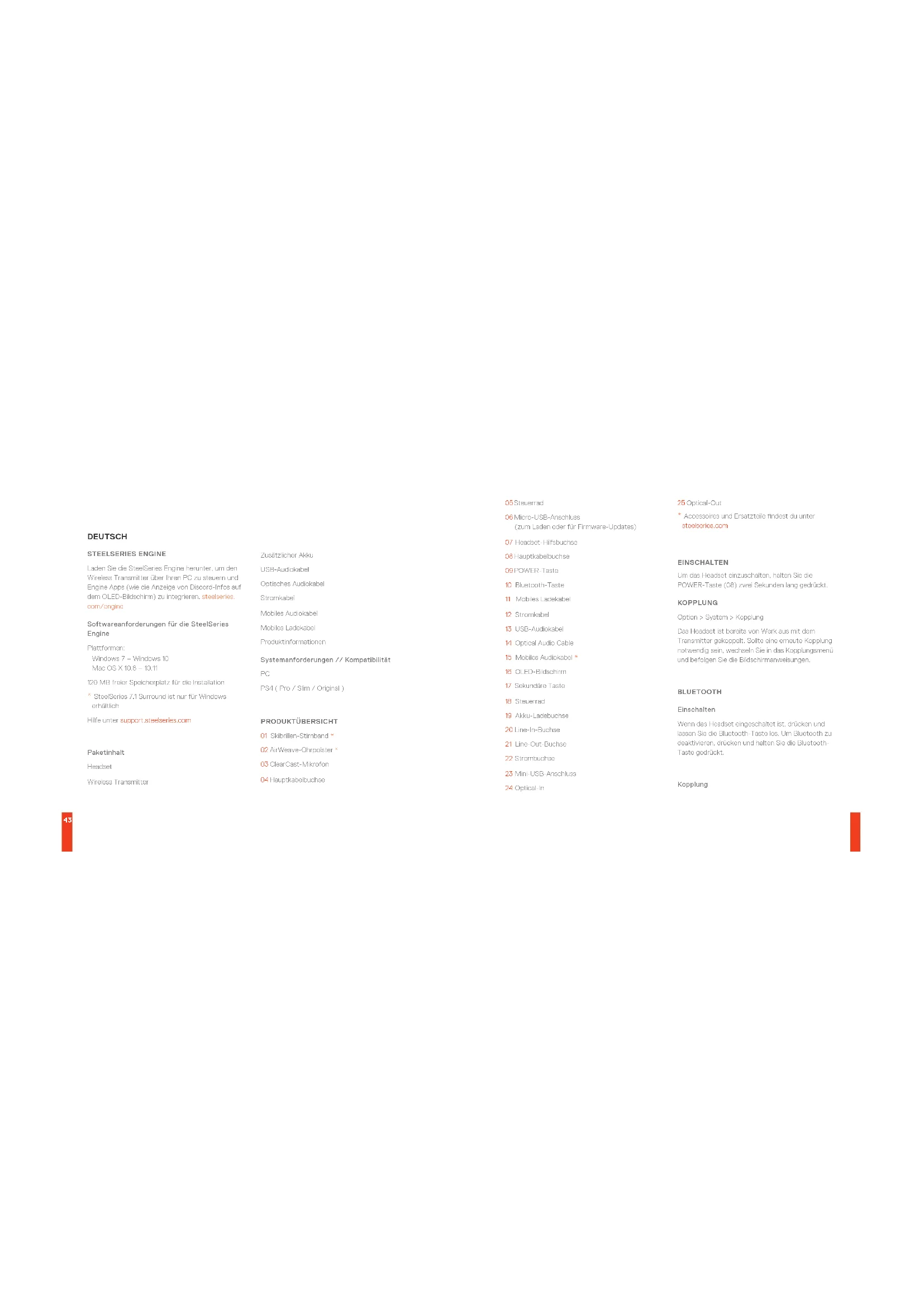 Accessoires und Ersatzteile ndest du unter steelseries.com EINSCHALTEN Um das Headset einzuschalten, halten Sie die POWER-Taste (08) zwei Sekunden lang gedrückt. KOPPLUNG Option > System > Kopplung Das Headset ist bereits von Werk aus mit dem Transmitter gekoppelt. Sollte eine erneute Kopplung notwendig sein, wechseln Sie in das Kopplungsmenü und befolgen Sie die Bildschirmanweisungen. BLUETOOTH Einschalten Wenn das Headset eingeschaltet ist, drücken und lassen Sie die Bluetooth-Taste los. Um Bluetooth zu deaktivieren, drücken und halten Sie die Bluetooth- Taste gedrückt. Kopplung45 46 Wenn Bluetooth deaktiviert ist, drücken und halten Sie die Bluetooth-Taste sechs Sekunden lang gedrückt. STEUERUNG