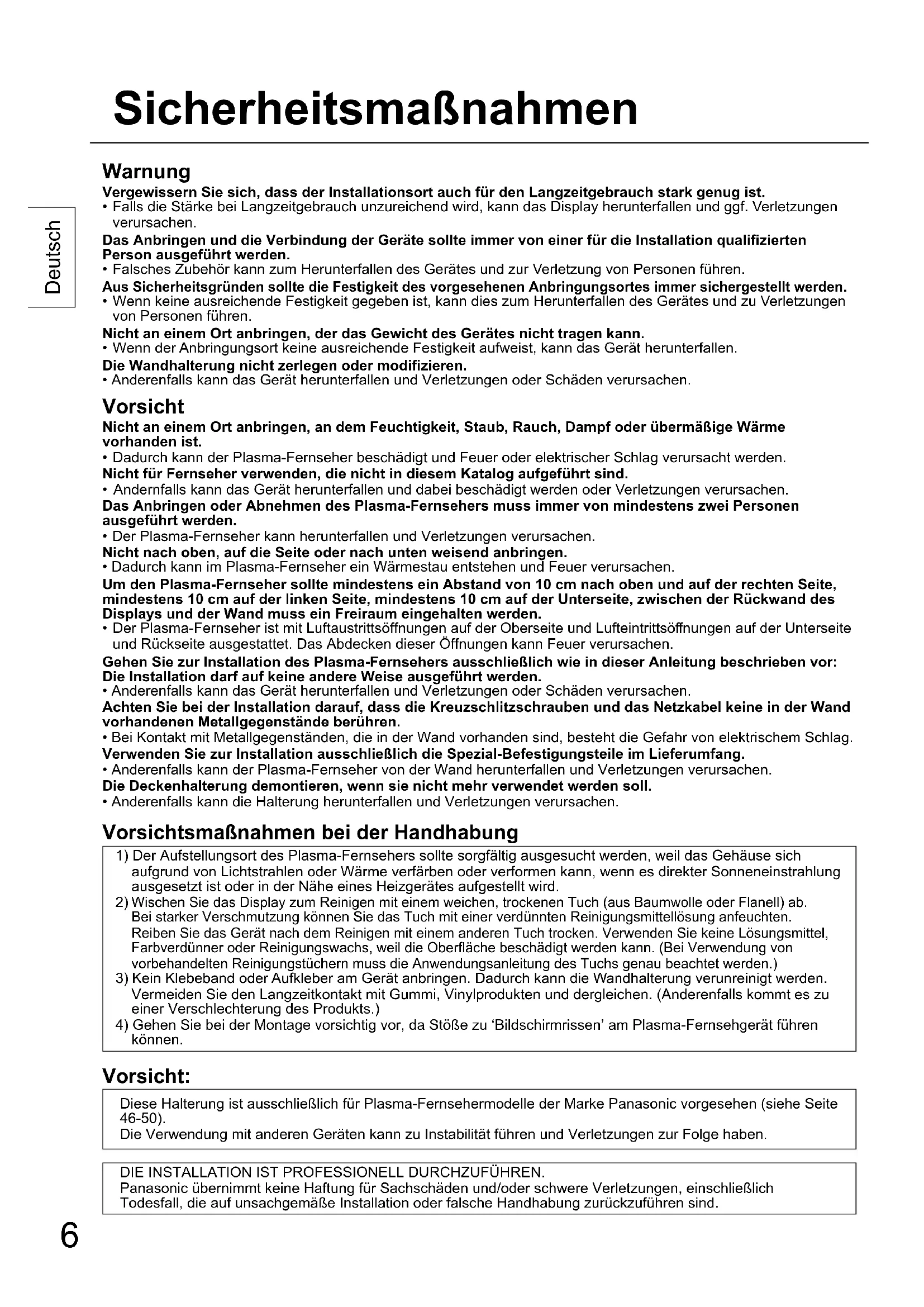 können. Vorsicht: Diese Halterung ist ausschließlich für Plasma-Fernsehermodelle der Marke Panasonic vorgesehen (siehe Seite 46-50). Die Verwendung mit anderen Geräten kann zu Instabilität führen und Verletzungen zur Folge haben. DIE INSTALLATION IST PROFESSIONELL DURCHZUFÜHREN. Panasonic übernimmt keine Haftung für Sachschäden und/oder schwere Verletzungen, einschließlich Todesfall, die auf unsachgemäße Installation oder falsche Handhabung zurückzuführen sind. Sicherheitsmaßnahmen TY-WK42PR4WTQZH993-34048.indb6TY-WK42PR4WTQZH993-34048.indb6 2008/04/0711:56:372008/04/0711:56:377 Deutsch