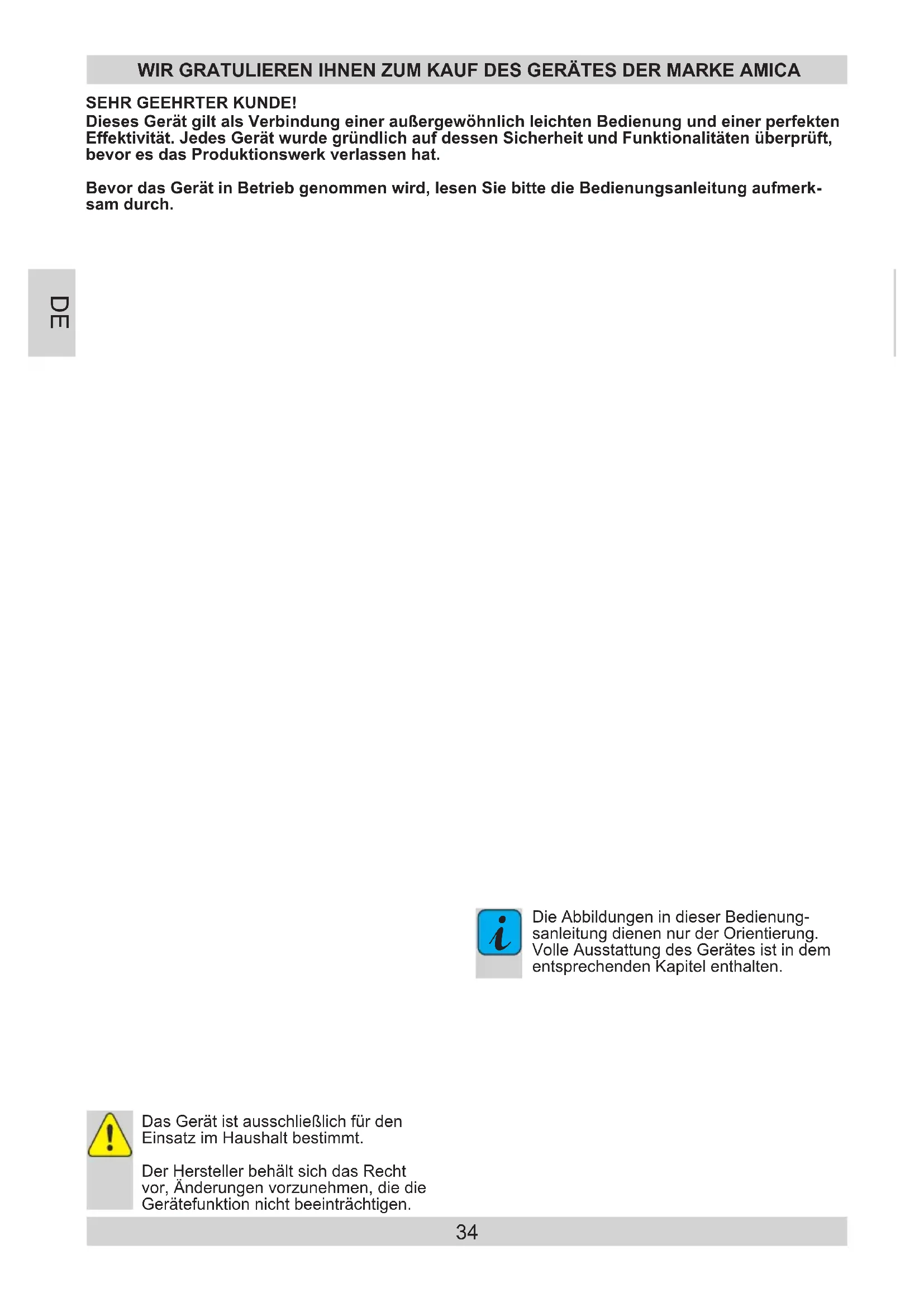 FR34 Das Gerät ist ausschließlich für den Einsatz im Haushalt bestimmt. Der Hersteller behält sich das Recht vor, Änderungen vorzunehmen, die die Gerätefunktion nicht beeinträchtigen.
