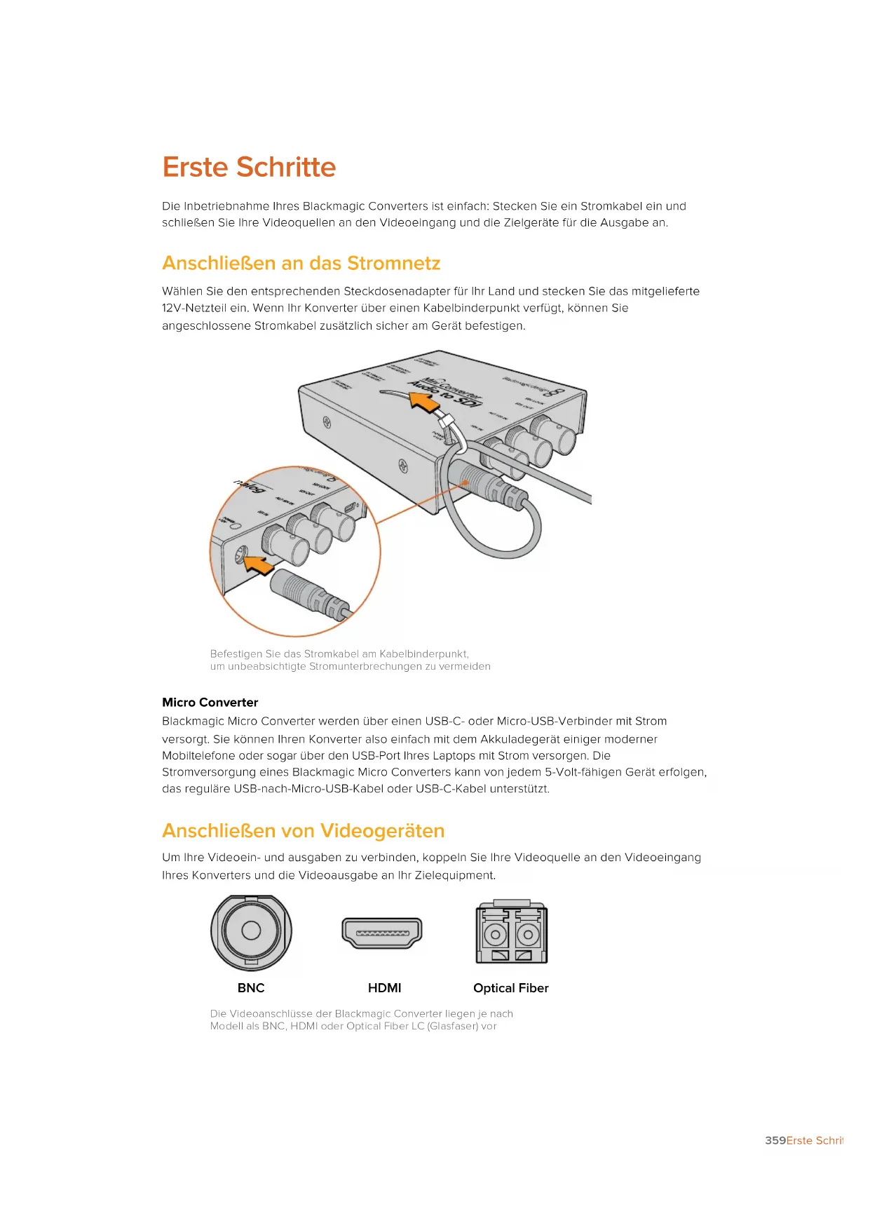 SDI IN POWER +12V SDI to Analog Befestigen Sie das Stromkabel am Kabelbinderpunkt, um unbeabsichtigte Stromunterbrechungen zu vermeiden Micro Converter Blackmagic Micro Converter werden über einen USB-C- oder Micro-USB-Verbinder mit Strom versorgt. Sie können Ihren Konverter also einfach mit dem Akkuladegerät einiger moderner Mobiltelefone oder sogar über den USB-Port Ihres Laptops mit Strom versorgen. Die Stromversorgung eines Blackmagic Micro Converters kann von jedem 5-Volt-fähigen Gerät erfolgen, das reguläre USB-nach-Micro-USB-Kabel oder USB-C-Kabel unterstützt. Anschließen von Videogeräten Um Ihre Videoein- und ausgaben zu verbinden, koppeln Sie Ihre Videoquelle an den Videoeingang Ihres Konverters und die Videoausgabe an Ihr Zielequipment. BNC HDMI Optical Fiber Die Videoanschlüsse der Blackmagic Converter liegen je nach Modell als BNC, HDMI oder Optical Fiber LC (Glasfaser) vor 359Erste SchritteGlasfaser-Steckverbinder Einige Blackmagic Converter Modelle haben eine SFP-Buchse für ein kompatibles SFP- Glasfasermodul, das 3G-, 6G und 12G-SDI-Video unterstützt. Das Modul ist ein optischer Sender und Empfänger mit Buchsen für Glasfaserkabel.