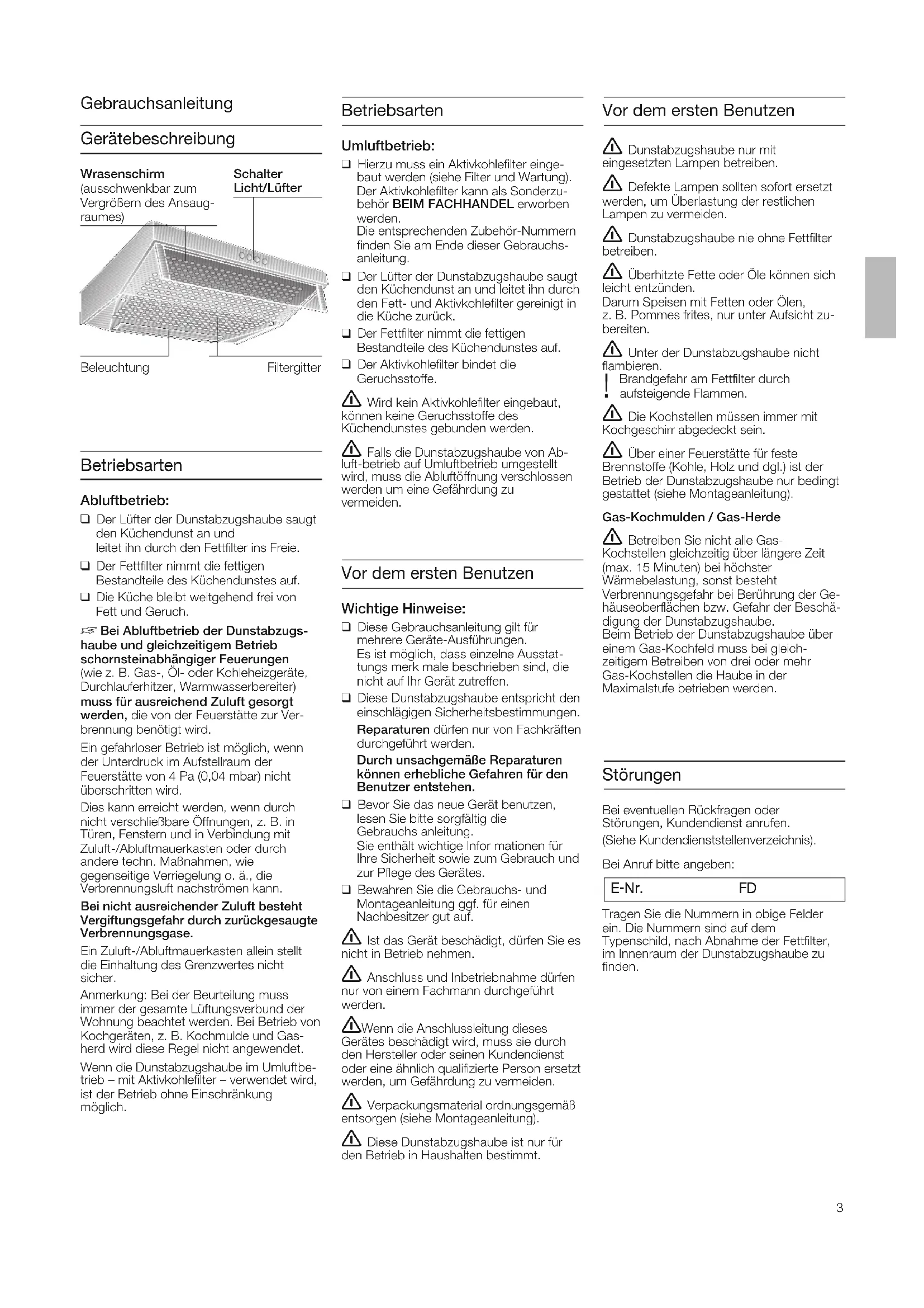 Abb. 13 Gerätebeschreibung Betriebsarten Betriebsarten Abluftbetrieb:K Der Lüfter der Dunstabzugshaube saugtden Küchendunst an und leitet ihn durch den Fettfilter ins Freie.K Der Fettfilter nimmt die fettigen Bestandteile des Küchendunstes auf.K Die Küche bleibt weitgehend frei vonFett und Geruch. Bei Abluftbetrieb der Dunstabzugs-haube und gleichzeitigem Betriebschornsteinabhängiger Feuerungen(wie z. B. Gas-, Öl- oder Kohleheizgeräte,Durchlauferhitzer, Warmwasserbereiter)muss für ausreichend Zuluft gesorgt werden, die von der Feuerstätte zur Ver-brennung benötigt wird.Ein gefahrloser Betrieb ist möglich, wennder Unterdruck im Aufstellraum der Feuerstätte von 4 Pa (0,04 mbar) nichtüberschritten wird.Dies kann erreicht werden, wenn durchnicht verschließbare Öffnungen, z. B. inTüren, Fenstern und in Verbindung mitZuluft-/Abluftmauerkasten oder durchandere techn. Maßnahmen, wie gegenseitige Verriegelung o. ä., die Verbrennungsluft nachströmen kann.Bei nicht ausreichender Zuluft bestehtVergiftungsgefahr durch zurückgesaugteVerbrennungsgase.Ein Zuluft-/Abluftmauerkasten allein stelltdie Einhaltung des Grenzwertes nichtsicher.Anmerkung: Bei der Beurteilung mussimmer der gesamte Lüftungsverbund derWohnung beachtet werden. Bei Betrieb vonKochgeräten, z. B. Kochmulde und Gas-herd wird diese Regel nicht angewendet.Wenn die Dunstabzugshaube im Umluftbe-trieb – mit Aktivkohlefilter – verwendet wird,ist der Betrieb ohne Einschränkung möglich.Umluftbetrieb:K Hierzu muss ein Aktivkohlefilter einge-baut werden (siehe Filter und Wartung).Der Aktivkohlefilter kann als Sonderzu-behör BEIM FACHHANDEL erworbenwerden.Die entsprechenden Zubehör-Nummernfinden Sie am Ende dieser Gebrauchs-anleitung.K Der Lüfter der Dunstabzugshaube saugtden Küchendunst an und leitet ihn durchden Fett- und Aktivkohlefilter gereinigt indie Küche zurück.K Der Fettfilter nimmt die fettigen Bestandteile des Küchendunstes auf.K Der Aktivkohlefilter bindet dieGeruchsstoffe. 몇 Wird kein Aktivkohlefilter eingebaut, können keine Geruchsstoffe des Küchendunstes gebunden werden. 몇 Falls die Dunstabzugshaube von Ab- luft-betrieb auf Umluftbetrieb umgestelltwird, muss die Abluftöffnung verschlossenwerden um eine Gefährdung zu vermeiden. Gebrauchsanleitung BeleuchtungSchalterLicht/LüfterFiltergitterWrasenschirm(ausschwenkbar zumVergrößern des Ansaug-raumes) Vor dem ersten Benutzen Wichtige Hinweise:K Diese Gebrauchsanleitung gilt für mehrere Geräte-Ausführungen. Es ist möglich, dass einzelne Ausstat-tungs merk male beschrieben sind, dienicht auf Ihr Gerät zutreffen.K Diese Dunstabzugshaube entspricht deneinschlägigen Sicherheitsbestimmungen.Reparaturen dürfen nur von Fachkräftendurchgeführt werden.Durch unsachgemäße Reparaturen können erhebliche Gefahren für denBenutzer entstehen.K Bevor Sie das neue Gerät benutzen,lesen Sie bitte sorgfältig die Gebrauchs anleitung. Sie enthält wichtige Infor mationen fürIhre Sicherheit sowie zum Gebrauch undzur Pflege des Gerätes.K Bewahren Sie die Gebrauchs- und Montageanleitung ggf. für einen Nachbesitzer gut auf. 몇 Ist das Gerät beschädigt, dürfen Sie es nicht in Betrieb nehmen. 몇 Anschluss und Inbetriebnahme dürfen nur von einem Fachmann durchgeführt werden. 몇Wenn die Anschlussleitung dieses Gerätes beschädigt wird, muss sie durchden Hersteller oder seinen Kundendienstoder eine ähnlich qualifizierte Person ersetztwerden, um Gefährdung zu vermeiden. 몇 Verpackungsmaterial ordnungsgemäß entsorgen (siehe Montageanleitung). 몇 Diese Dunstabzugshaube ist nur für den Betrieb in Haushalten bestimmt. Vor dem ersten Benutzen 몇 Dunstabzugshaube nur mit eingesetzten Lampen betreiben. 몇 Defekte Lampen sollten sofort ersetzt werden, um Überlastung der restlichenLampen zu vermeiden. 몇 Dunstabzugshaube nie ohne Fettfilter betreiben. 몇 Überhitzte Fette oder Öle können sich leicht entzünden.Darum Speisen mit Fetten oder Ölen, z. B. Pommes frites, nur unter Aufsicht zu-bereiten. 몇 Unter der Dunstabzugshaube nicht flambieren.Brandgefahr am Fettfilter durch ! aufsteigende Flammen. 몇 Die Kochstellen müssen immer mit Kochgeschirr abgedeckt sein. 몇 Über einer Feuerstätte für feste Brennstoffe (Kohle, Holz und dgl.) ist derBetrieb der Dunstabzugshaube nur bedingtgestattet (siehe Montageanleitung).Gas-Kochmulden / Gas-Herde 몇 Betreiben Sie nicht alle Gas- Kochstellen gleichzeitig über längere Zeit(max. 15 Minuten) bei höchster Wärmebelastung, sonst besteht Verbrennungsgefahr bei Berührung der Ge-häuseoberflächen bzw. Gefahr der Beschä-digung der Dunstabzugshaube.Beim Betrieb der Dunstabzugshaube übereinem Gas-Kochfeld muss bei gleich-zeitigem Betreiben von drei oder mehr Gas-Kochstellen die Haube in der Maximalstufe betrieben werden. Störungen Bei eventuellen Rückfragen oder Störungen, Kundendienst anrufen. (Siehe Kundendienststellenverzeichnis).Bei Anruf bitte angeben: E-Nr. FD Tragen Sie die Nummern in obige Felderein. Die Nummern sind auf dem Typenschild, nach Abnahme der Fettfilter,im Innenraum der Dunstabzugshaube zufinden.4 Filter und Wartung Zur Aufnahme der fettigen Bestandteile des Küchendunstes können verschiedene Fettfilter eingesetzt werden. Vlies-Fettfilter: Die Filtermatte besteht aus schwer entflammbarem Material. Achtung: Bei zunehmender Sättigung mit fetthaltigen Rückständen erhöht sich die Entflammbarkeit und die Funktion der Dunstabzugshaube kann beeinträchtigt werden. Wichtig: Durch rechtzeitiges Austauschen des Vlies- Fettfilters wird der Brandgefahr vorgebeugt, die durch Hitzestau beim Frittieren oder starkem Braten entstehen kann. Austauschen des Vlies-Fettfilters: K Bei normalem Betrieb (täglich 1 bis 2 Stunden) muss der Vlies-Fettfilter nach 8 bis 10 Wochen ausgetauscht werden. Bei bedrucktem Vlies-Fettfilter spätestens dann, wenn die farbige Bedruckung zerfließt. K Nur Originalfilter verwenden. Dadurch werden die Sicherheitsvorschrif- ten eingehalten und eine optimale Funk