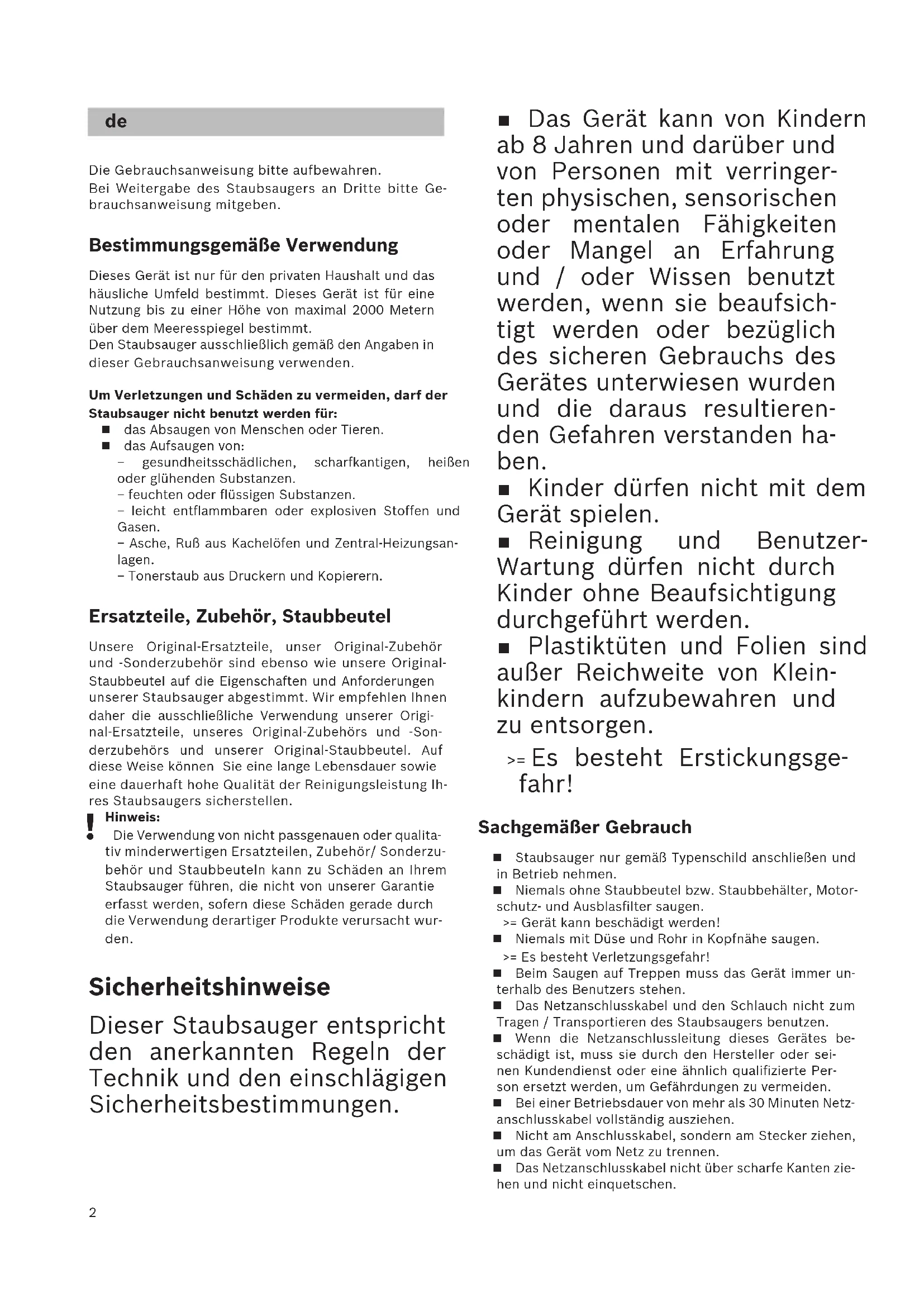 Hinweis: Die Verwendung von nicht passgenauen oder qualita- tiv minderwertigen Ersatzteilen, Zubehör/ Sonderzu- behör und Staubbeuteln kann zu Schäden an Ihrem Staubsauger führen, die nicht von unserer Garantie erfasst werden, sofern diese Schäden gerade durch die Verwendung derartiger Produkte verursacht wur- den. Sicherheitshinweise Dieser Staubsauger entspricht den anerkannten Regeln der Technik und den einschlägigen Sicherheitsbestimmungen. Das Gerät kann von Kindern ab 8 Jahren und darüber und von Personen mit verringer- ten physischen, sensorischen oder mentalen Fähigkeiten oder Mangel an Erfahrung und / oder Wissen benutzt werden, wenn sie beaufsich- tigt werden oder bezüglich des sicheren Gebrauchs des Gerätes unterwiesen wurden und die daraus resultieren- den Gefahren verstanden ha- ben. Kinder dürfen nicht mit dem Gerät spielen. Reinigung und Benutzer- Wartung dürfen nicht durch Kinder ohne Beaufsichtigung durchgeführt werden. Plastiktüten und Folien sind außer Reichweite von Klein- kindern aufzubewahren und zu entsorgen. >= Es besteht Erstickungsge- fahr! Sachgemäßer Gebrauch Staubsauger nur gemäß Typenschild anschließen und in Betrieb nehmen. Niemals ohne Staubbeutel bzw. Staubbehälter, Motor- schutz- und Ausblasfilter saugen. >= Gerät kann beschädigt werden! Niemals mit Düse und Rohr in Kopfnähe saugen. >= Es besteht Verletzungsgefahr! Beim Saugen auf Treppen muss das Gerät immer un- terhalb des Benutzers stehen. Das Netzanschlusskabel und den Schlauch nicht zum Tragen / Transportieren des Staubsaugers benutzen. Wenn die Netzanschlussleitung dieses Gerätes be- schädigt ist, muss sie durch den Hersteller oder sei- nen Kundendienst oder eine ähnlich qualifizierte Per- son ersetzt werden, um Gefährdungen zu vermeiden. Bei einer Betriebsdauer von mehr als 30 Minuten Netz- anschlusskabel vollständig ausziehen. Nicht am Anschlusskabel, sondern am Stecker ziehen, um das Gerät vom Netz zu trennen. Das Netzanschlusskabel nicht über scharfe Kanten zie- hen und nicht einquetschen. de3 Achten Sie darauf, dass der Netzstecker beim automa- tischen Kabeleinzug nicht gegen Personen, Körpertei- le, Tiere oder Gegenstände geschleudert wird. >= Netzanschlusskabel mit Hilfe des Netzsteckers führen. Vor allen Arbeiten am Staubsauger Netzstecker ziehen. Beschädigten Staubsauger nicht in Betrieb nehmen. Beim Vorliegen einer Störung Netzstecker ziehen. Um Gefährdungen zu vermeiden, dürfen Reparaturen und Ersatzteileaustausch am Staubsauger nur vom au- torisierten Kundendienst durchgeführt werden. Staubsauger vor Witterungseinflüssen, Feuchtigkeit und Hitzequellen schützen. Keine brennbaren oder alkoholhaltigen Stoffe auf die Filter (Staubbeutel, Motorschutzfilter, Ausblasfilter etc.) geben. Staubsauger ist für den Baustellenbetrieb nicht geeig- net. >= Einsaugen von Bauschutt kann zur Beschädigung des Gerätes führen. Gerät ausschalten und Netzstecker ziehen, wenn nicht gesaugt wird. Ausgediente Geräte sofort unbrauchbar machen, da- nach das Gerät einer ordnungsgemäßen Entsorgung zuführen.