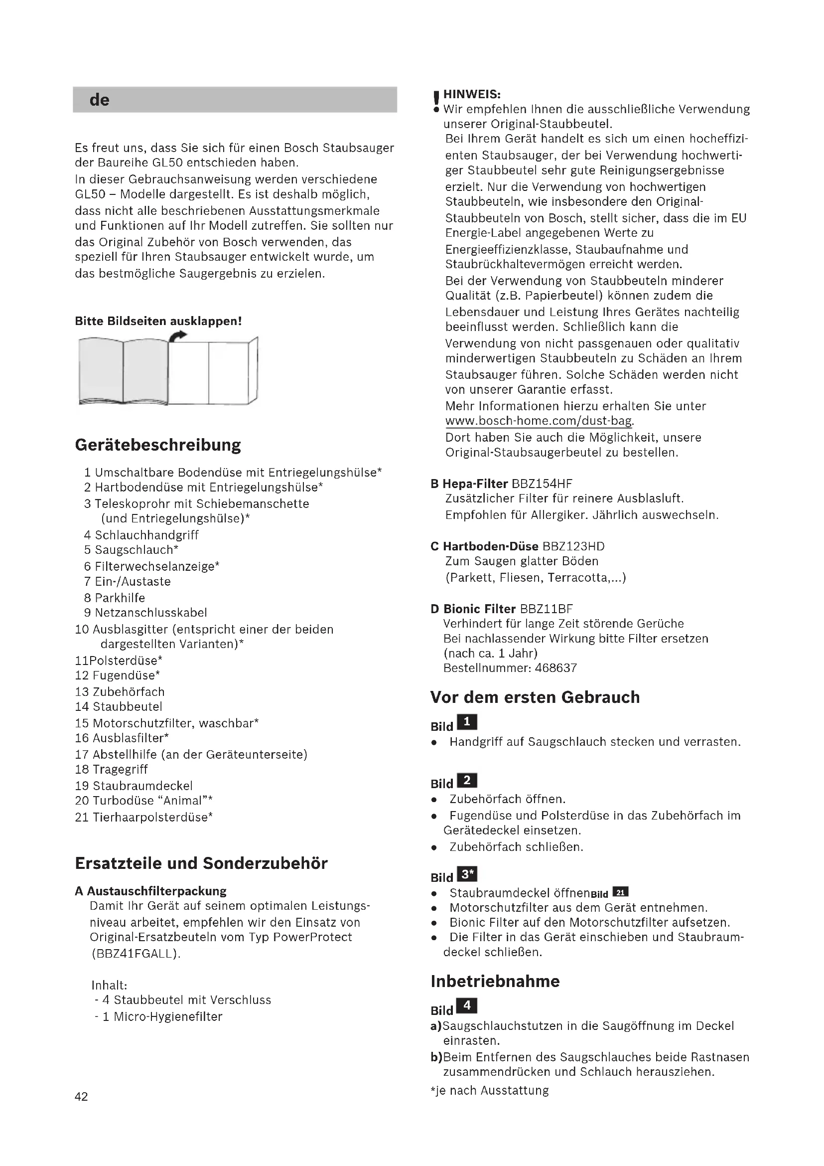 Es freut uns, dass Sie sich für einen Bosch Staubsauger der Baureihe GL50 entschieden haben. In dieser Gebrauchsanweisung werden verschiedene GL50 – Modelle dargestellt. Es ist deshalb möglich, dass nicht alle beschriebenen Ausstattungsmerkmale und Funktionen auf Ihr Modell zutreffen. Sie sollten nur das Original Zubehör von Bosch verwenden, das speziell für Ihren Staubsauger entwickelt wurde, um das bestmögliche Saugergebnis zu erzielen. Bitte Bildseiten ausklappen! Gerätebeschreibung 1 Umschaltbare Bodendüse mit Entriegelungshülse* 2 Hartbodendüse mit Entriegelungshülse* 3 Teleskoprohr mit Schiebemanschette (und Entriegelungshülse)* 4 Schlauchhandgriff 5 Saugschlauch* 6 Filterwechselanzeige* 7 Ein-/Austaste 8 Parkhilfe 9 Netzanschlusskabel 10 Ausblasgitter (entspricht einer der beiden dargestellten Varianten)* 11Polsterdüse* 12 Fugendüse* 13 Zubehörfach 14 Staubbeutel 15 Motorschutzfilter, waschbar* 16 Ausblasfilter* 17 Abstellhilfe (an der Geräteunterseite) 18 Tragegriff 19 Staubraumdeckel 20 Turbodüse “Animal”* 21 Tierhaarpolsterdüse* Ersatzteile und Sonderzubehör A Austauschfilterpackung Damit Ihr Gerät auf seinem optimalen Leistungs- niveau arbeitet, empfehlen wir den Einsatz von Original-Ersatzbeuteln vom Typ PowerProtect (BBZ41FGALL). Inhalt: - 4 Staubbeutel mit Verschluss - 1 Micro-Hygienefilter