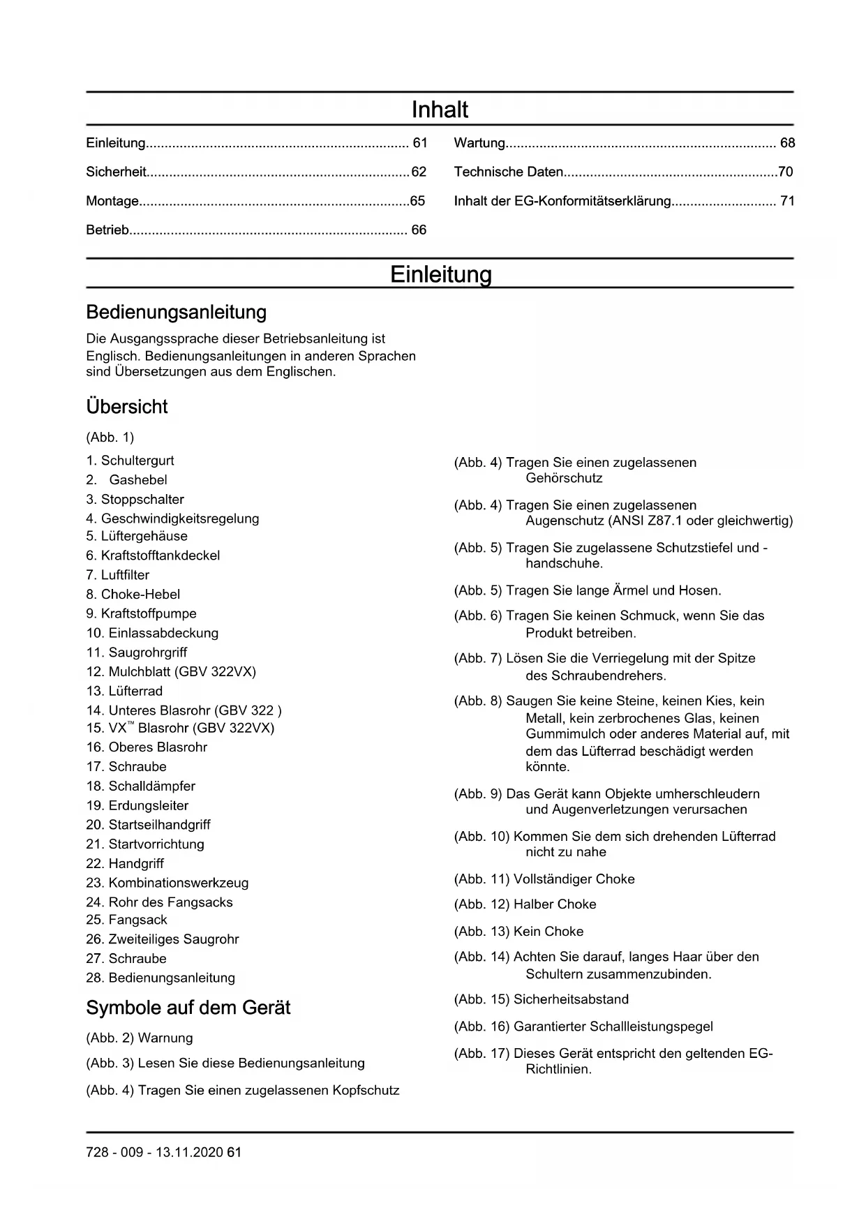 | Wartung | Filter regelm e4 dfig fcberpr fcfen und reinigen, empfohlenes Motor f6l verwenden. |