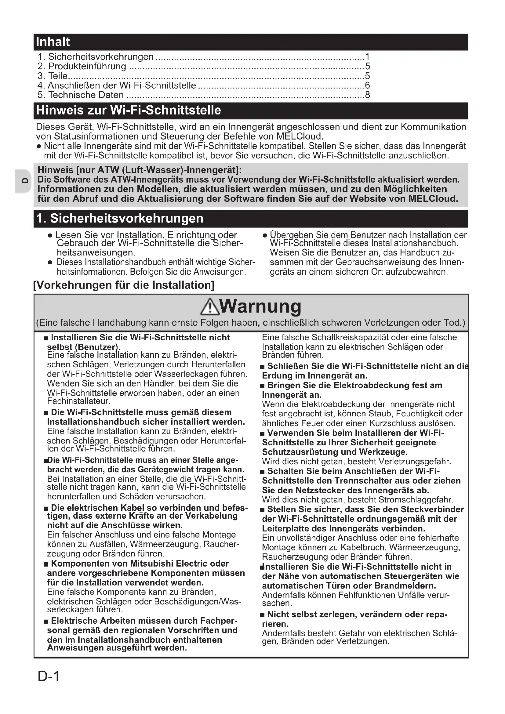 - NichtalleInnengerätesindmitderWi-Fi-Schnittstellekompatibel.StellenSiesicher,dassdasInnengerät mitderWi-Fi-Schnittstellekompatibelist,bevorSieversuchen,dieWi-Fi-Schnittstelleanzuschließen. [Vorkehrungen für die Installation] Warnung (EinefalscheHandhabungkannernsteFolgenhaben,einschließlichschwerenVerletzungenoderTod.) ■ Installieren Sie die Wi-Fi-Schnittstelle nicht selbst (Benutzer).EinefalscheInstallationkannzuBränden,elektri-schenSchlägen,VerletzungendurchHerunterfallenderWi-Fi-SchnittstelleoderWasserleckagenführen.WendenSiesichandenHändler,beidemSiedieWi-Fi-Schnittstelleerworbenhaben,oderaneinenFachinstallateur. ■ Die Wi-Fi-Schnittstelle muss gemäß diesem Installationshandbuch sicher installiert werden.EinefalscheInstallationkannzuBränden,elektri-schenSchlägen,BeschädigungenoderHerunterfal-lenderWi-Fi-Schnittstelleführen. ■Die Wi-Fi-Schnittstelle muss an einer Stelle ange-bracht werden, die das Gerätegewicht tragen kann.BeiInstallationaneinerStelle,diedieWi-Fi-Schnitt-stellenichttragenkann,kanndieWi-Fi-SchnittstelleherunterfallenundSchädenverursachen. ■ Die elektrischen Kabel so verbinden und befes-tigen, dass externe Kräfte an der Verkabelung nicht auf die Anschlüsse wirken.EinfalscherAnschlussundeinefalscheMontagekönnenzuAusfällen,Wärmeerzeugung,Raucher-zeugungoderBrändenführen. ■ Komponenten von Mitsubishi Electric oder andere vorgeschriebene Komponenten müssen für die Installation verwendet werden.EinefalscheKomponentekannzuBränden,elektrischenSchlägenoderBeschädigungen/Was-serleckagenführen. ■ Elektrische Arbeiten müssen durch Fachper-sonal gemäß den regionalen Vorschriften und den im Installationshandbuch enthaltenen Anweisungen ausgeführt werden.EinefalscheSchaltkreiskapazitätodereinefalscheInstallationkannzuelektrischenSchlägenoderBrändenführen. ■ Schließen Sie die Wi-Fi-Schnittstelle nicht an die Erdung im Innengerät an. ■ Bringen Sie die Elektroabdeckung fest am Innengerät an.WenndieElektroabdeckungderInnengerätenichtfestangebrachtist,könnenStaub,FeuchtigkeitoderähnlichesFeuerodereinenKurzschlussauslösen. ■ Verwenden Sie beim Installieren der Wi-Fi-Schnittstelle zu Ihrer Sicherheit geeignete Schutzausrüstung und Werkzeuge.Wirddiesnichtgetan,bestehtVerletzungsgefahr. ■ Schalten Sie beim Anschließen der Wi-Fi-Schnittstelle den Trennschalter aus oder ziehen Sie den Netzstecker des Innengeräts ab.Wirddiesnichtgetan,bestehtStromschlaggefahr. ■ Stellen Sie sicher, dass Sie den Steckverbinder der Wi-Fi-Schnittstelle ordnungsgemäß mit der Leiterplatte des Innengeräts verbinden.EinunvollständigerAnschlussodereinefehlerhafteMontagekönnenzuKabelbruch,Wärmeerzeugung,RaucherzeugungoderBrändenführen. ■ nstallieren Sie die Wi-Fi-Schnittstelle nicht in der Nähe von automatischen Steuergeräten wie automatischen Türen oder Brandmeldern.AndernfallskönnenFehlfunktionenUnfälleverur-sachen. ■ Nicht selbst zerlegen, verändern oder repa-rieren.AndernfallsbestehtGefahrvonelektrischenSchlä-gen,BrändenoderVerletzungen. Hinweis [nur ATW (Luft-Wasser)-Innengerät]: Die Software des ATW-Innengeräts muss vor Verwendung der Wi-Fi-Schnittstelle aktualisiert werden. Informationen zu den Modellen, die aktualisiert werden müssen, und zu den Möglichkeiten für den Abruf und die Aktualisierung der Software nden Sie auf der Website von MELCloud. 1.Sicherheitsvorkehrungen p. 1