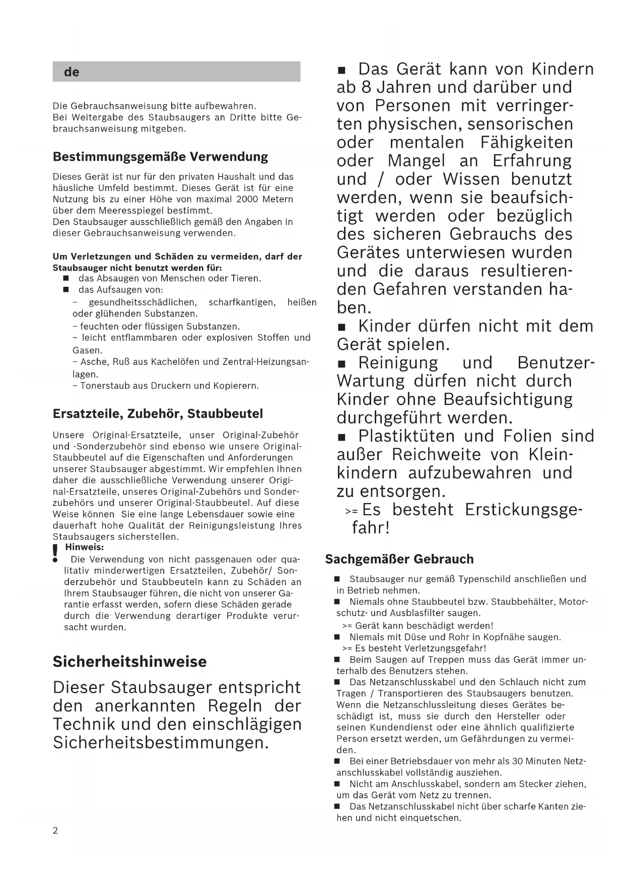 Ԕɚɭɿɩɫɿɡɞɿɤɧԝɫԕɚɥɚɪɵ ...................................................................................................31 ɋɿɡɞɿԙɲɚԙɫɨɪԑɵɲɵԙɵɡ ..............................................................................................1022 Die Gebrauchsanweisung bitte aufbewahren. Bei Weitergabe des Staubsaugers an Dritte bitte Ge-brauchsanweisung mitgeben. Bestimmungsgemäße Verwendung Dieses Gerät ist nur für den privaten Haushalt und das häusliche Umfeld bestimmt. Dieses Gerät ist für eine Nutzung bis zu einer Höhe von maximal 2000 Metern über dem Meeresspiegel bestimmt. Den Staubsauger ausschließlich gemäß den Angaben in dieser Gebrauchsanweisung verwenden.Um Verletzungen und Schäden zu vermeiden, darf der Staubsauger nicht benutzt werden für: das Absaugen von Menschen oder Tieren. das Aufsaugen von: − gesundheitsschädlichen, scharfkantigen, heißen oder glühenden Substanzen. − feuchten oder flüssigen Substanzen. − leicht entflammbaren oder explosiven Stoffen und Gasen. − Asche, Ruß aus Kachelöfen und Zentral-Heizungsan-lagen. − Tonerstaub aus Druckern und Kopierern. Ersatzteile, Zubehör, Staubbeutel Unsere Original-Ersatzteile, unser Original-Zubehör und -Sonderzubehör sind ebenso wie unsere Original-Staubbeutel auf die Eigenschaften und Anforderungen unserer Staubsauger abgestimmt. Wir empfehlen Ihnen daher die ausschließliche Verwendung unserer Origi-nal-Ersatzteile, unseres Original-Zubehörs und Sonder-zubehörs und unserer Original-Staubbeutel. Auf diese Weise können Sie eine lange Lebensdauer sowie eine dauerhaft hohe Qualität der Reinigungsleistung Ihres Staubsaugers sicherstellen. Hinweis: Die Verwendung von nicht passgenauen oder qua-litativ minderwertigen Ersatzteilen, Zubehör/ Son-derzubehör und Staubbeuteln kann zu Schäden an Ihrem Staubsauger führen, die nicht von unserer Ga-rantie erfasst werden, sofern diese Schäden gerade durch die Verwendung derartiger Produkte verur-sacht wurden. Sicherheitshinweise Dieser Staubsauger entspricht den anerkannten Regeln der Technik und den einschlägigen Sicherheitsbestimmungen. Das Gerät kann von Kindern ab 8 Jahren und darüber und von Personen mit verringer- ten physischen, sensorischen oder mentalen Fähigkeiten oder Mangel an Erfahrung und / oder Wissen benutzt werden, wenn sie beaufsich- tigt werden oder bezüglich des sicheren Gebrauchs des Gerätes unterwiesen wurden und die daraus resultieren- den Gefahren verstanden ha- ben. Kinder dürfen nicht mit dem Gerät spielen. Reinigung und Benutzer- Wartung dürfen nicht durch Kinder ohne Beaufsichtigung durchgeführt werden. Plastiktüten und Folien sind außer Reichweite von Klein- kindern aufzubewahren und zu entsorgen. >= Es besteht Erstickungsge- fahr! Sachgemäßer Gebrauch Staubsauger nur gemäß Typenschild anschließen und in Betrieb nehmen. Niemals ohne Staubbeutel bzw. Staubbehälter, Motor-schutz- und Ausblasfilter saugen. >= Gerät kann beschädigt werden! Niemals mit Düse und Rohr in Kopfnähe saugen. >= Es besteht Verletzungsgefahr! Beim Saugen auf Treppen muss das Gerät immer un-terhalb des Benutzers stehen. Das Netzanschlusskabel und den Schlauch nicht zum Tragen / Transportieren des Staubsaugers benutzen. Wenn die Netzanschlussleitung dieses Gerätes be-schädigt ist, muss sie durch den Hersteller oder seinen Kundendienst oder eine ähnlich qualifizierte Person ersetzt werden, um Gefährdungen zu vermei- den. Bei einer Betriebsdauer von mehr als 30 Minuten Netz-anschlusskabel vollständig ausziehen. Nicht am Anschlusskabel, sondern am Stecker ziehen, um das Gerät vom Netz zu trennen. Das Netzanschlusskabel nicht über scharfe Kanten zie-hen und nicht einquetschen. de3 Achten Sie darauf, dass der Netzstecker beim automa- tischen Kabeleinzug nicht gegen Personen, Körpertei- le, Tiere oder Gegenstände geschleudert wird. Netzanschlusskabel mit Hilfe des Netzsteckers führen. Vor allen Arbeiten am Staubsauger Netzstecker zie- hen. Beschädigten Staubsauger nicht in Betrieb nehmen. Beim Vorliegen einer Störung Netzstecker ziehen. Um Gefährdungen zu vermeiden, dürfen Reparaturen und Ersatzteileaustausch am Staubsauger nur vom au- torisierten Kundendienst durchgeführt werden. Staubsauger vor Witterungseinflüssen, Feuchtigkeit und Hitzequellen schützen. Keine brennbaren oder alkoholhaltigen Stoffe auf die Filter (Staubbeutel, Motorschutzfilter, Ausblasfilter etc.) geben. Staubsauger ist für den Baustellenbetrieb nicht geeig- net. >= Einsaugen von Bauschutt kann zur Beschädigung des Gerätes führen. Gerät ausschalten und Netzstecker ziehen, wenn nicht gesaugt wird. Ausgediente Geräte sofort unbrauchbar machen, da- nach das Gerät einer ordnungsgemäßen Entsorgung zuführen.