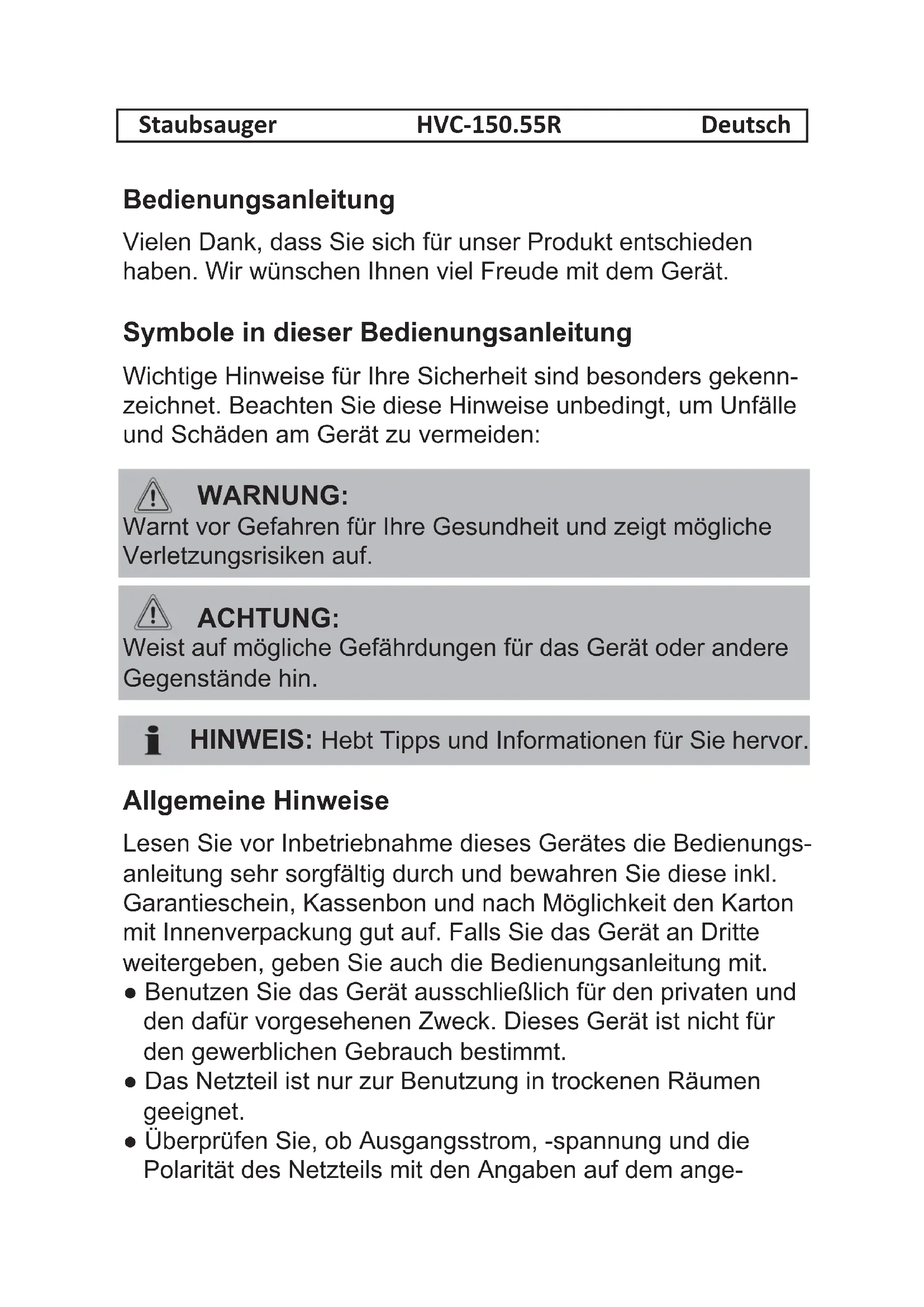 Staubsauger HVC-150.55R Deutsch Bedienungsanleitung Vielen Dank, dass Sie sich für unser Produkt entschieden haben. Wir wünschen Ihnen viel Freude mit dem Gerät. Symbole in dieser Bedienungsanleitung Wichtige Hinweise für Ihre Sicherheit sind besonders gekenn- zeichnet. Beachten Sie diese Hinweise unbedingt, um Unfälle und Schäden am Gerät zu vermeiden: WARNUNG: Warnt vor Gefahren für Ihre Gesundheit und zeigt mögliche Verletzungsrisiken auf. ACHTUNG: Weist auf mögliche Gefährdungen für das Gerät oder andere Gegenstände hin. HINWEIS: Hebt Tipps und Informationen für Sie hervor. Allgemeine Hinweise Lesen Sie vor Inbetriebnahme dieses Gerätes die Bedienungs- anleitung sehr sorgfältig durch und bewahren Sie diese inkl. Garantieschein, Kassenbon und nach Möglichkeit den Karton mit Innenverpackung gut auf. Falls Sie das Gerät an Dritte weitergeben, geben Sie auch die Bedienungsanleitung mit. Benutzen Sie das Gerät ausschließlich für den privaten und den dafür vorgesehenen Zweck. Dieses Gerät ist nicht für den gewerblichen Gebrauch bestimmt. Das Netzteil ist nur zur Benutzung in trockenen Räumen geeignet. Überprüfen Sie, ob Ausgangsstrom, -spannung und die Polarität des Netzteils mit den Angaben auf dem ange-schlossenen Gerät übereinstimmen! Berühren Sie das angeschlossene Netzteil nicht mit feuchten Händen! Zur Reinigung trennen Sie das Gerät ggf. vom Netzteil. Achten Sie darauf, dass das Kabel des Netzteils nicht ge- knickt, eingeklemmt, überfahren wird oder mit Hitzequellen in Berührung kommt. Benutzen Sie kein beschädigtes Netzteil. Reparieren Sie das Gerät nicht selbst, sondern suchen Sie einen autorisierten Fachmann auf. Das Gerät und das Netzkabel müssen regelmäßig auf Zeichen von Beschädigungen untersucht werden. Wird eine Beschädigung festgestellt, darf das Gerät nicht mehr benutzt werden. Verwenden Sie nur Original-Zubehör. Zur Sicherheit Ihrer Kinder lassen Sie keine Verpackungsteile (Plastikbeutel, Karton, Styropor, etc.) erreichbar liegen. WARNUNG: Lassen Sie kleine Kinder nicht mit Folie spielen. Es besteht Erstickungsgefahr! Spezielle Sicherheitshinweise für dieses Gerät Dieses Gerät kann von Kindern ab 8 Jahren und darüber sowie von Personen mit verringerten physischen, sensorischen oder mentalen Fähigkeiten oder Mangel an Erfahrung und Wissen benutzt werden, wenn sie beaufsichtigt werden oder bezüglich des sicheren Gebrauchs des Gerätes unterwiesen wurden und die daraus resultierenden Gefahren verstehen. Kinder dürfen nicht mit dem Gerät spielen.
