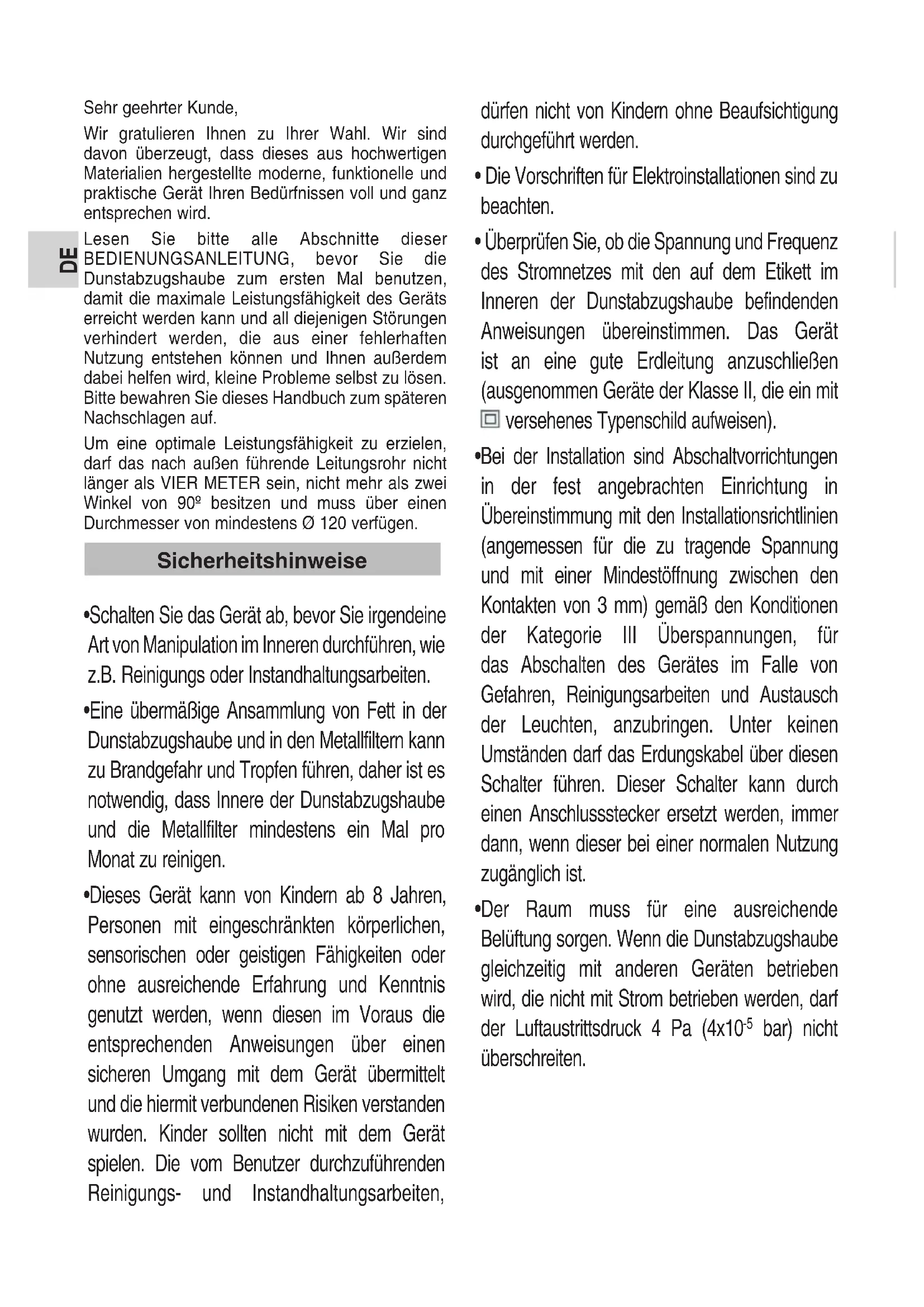 Sehr geehrter Kunde, Wir gratulieren Ihnen zu Ihrer Wahl. Wir sind davon überzeugt, dass dieses aus hochwertigen Materialien hergestellte moderne, funktionelle und praktische Gerät Ihren Bedürfnissen voll und ganz entsprechen wird. Lesen Sie bitte alle Abschnitte dieser BEDIENUNGSANLEITUNG, bevor Sie die Dunstabzugshaube zum ersten Mal benutzen, damit die maximale Leistungsfähigkeit des Geräts erreicht werden kann und all diejenigen Störungen verhindert werden, die aus einer fehlerhaften Nutzung entstehen können und Ihnen außerdem dabei helfen wird, kleine Probleme selbst zu lösen. Bitte bewahren Sie dieses Handbuch zum späteren Nachschlagen auf. Um eine optimale Leistungsfähigkeit zu erzielen, darf das nach außen führende Leitungsrohr nicht länger als VIER METER sein, nicht mehr als zwei Winkel von 90º besitzen und muss über einen Durchmesser von mindestens Ø 120 verfügen.