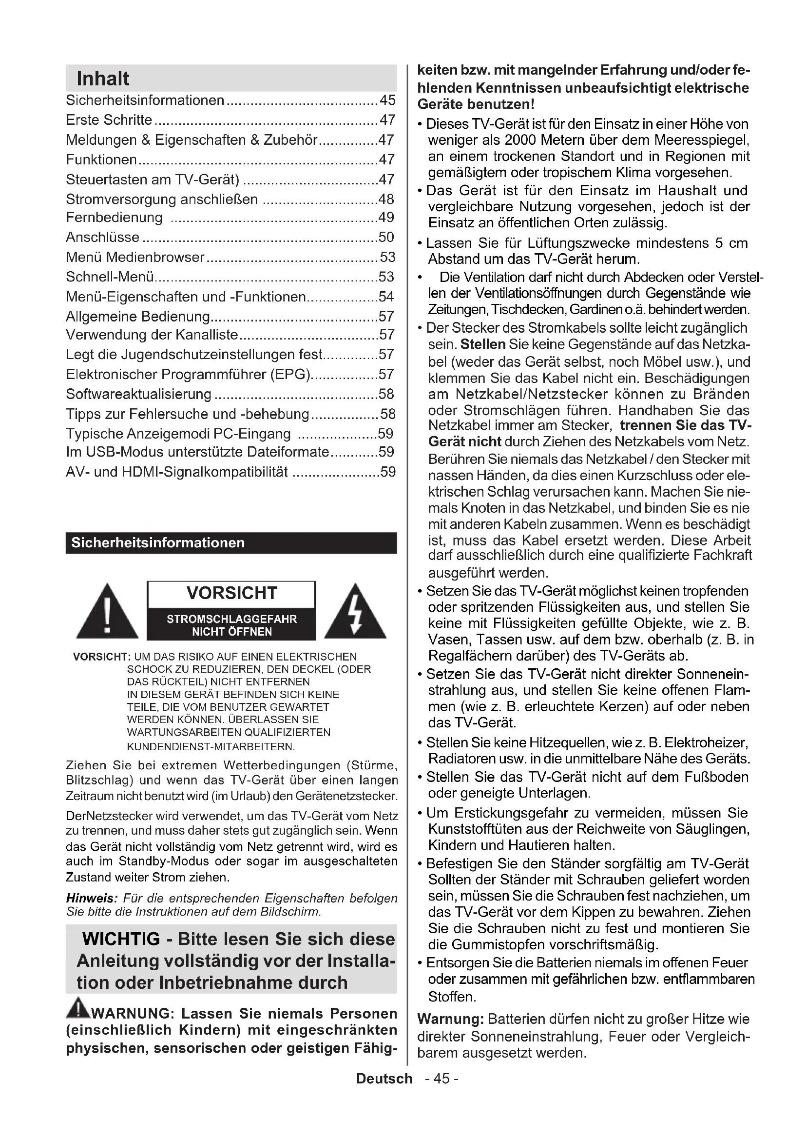 - Klären Sie Ihre Kinder darüber auf, dass es gefährlich ist, auf hohe Möbelstücke zu klettern, um das TV-Gerät oder die Fernbedienung zu erreichen. Wenn Sie Ihr vorhandenes TV-Gerät weiterhin nutzen und an einen neuen Platz stellen, sind die gleichen Vorsichtsmaßnahmen zu beachten.