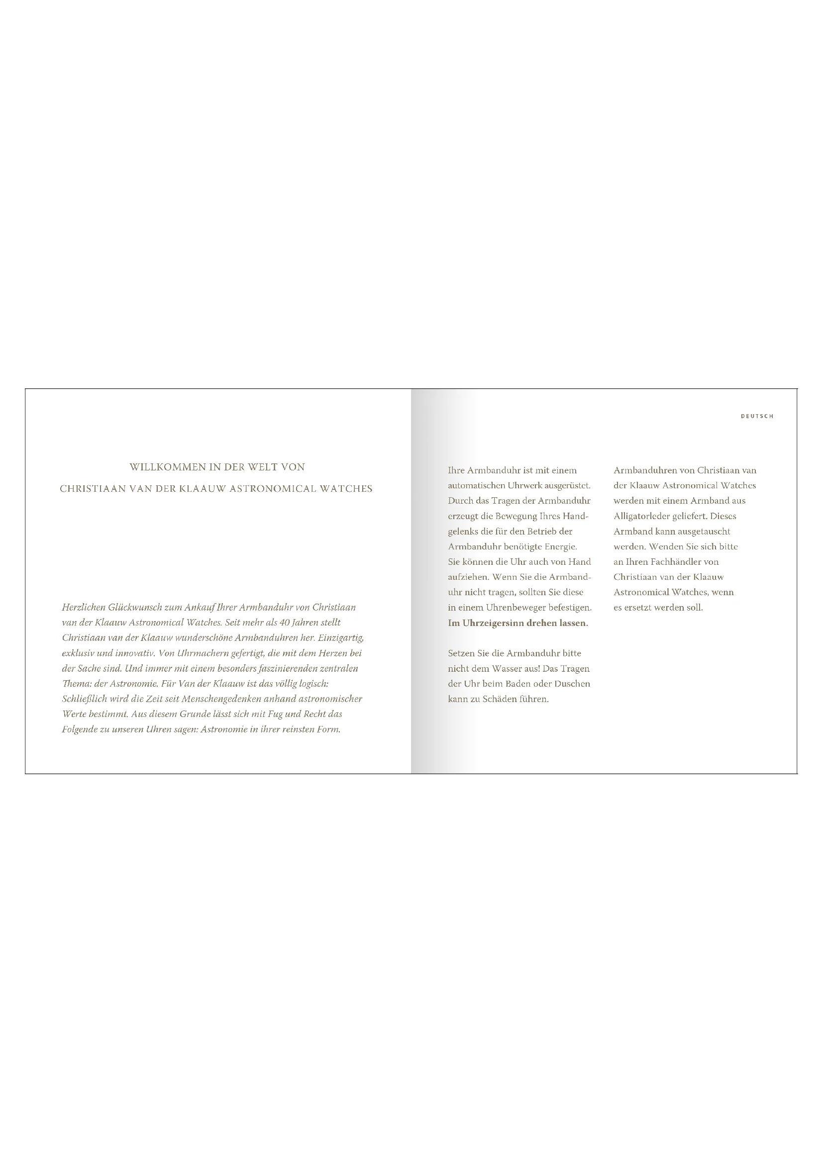 Herzlichen Glückwunsch zum Ankauf Ihrer Armbanduhr von Christiaan van der Klaauw Astronomical Watches. Seit mehr als 40 Jahren stellt Christiaan van der Klaauw wunderschöne Armbanduhren her. Einzigartig, exklusiv und innovativ. Von Uhrmachern gefertigt, die mit dem Herzen bei der Sache sind. Und immer mit einem besonders faszinierenden zentralen Thema: der Astronomie. Für Van der Klaauw ist das völlig logisch: Schließlich wird die Zeit seit Menschengedenken anhand astronomischer Werte bestimmt. Aus diesem Grunde lässt sich mit Fug und Recht das Folgende zu unseren Uhren sagen: Astronomie in ihrer reinsten Form.