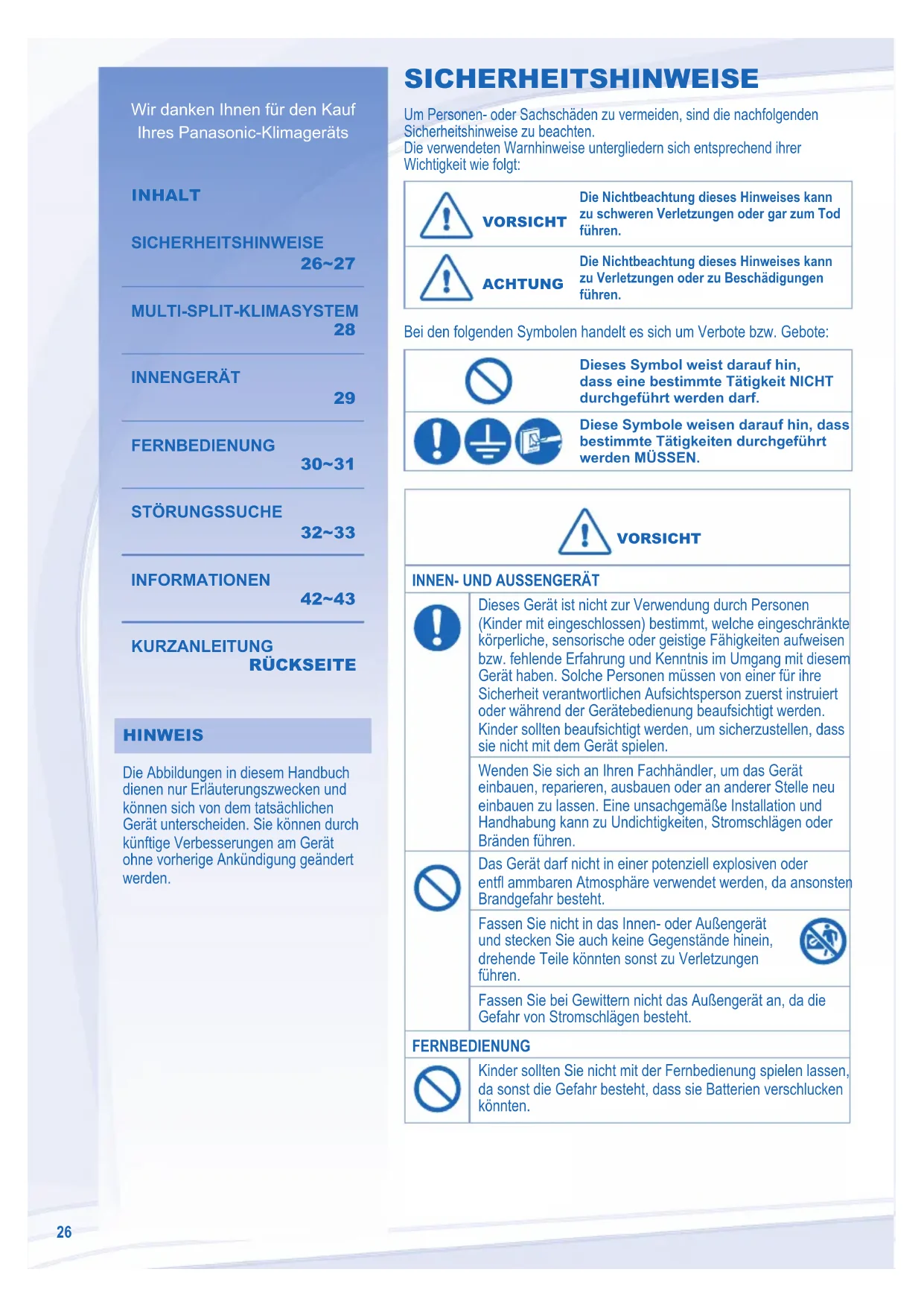Dieses Gerät ist nicht zur Verwendung durch Personen (Kinder mit eingeschlossen) bestimmt, welche eingeschränkte körperliche, sensorische oder geistige Fähigkeiten aufweisen bzw. fehlende Erfahrung und Kenntnis im Umgang mit diesem Gerät haben. Solche Personen müssen von einer für ihre Sicherheit verantwortlichen Aufsichtsperson zuerst instruiert oder während der Gerätebedienung beaufsichtigt werden. Kinder sollten beaufsichtigt werden, um sicherzustellen, dass sie nicht mit dem Gerät spielen. Wenden Sie sich an Ihren Fachhändler, um das Gerät einbauen, reparieren, ausbauen oder an anderer Stelle neu einbauen zu lassen. Eine unsachgemäße Installation und Handhabung kann zu Undichtigkeiten, Stromschlägen oder Bränden führen. Das Gerät darf nicht in einer potenziell explosiven oder entfl ammbaren Atmosphäre verwendet werden, da ansonsten Brandgefahr besteht. Fassen Sie nicht in das Innen- oder Außengerät und stecken Sie auch keine Gegenstände hinein, drehende Teile könnten sonst zu Verletzungen führen. Fassen Sie bei Gewittern nicht das Außengerät an, da die Gefahr von Stromschlägen besteht. FERNBEDIENUNG Kinder sollten Sie nicht mit der Fernbedienung spielen lassen, da sonst die Gefahr besteht, dass sie Batterien verschlucken könnten. Wir danken Ihnen für den Kauf Ihres Panasonic-Klimageräts INHALT INHALT SICHERHEITSHINWEISE 26~27 MULTI-SPLIT-KLIMASYSTEM