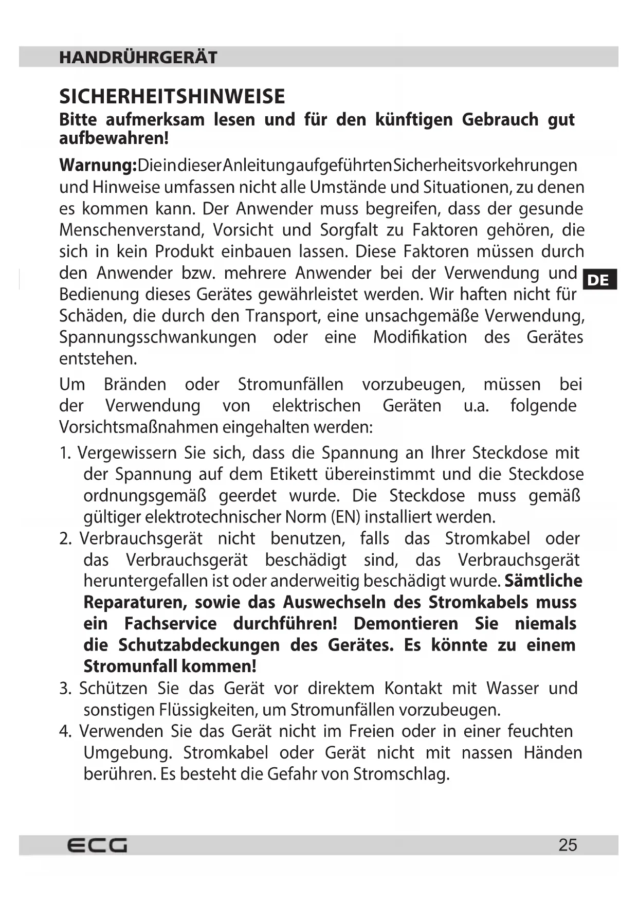 Verpackungspapier und Wellpappe – zum Altpapier geben. Verpackungsfolie, PET-Beutel, Plastikteile – in den Sammelcontainer für Plastik. ENTSORGUNG DES PRODUKTES NACH ABLAUF DER LEBENSDAUER Die Entsorgung der verwendeten elektrischen und elektronischen Geräte (gültig in den Mitgliedsländern der EU und weiteren europäischen Ländern mit dem eingeführten System der Abfalltrennung) Das abgebildete Symbol auf dem Produkt oder auf der Verpackung bedeutet, dass das Produkt nicht als Hausmüll abgegeben werden soll. Das Produkt geben Sie an einem Ort ab, der für das Recycling von elektrischen und elektronischen Geräten bestimmt ist. Die richtige Entsorgung des Produktes schützt Sie vor negativen Einüssen auf die menschliche Gesundheit und des Lebensraumes. Das Recycling des Materials trägt zum Schutz der Naturressourcen bei. Mehr Informationen über das Recycling dieses Produktes gibt Ihnen die Kommunalbehörde, Organisationen für die Bearbeitung von Hausabfall oder die Verkaufsstelle, in der Sie das Produkt erworben haben. Dieses Produkt erfüllt die Anforderung der EU-Richtlinien über elektromagnetische Kompatibilität und elektrische Sicherheit. Bedienungsanleitung s. www.ecg-electro.eu. Eine Änderung des Textes und der technischen Parameter vorbehalten. 08/05HAND MIXER