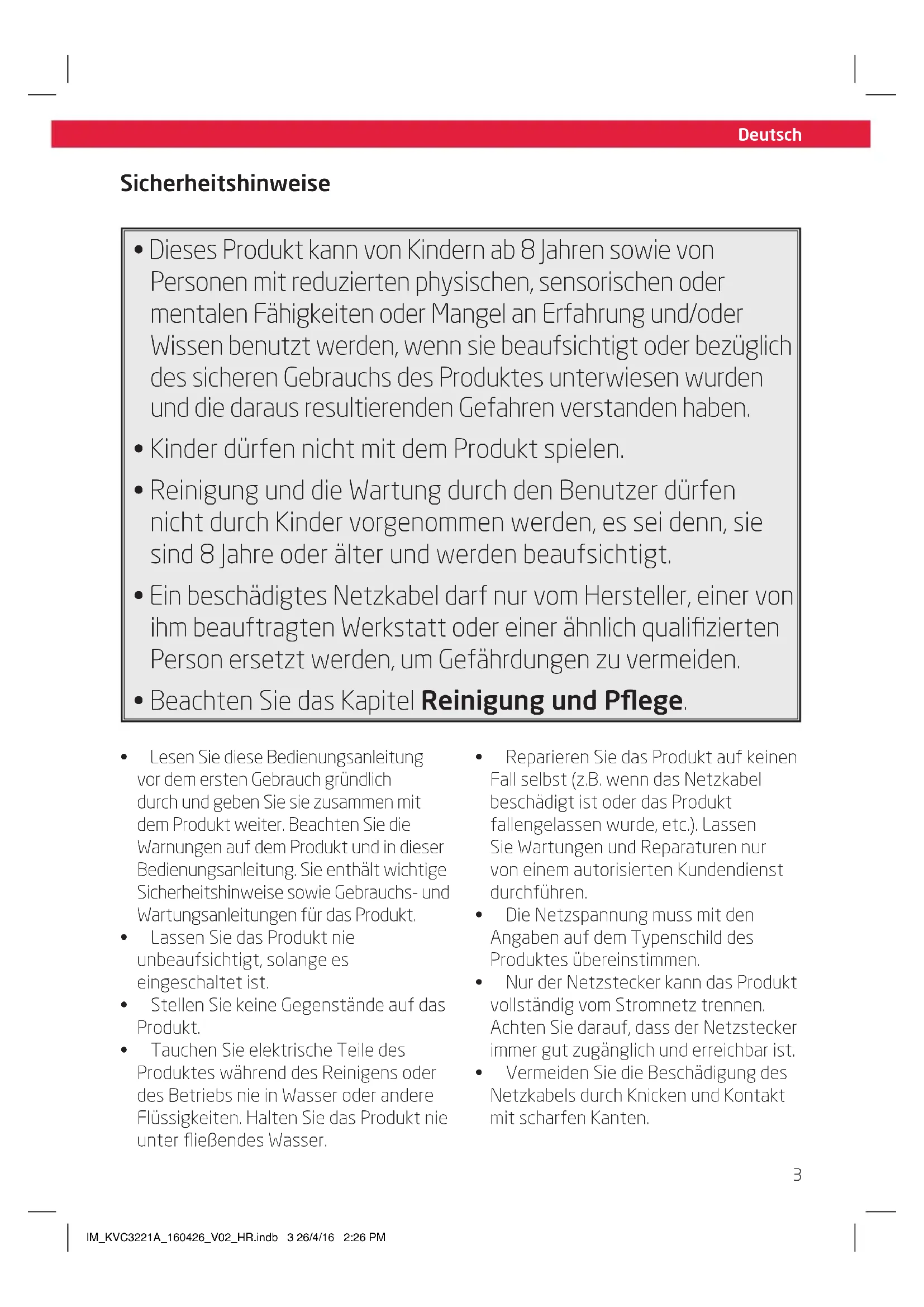 - Vermeiden Sie die Beschädigung des Netzkabels durch Knicken und Kontakt mit scharfen Kanten. IM_KVC3221A_160426_V02_HR.indb 3 26/4/16 2:26 PMDeutsch