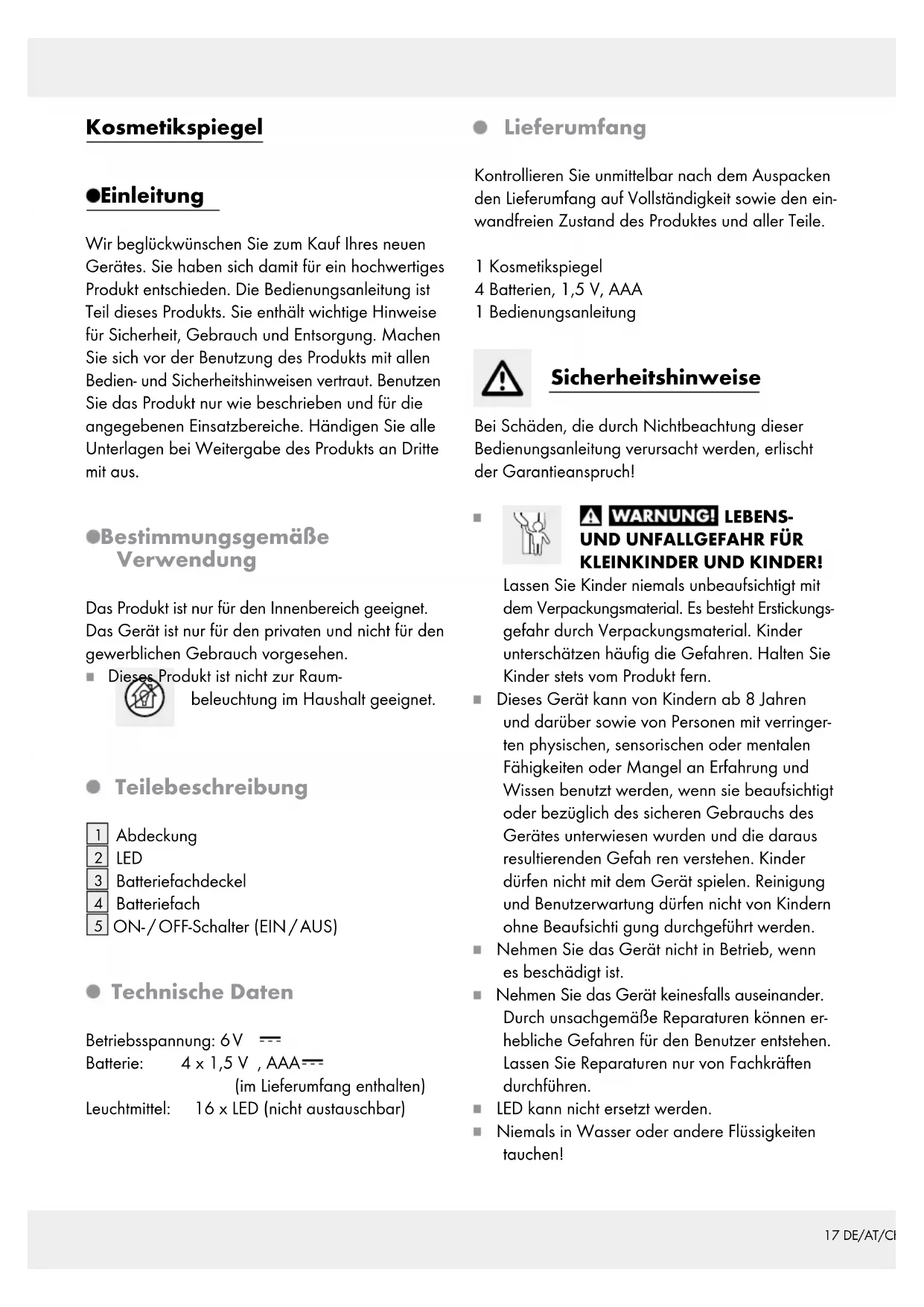 ON- / OFF-Schalter (EIN / AUS) Technische Daten Betriebsspannung: 6 V Batterie: 4 x 1,5 V , AAA (im Lieferumfang enthalten) Leuchtmittel: 16 x LED (nicht austauschbar) Lieferumfang Kontrollieren Sie unmittelbar nach dem Auspacken den Lieferumfang auf Vollständigkeit sowie den ein- wandfreien Zustand des Produktes und aller Teile. 1 Kosmetikspiegel 4 Batterien, 1,5 V, AAA 1 Bedienungsanleitung Sicherheitshinweise Bei Schäden, die durch Nichtbeachtung dieser Bedienungsanleitung verursacht werden, erlischt der Garantieanspruch! LEBENS-