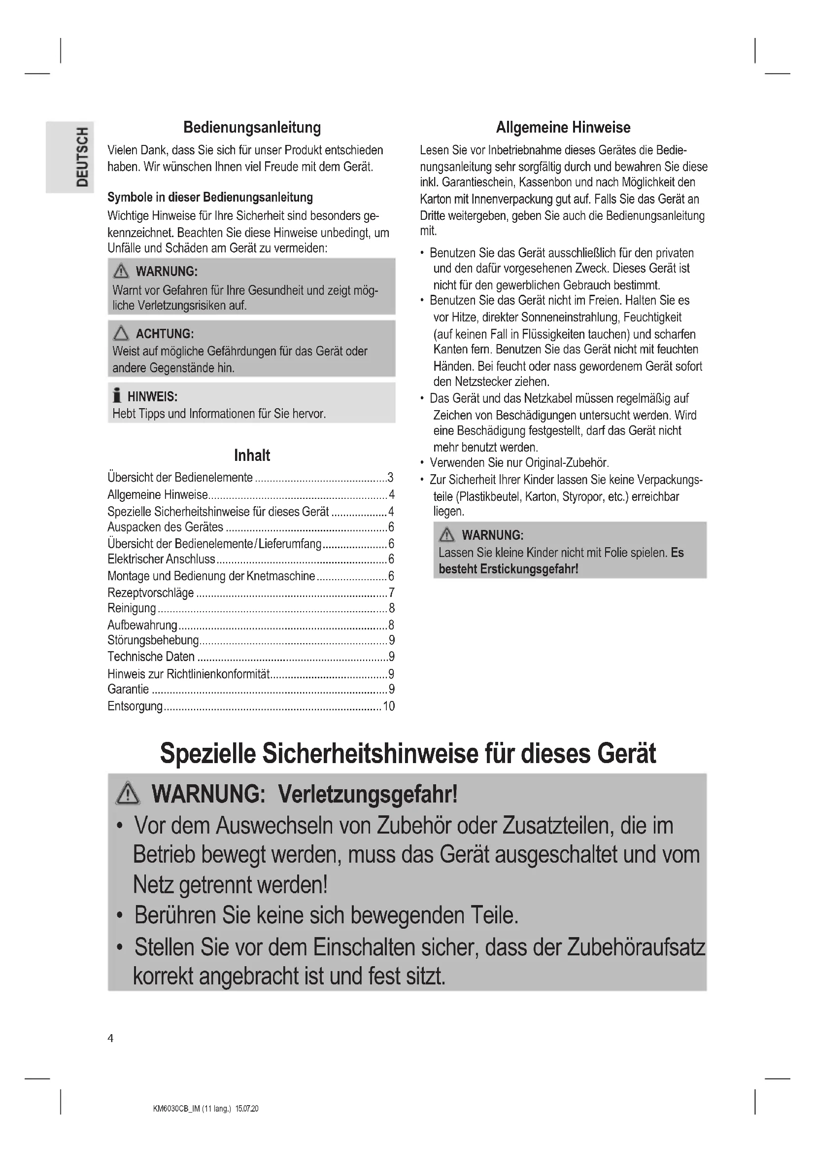 - Verarbeiten Sie mit der Maschine nur Lebensmittel. Der Miss- brauch zu anderen Zwecken kann Verletzungen zur Folge haben.KM6030CB_IM (11 lang.) 15.07.20